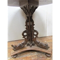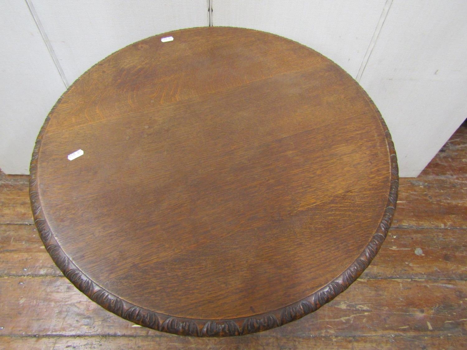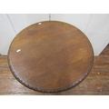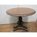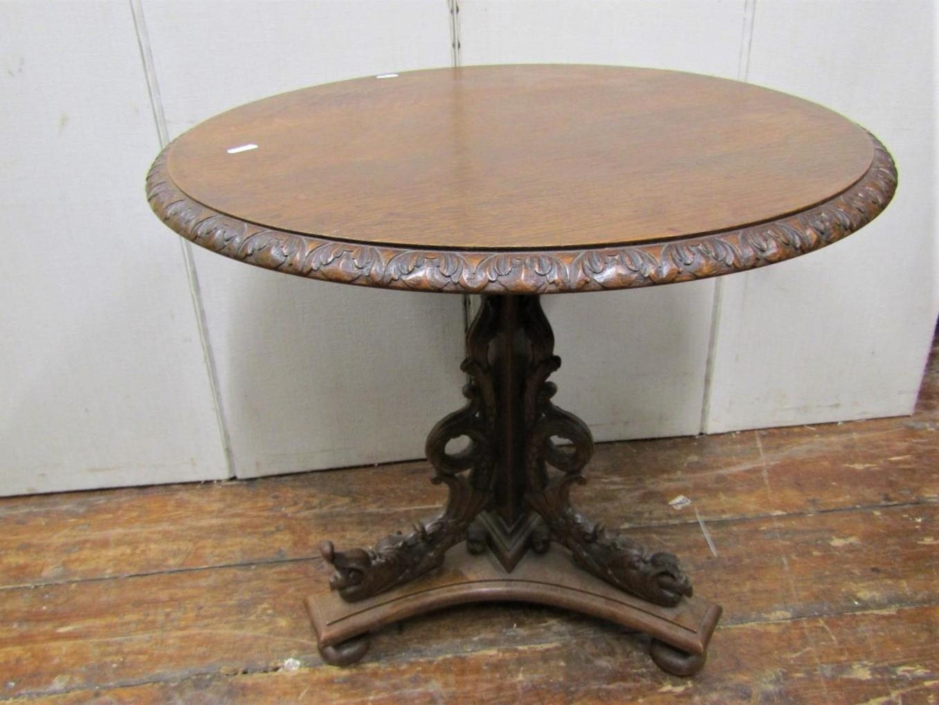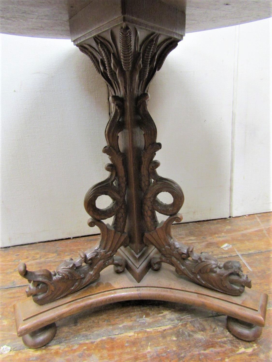 A mid Victorian period oak occasional table, the circular top 65cm diameter, raised on a tri-corn column and platform base, with carved and pierced whimsical grotesque fish supports, bull rushes, etc