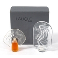A Modern Lalique Glass Cachet, in the 'Naiade' pattern in clear and frosted finish, designed with a mermaid, raised on circular plinth (boxed), stencil mark, 9.5cm high and an 'Ondines' perfume bottle and stopper. (3)