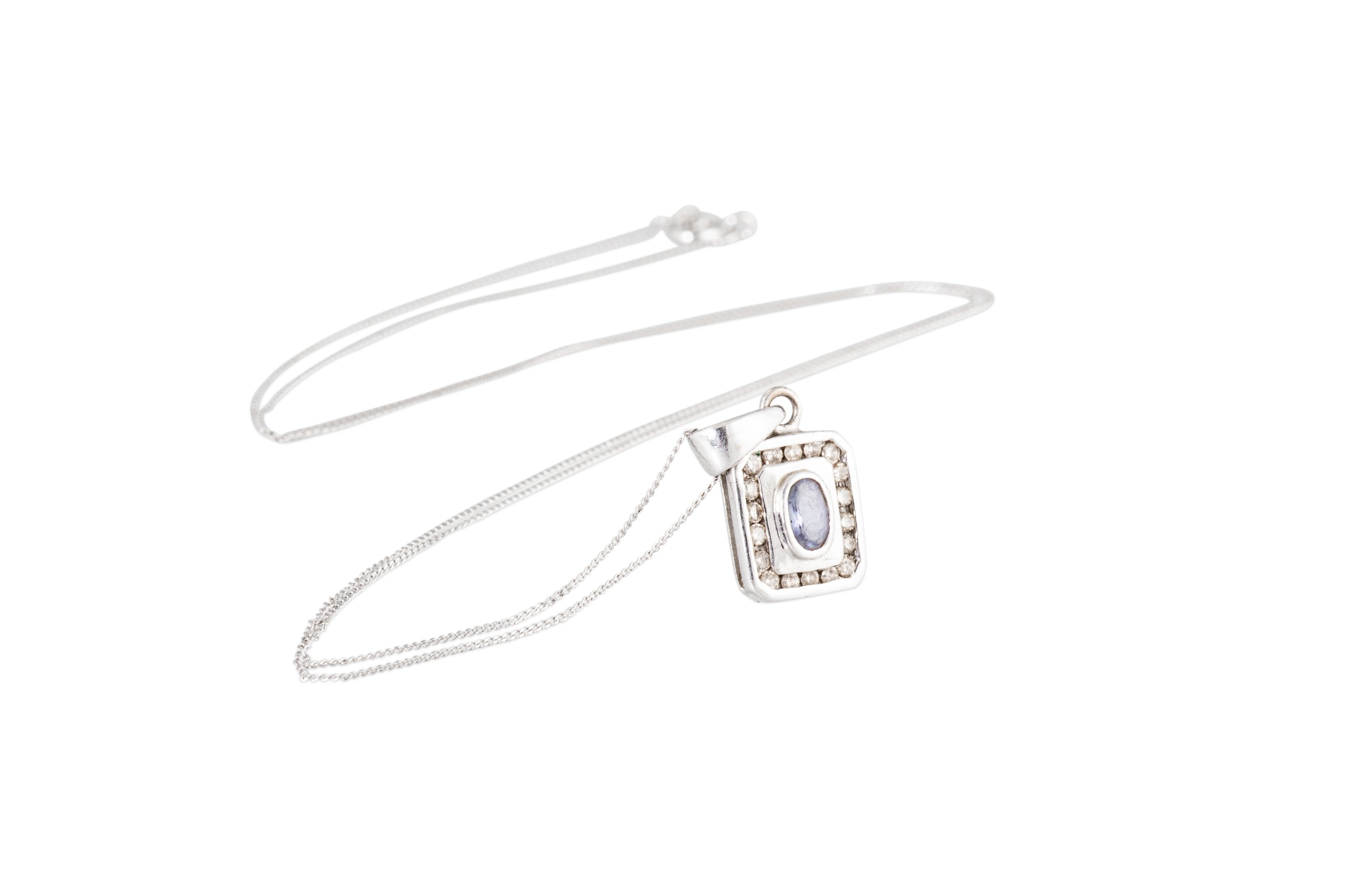 A TANZANITE AND DIAMOND SET PENDANT, the central oval tanzanite to diamond set surround mounted in 9ct white gold to a 9ct white gold chain