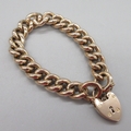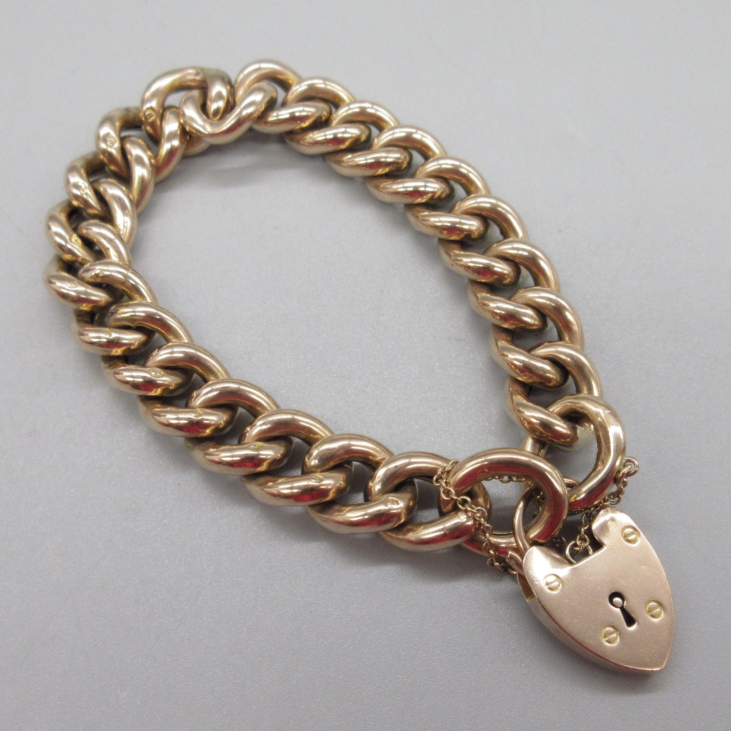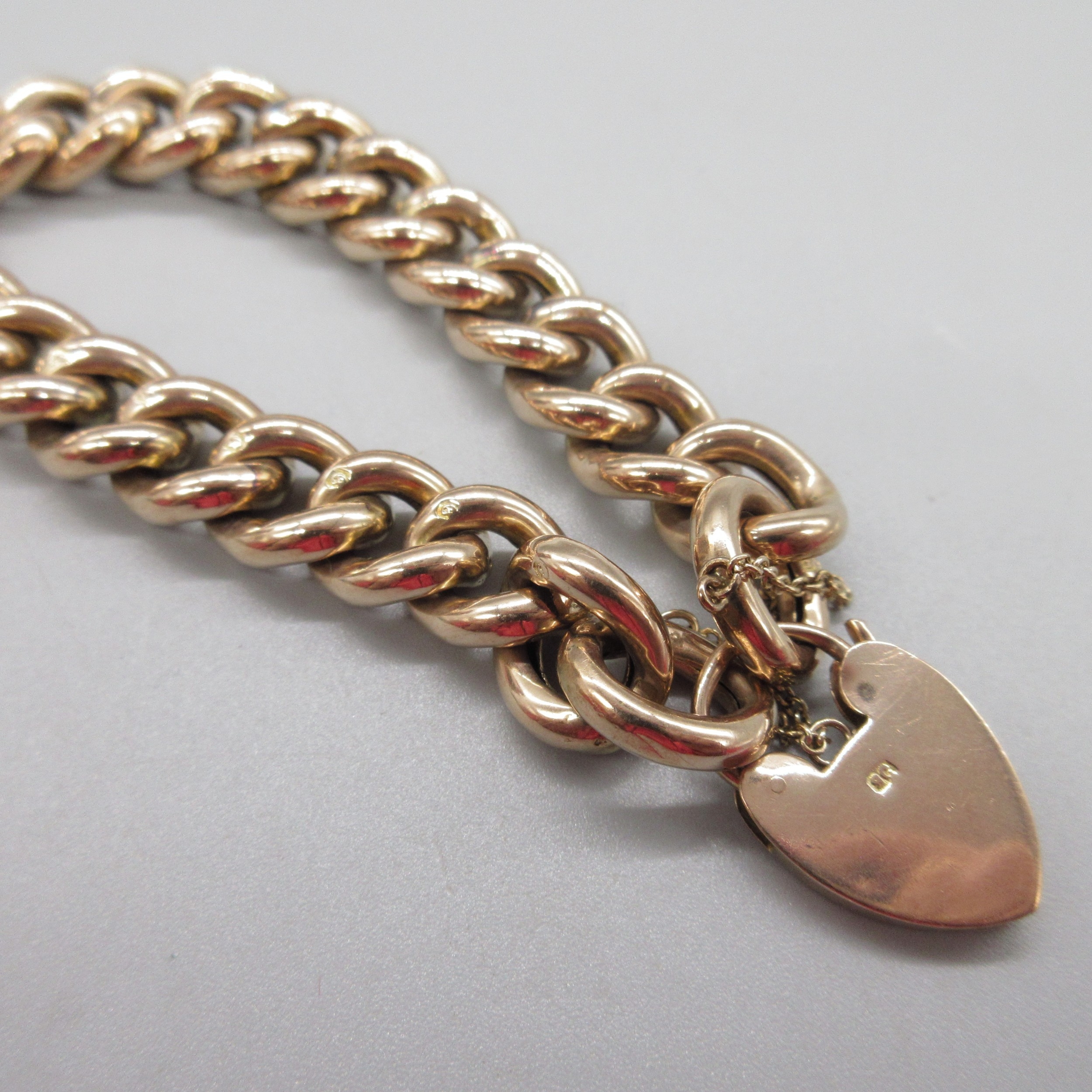 9ct rose gold curb link bracelet with heart padlock, lock and links stamped 9c, 27.0g