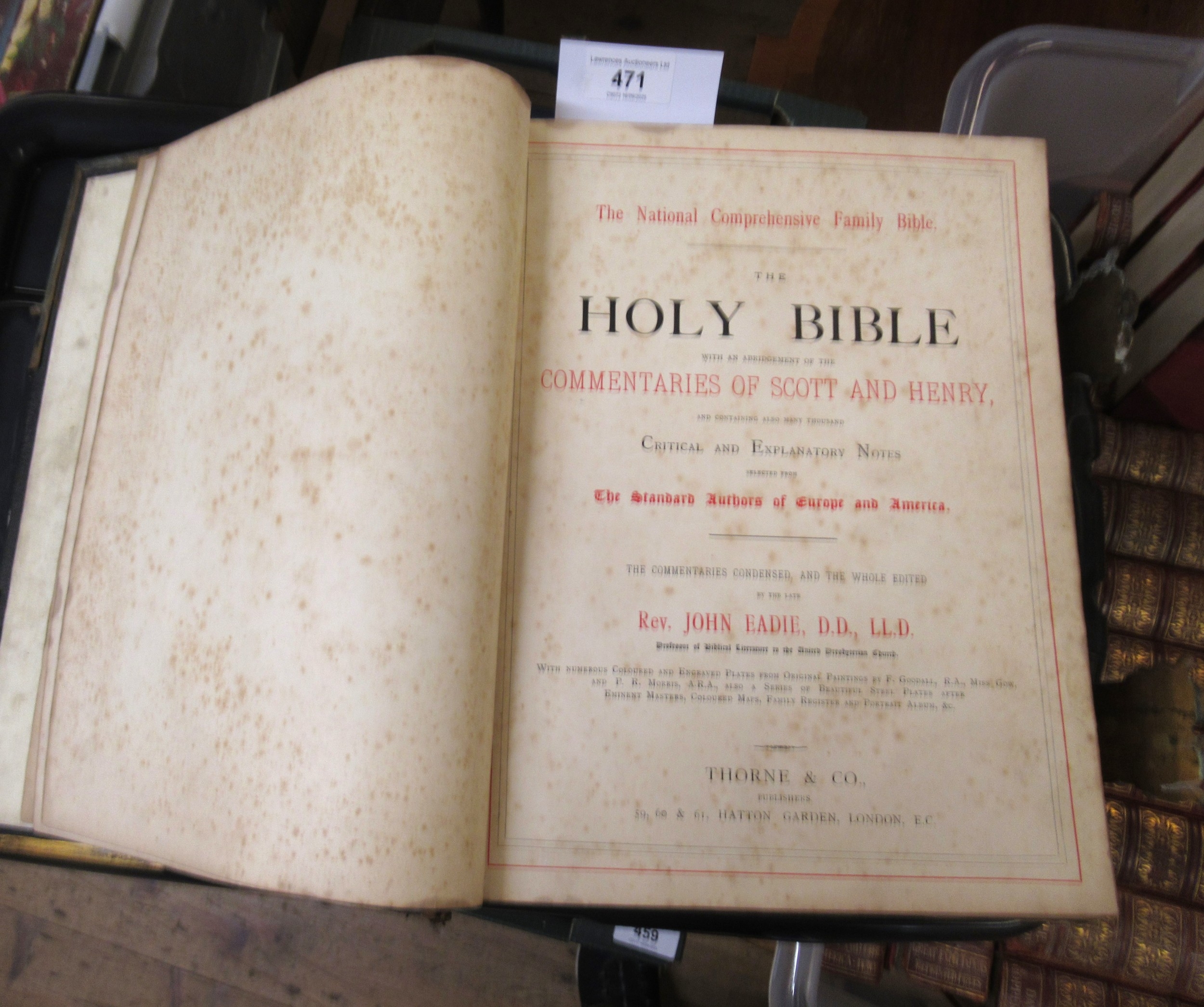 19th Century leather bound and gilt metal clasped family bible printed Hatton Garden, London, with family inscriptions for Anstiss, Fulham, 1888 onwards