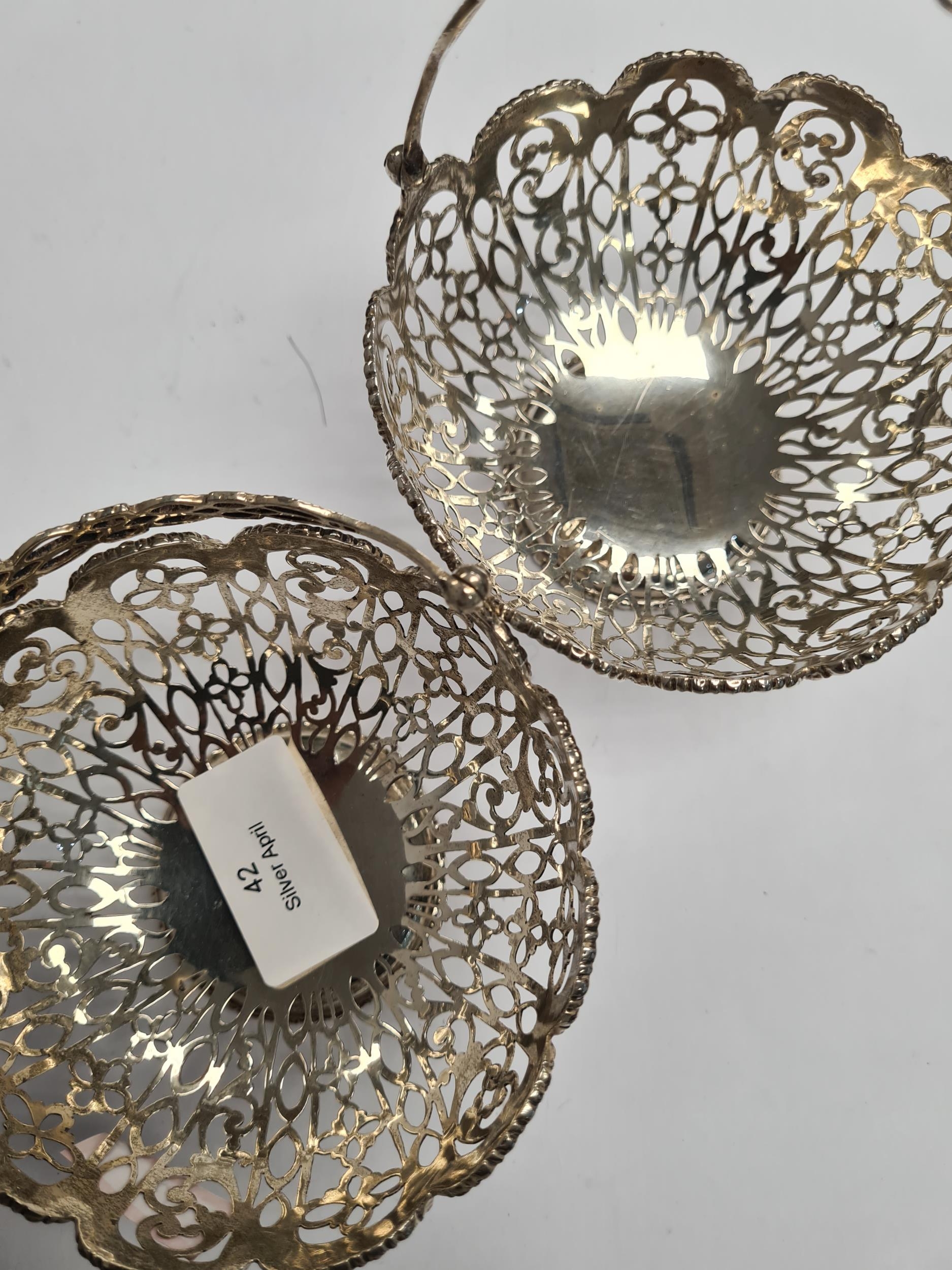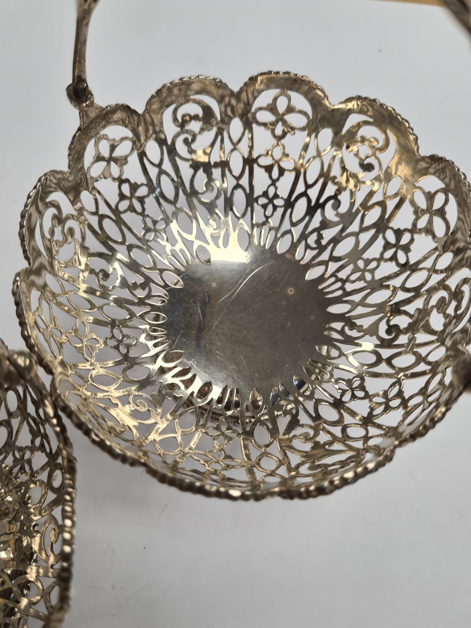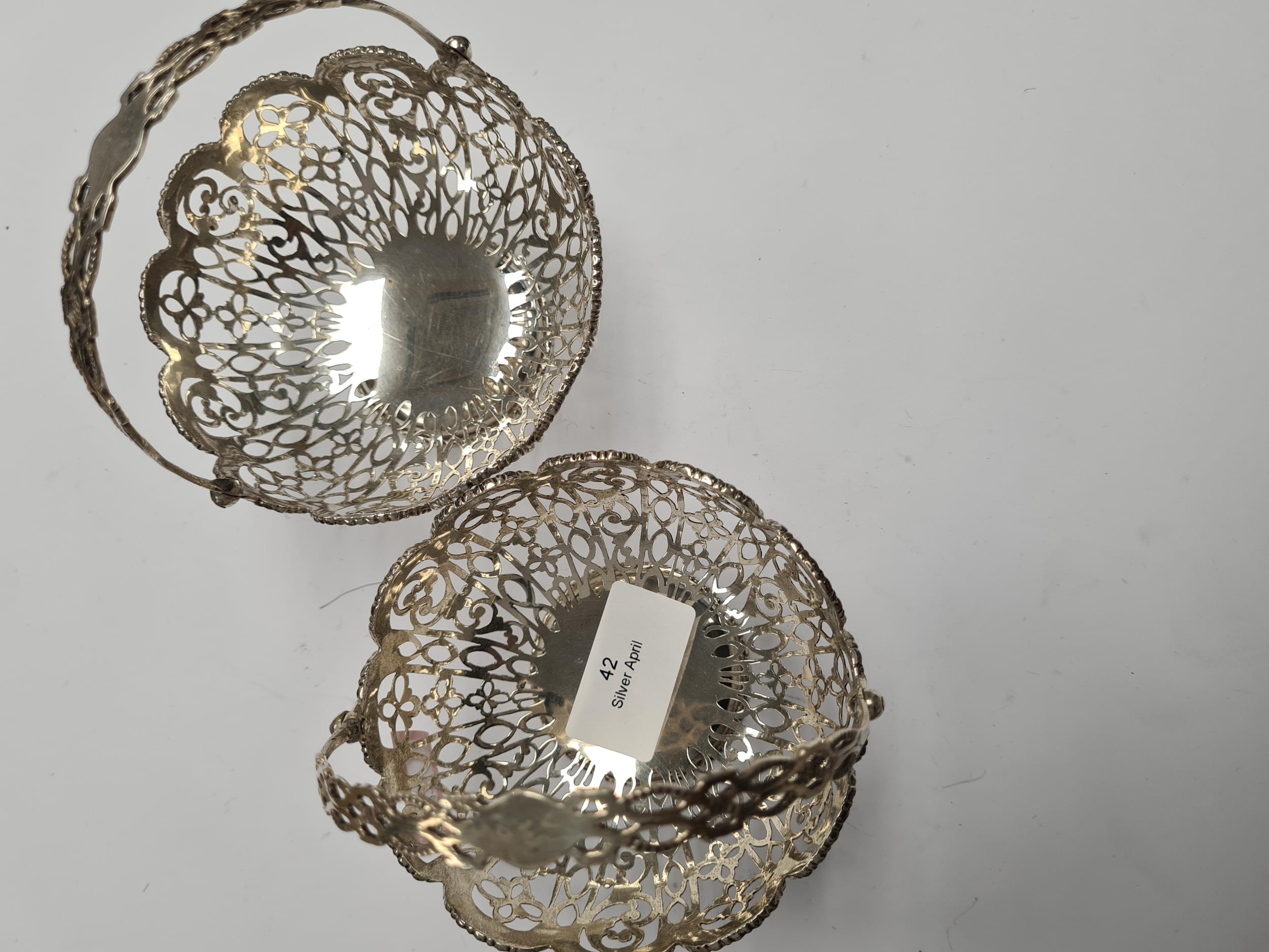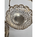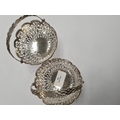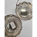 A pair of very ornate silver bon bon dishes with pierced handle and pretty floreated pierced body. Beaded borders. Hallmarked Birmingham 1910, George Nathan and Ridley Heys. 6.20ozt approx. Condition Report: no obvious damage seen.