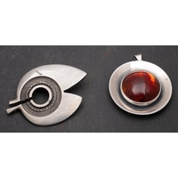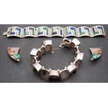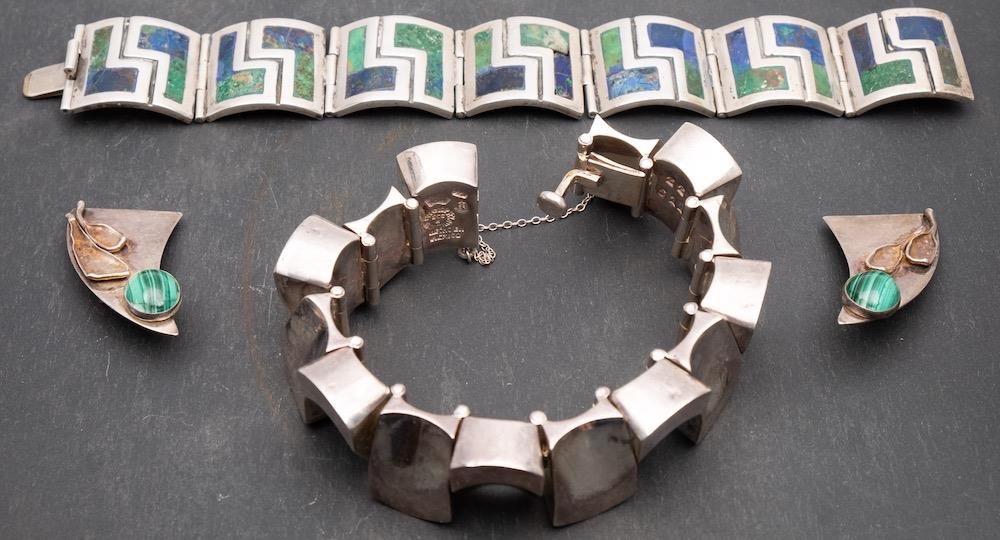 Two Mexican bracelets and a pair of ear clips, including a bracelet of concave links, length ca. 17cm; a bracelet of geometric design, inlaid with green and blue stone, length ca. 19cm, and a pair of malachite ear clips, length ca. 4.5cm, all stamped '925', total weight ca. 236gms.