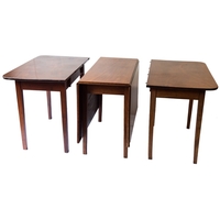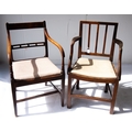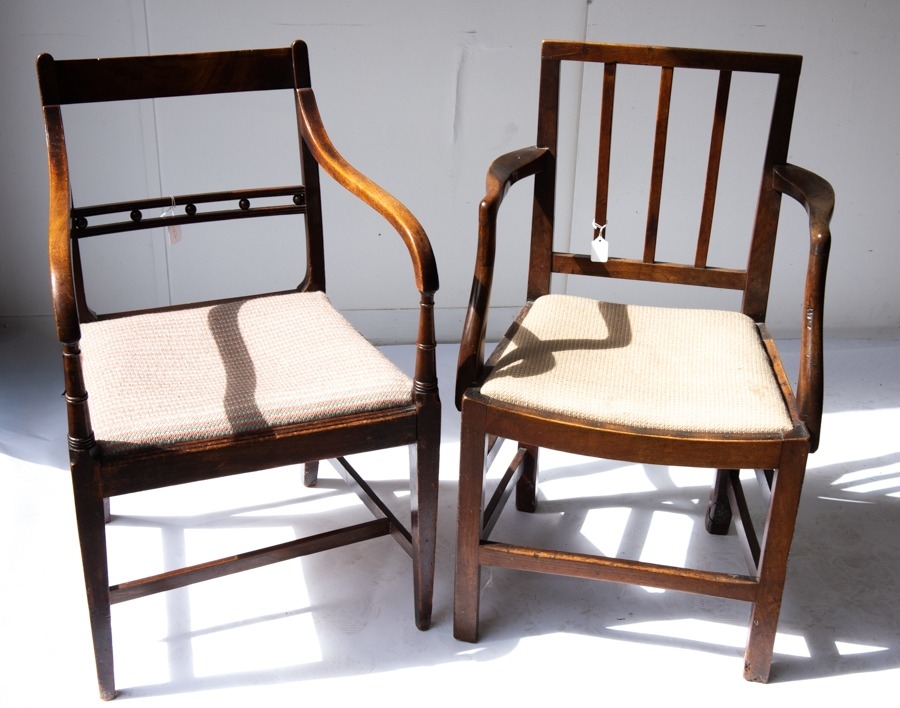 TWO EARLY NINETEENTH CENTURY MAHOGANY CARVER ARMCHAIRS, one with flame cut top rail, cannon ball horizontal splat and square, tapering front legs, the other with three vertical splats to the square back and heavy, square legs tied by stretchers, (2)