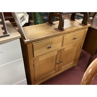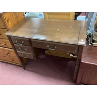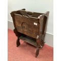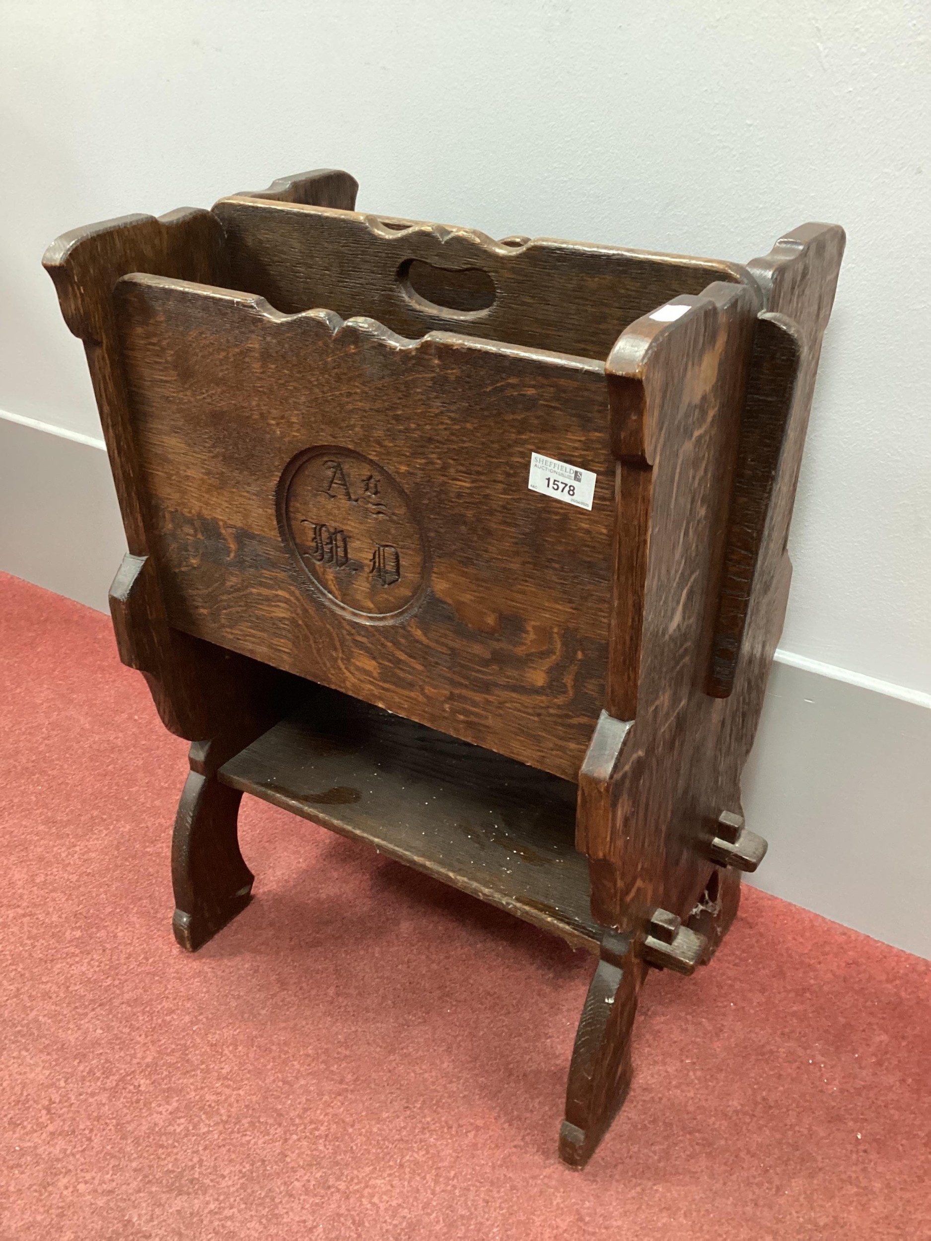 XX Century Oak Magazine Stand, with a carrying handle, two divisions, carved initials A.M.D, shaped sides, 40cm wide.