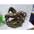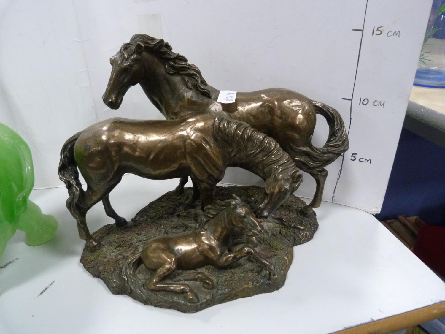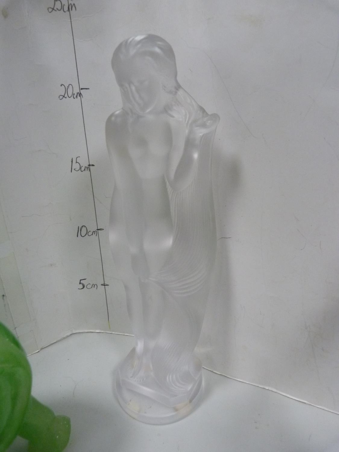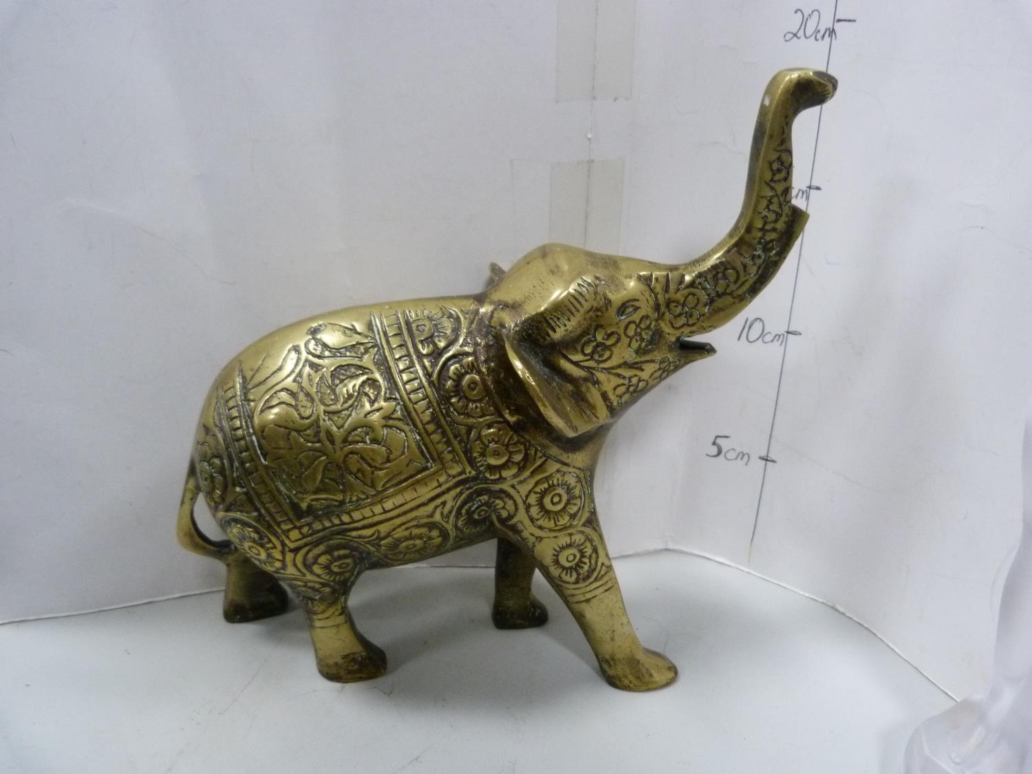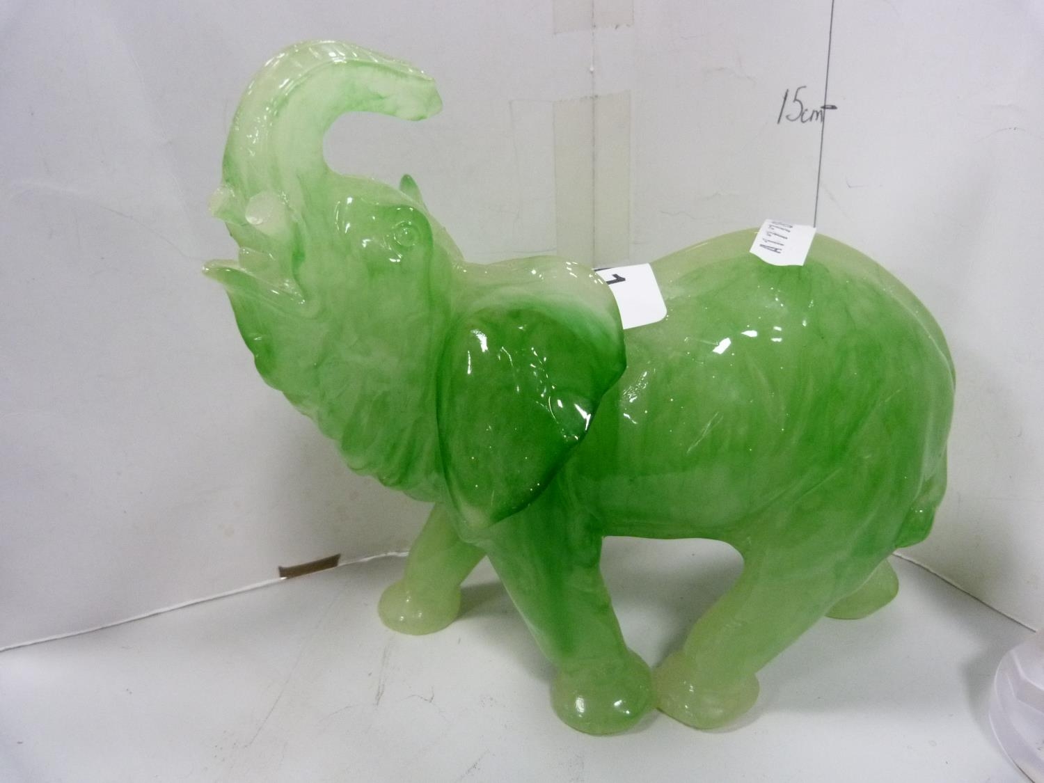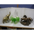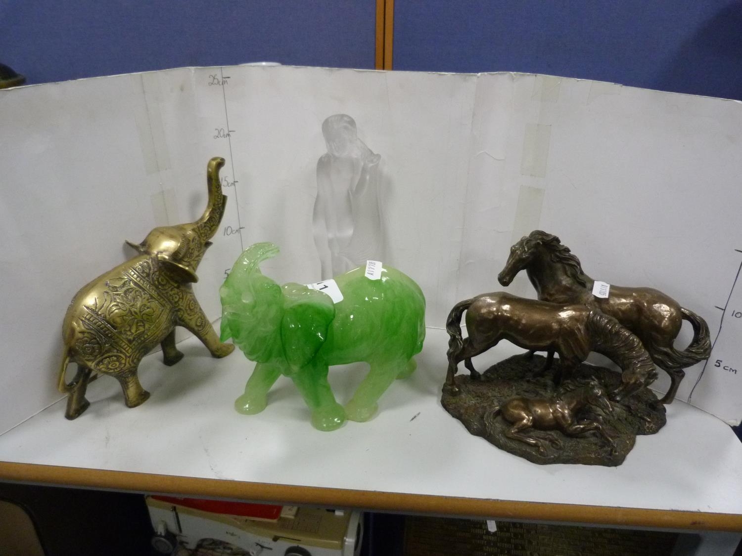 Green quartz glass model of an elephant, Indian brass elephant figure, modern glass figure of nude female, signed indistinctly and a horse figure group. (4)
