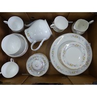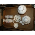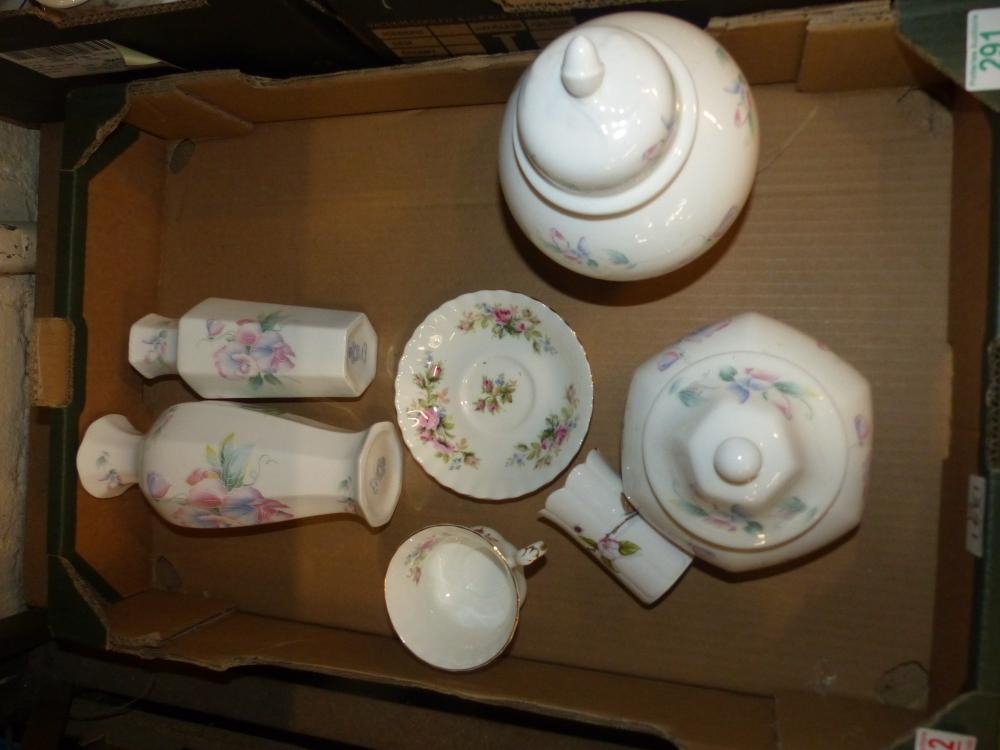 A collection of ceramics to include Aynsley Little Sweetheart vases, two lidded jars and Royal Albert Moss Rose teacup and saucer. (1 Tray)