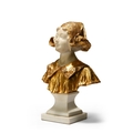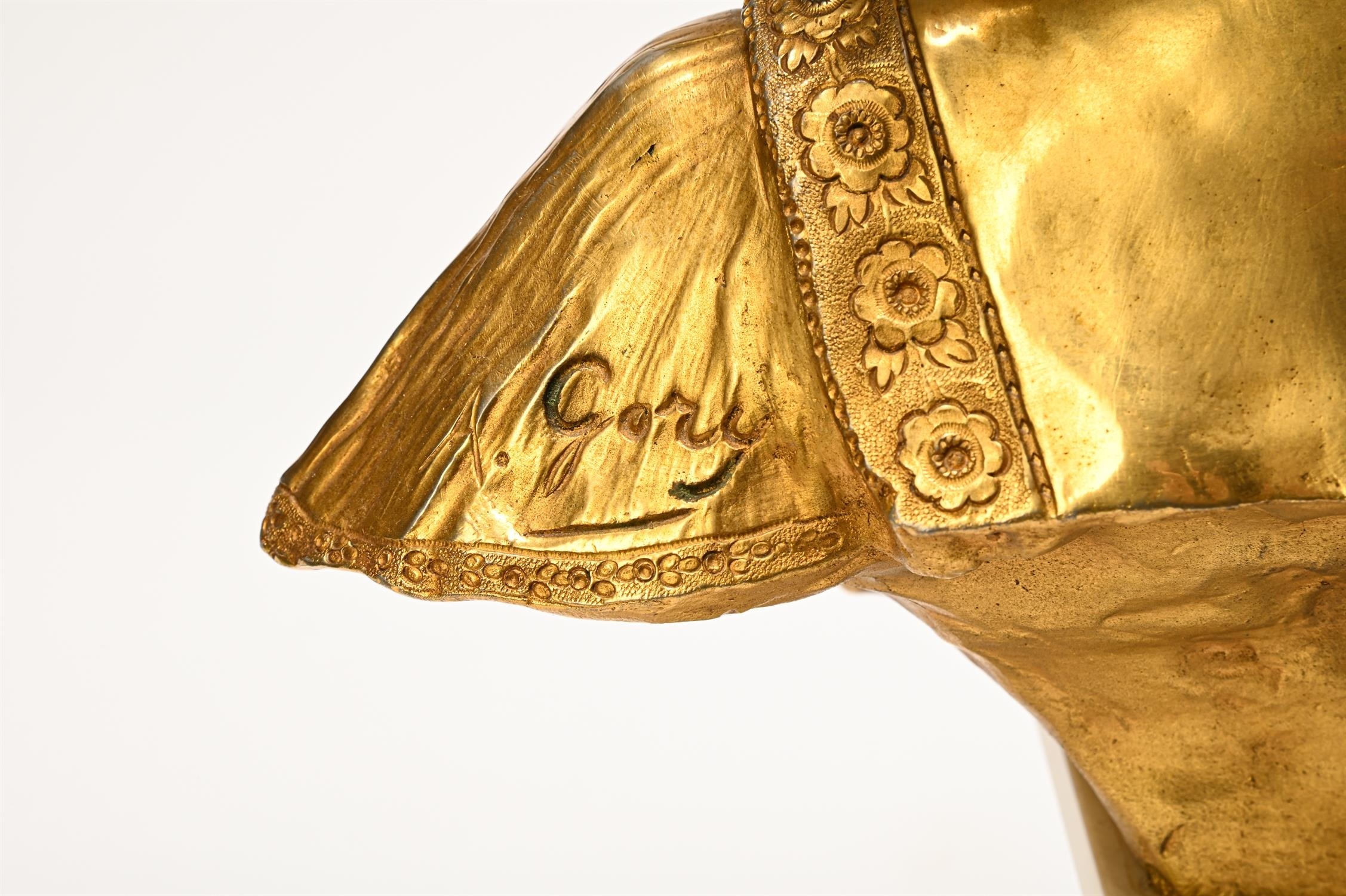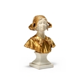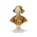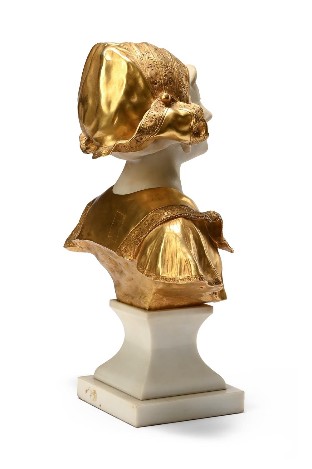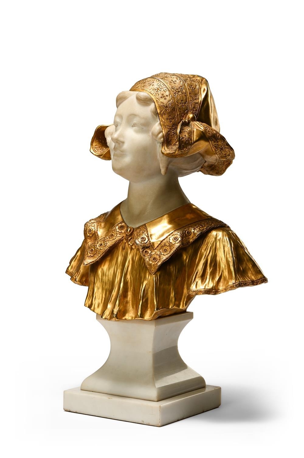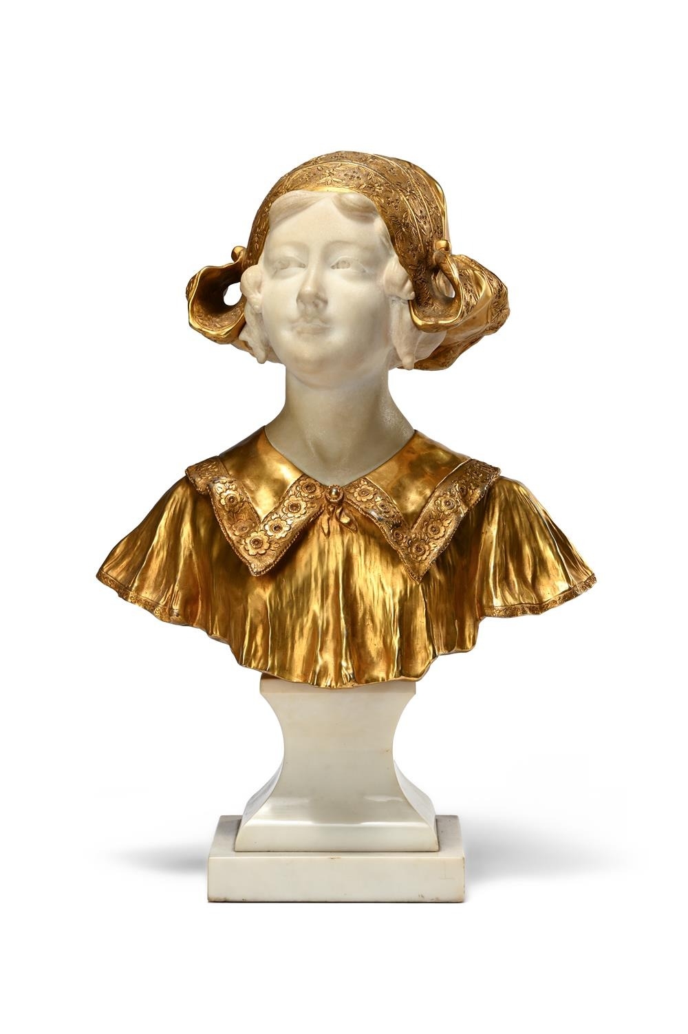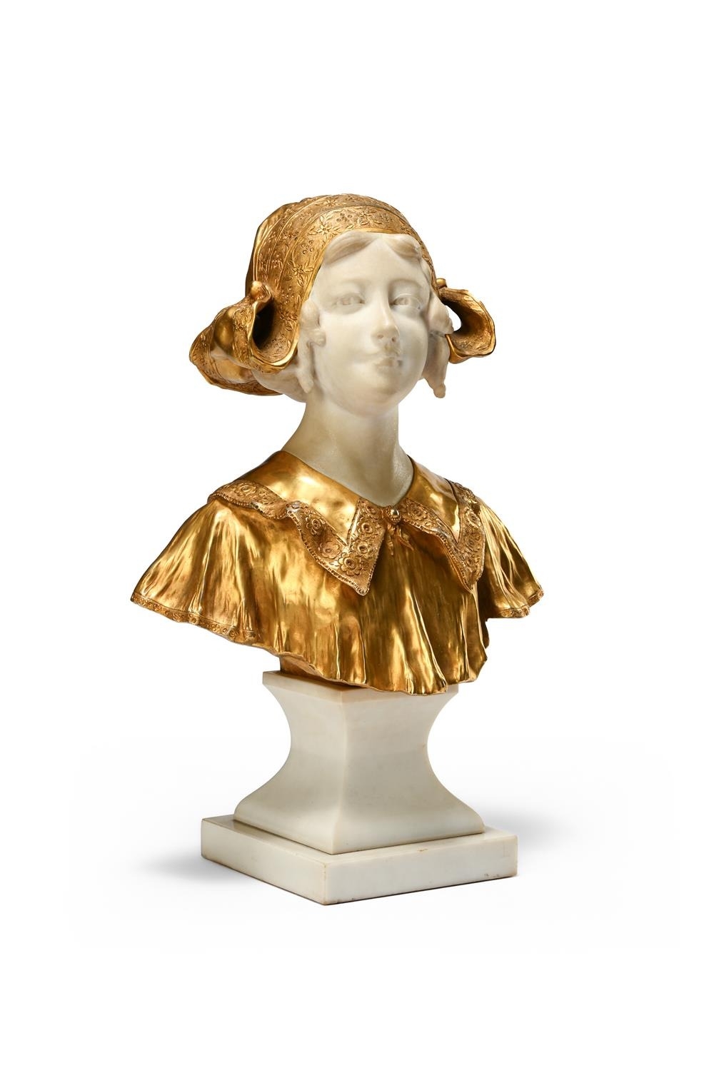 AFTER FORTUNATO GORI (AFFORTUNATO GORY FL.1886-1925)- A BURNISHED GILT BRONZE AND WHITE MARBLE BUST OF A YOUNG DUTCH GIRL EARLY 20TH CENTURY Wearing a characteristic bonnet, on square white marble socle, signed to cast 42.5cm high, 30cm wide