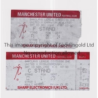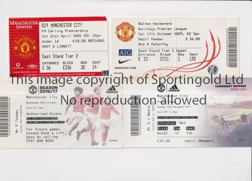 MANCHESTER UNITED Four home tickets for League matches v Manchester City 21/4/2001, 26/10/2016 and 10/12/2017 and Bolton Wanderers 17/10/2009, slightly creased. Generally good