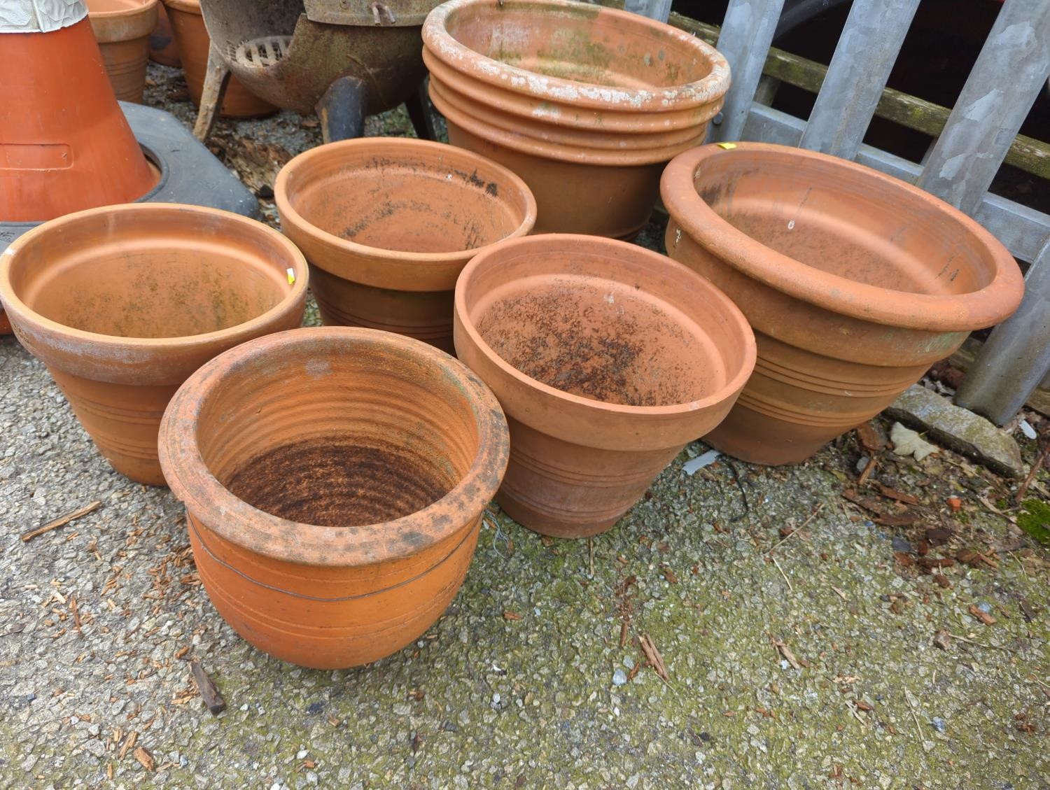 6 x variously-sized terracotta planters. Largest Dia 36cm H33cm.