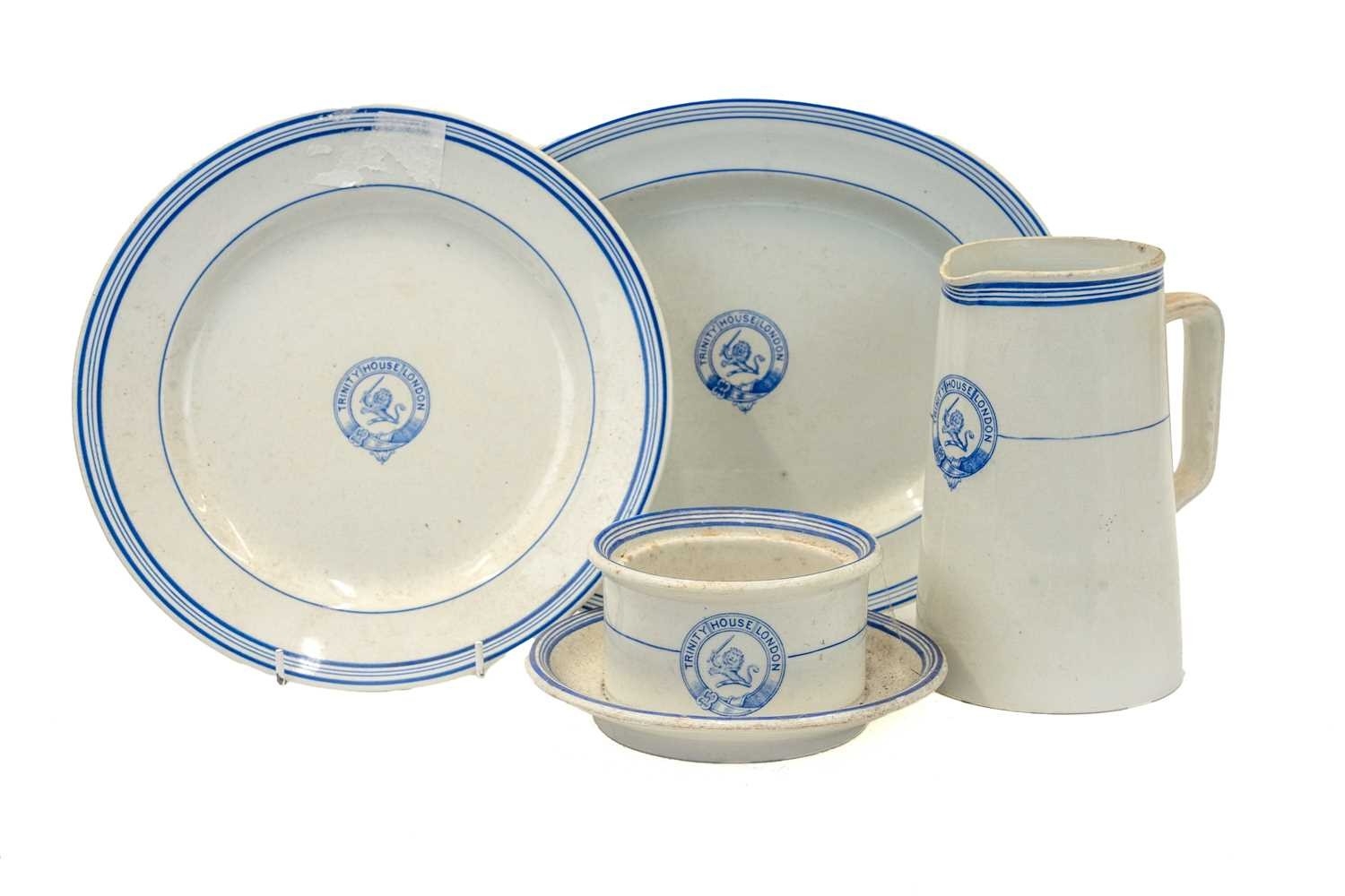 Trinity House, printed tableware. 19th century, each piece with the lion crest within a printed garter, comprising a Copeland small oval platter, length 31cm, a Wedgwood & Co butter dish, and dinner plate, and a James Green & Nephew jug (4).