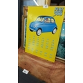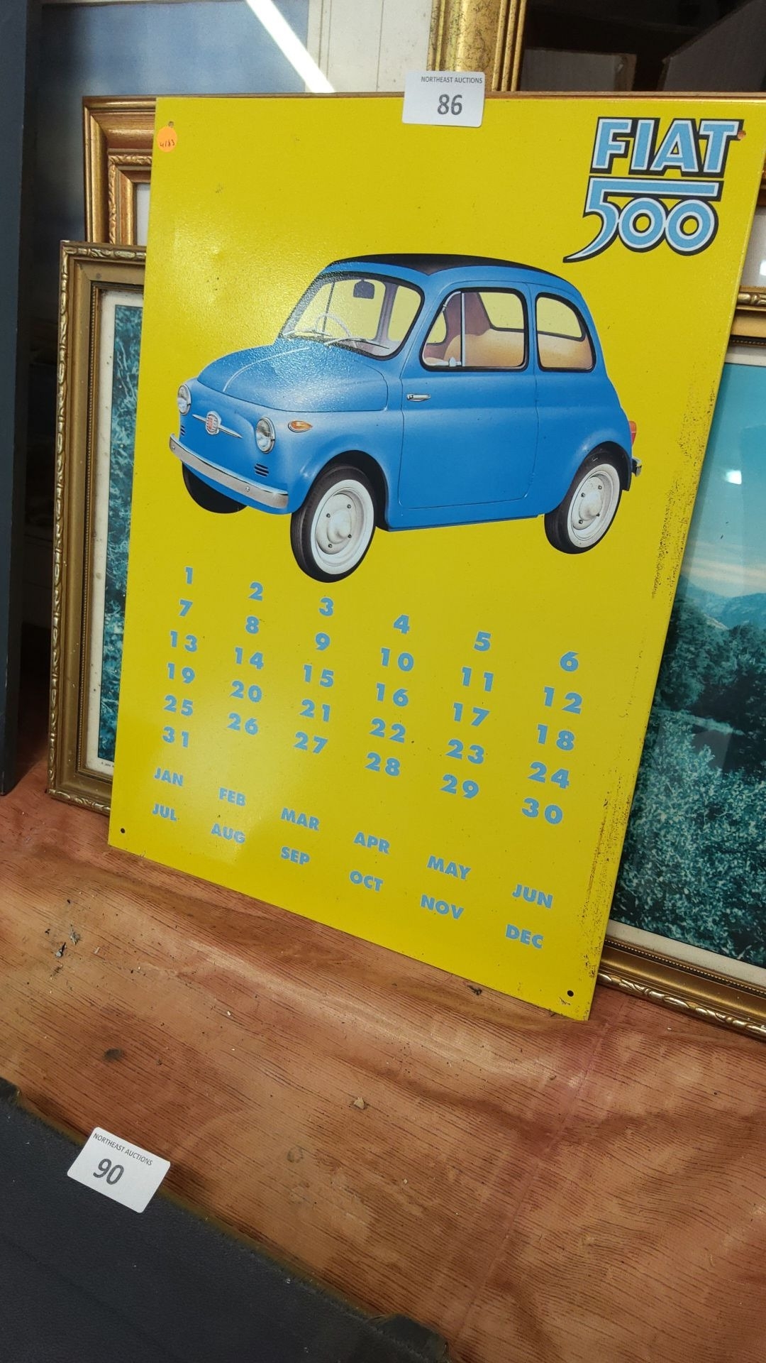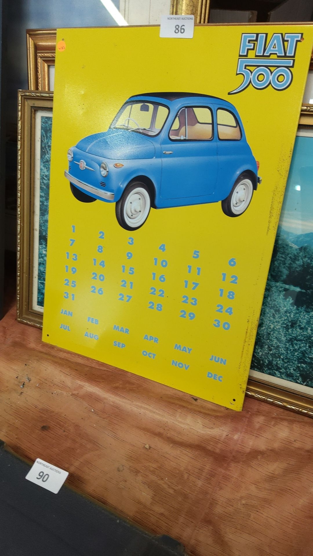 Yellow tin advertising sign for the Fiat 500, featuring blue car illustration and perpetual calendar numerals.
