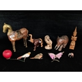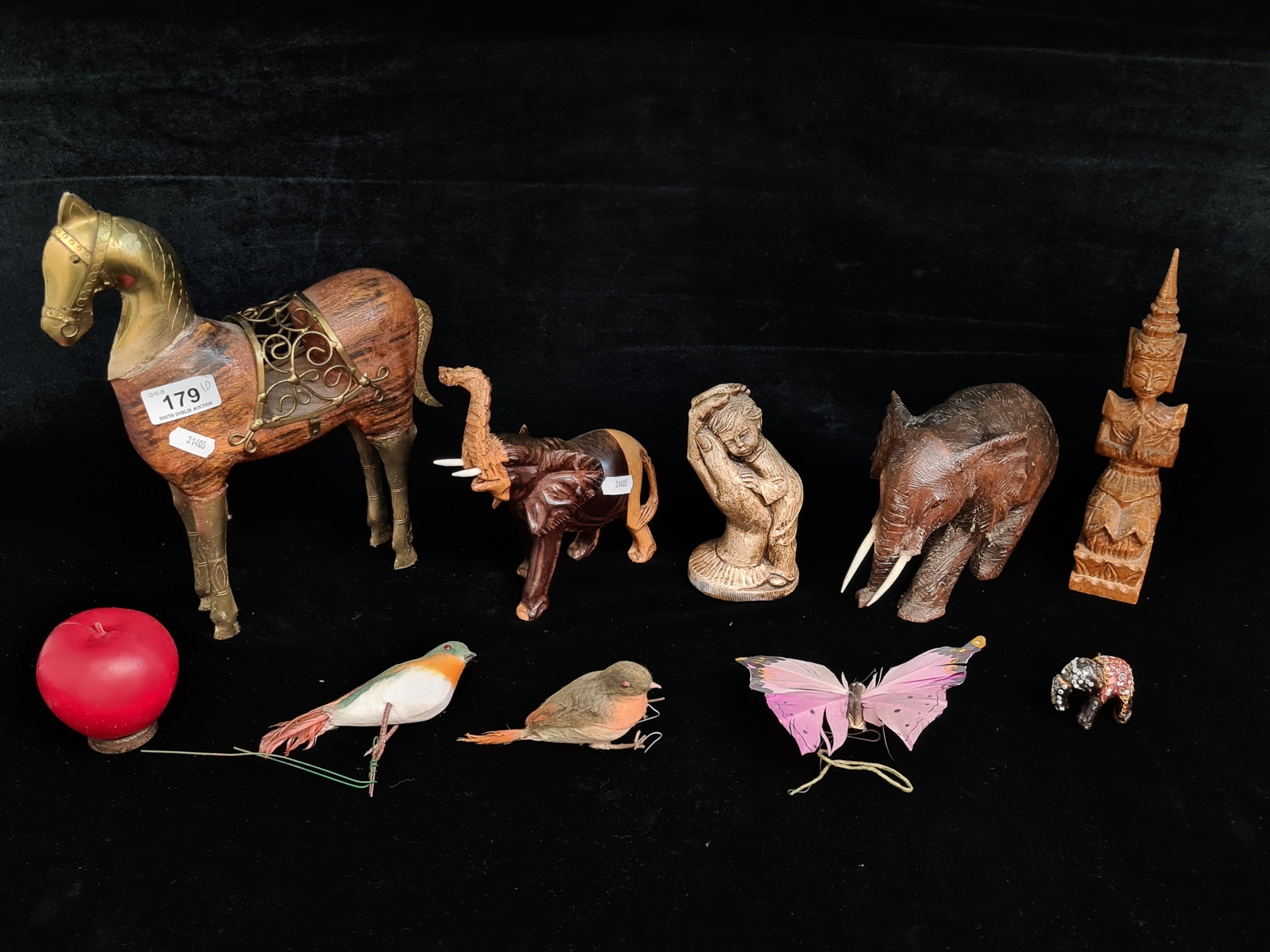 An interesting mixed lot of items including a wooden and brass figure of a horse, two carved elephant figures and a hand carved teak Thai Theppanom sculpture.