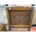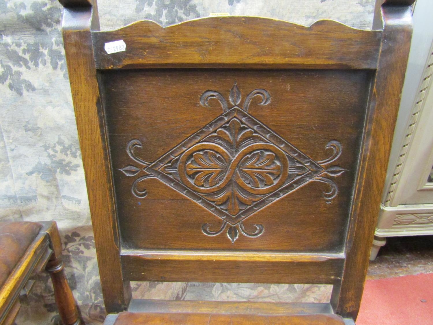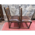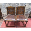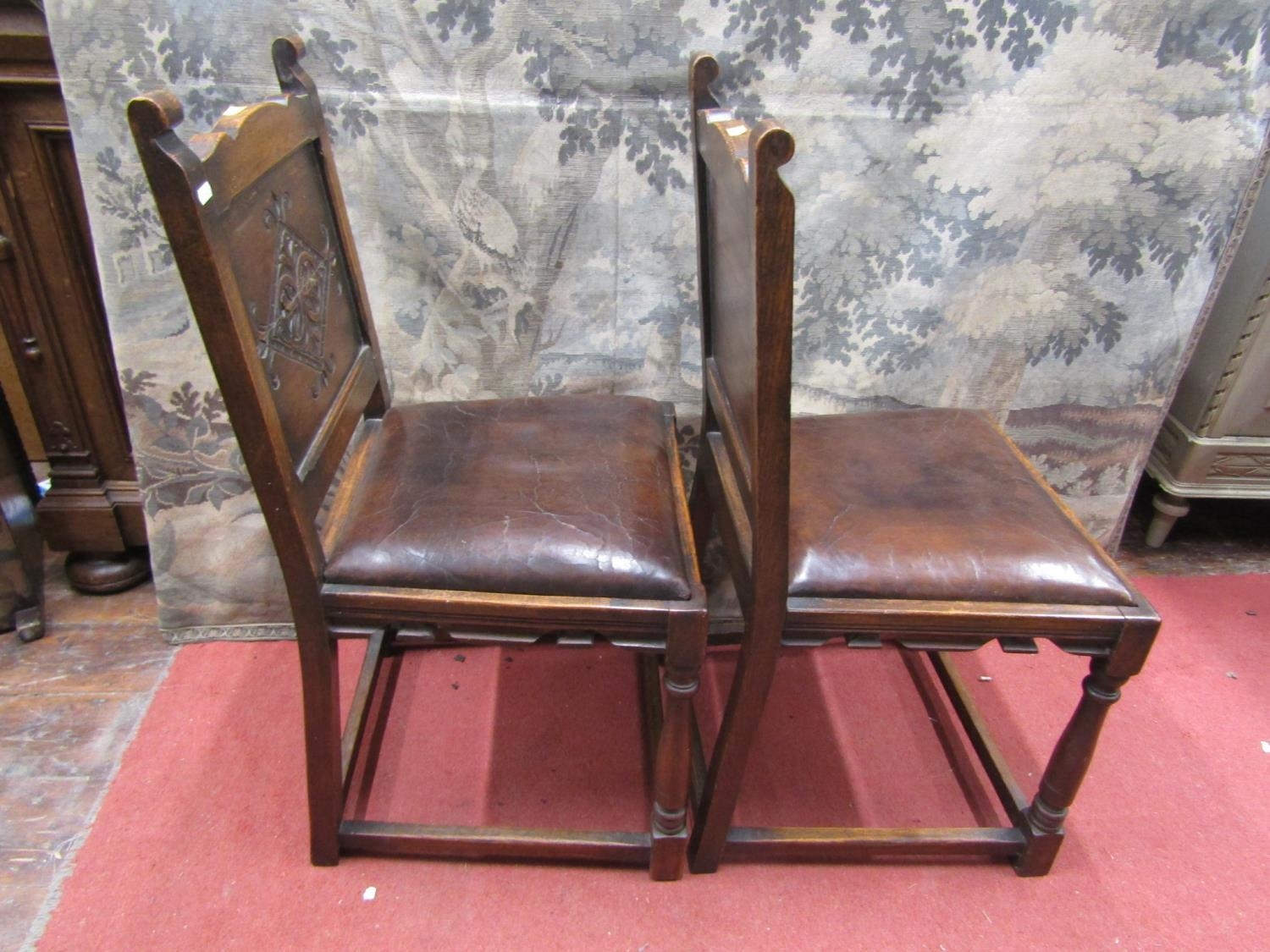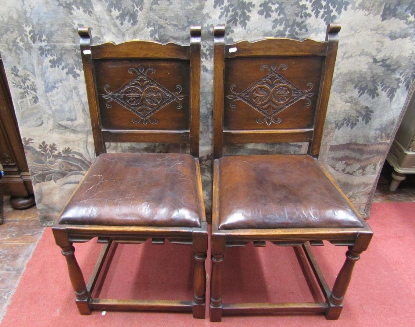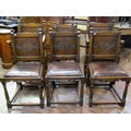 Six (4+2) oak frame dining chairs, in the Old English manner, with turned supports, hide upholstered seats and carved back panels, with lozenge shaped detail