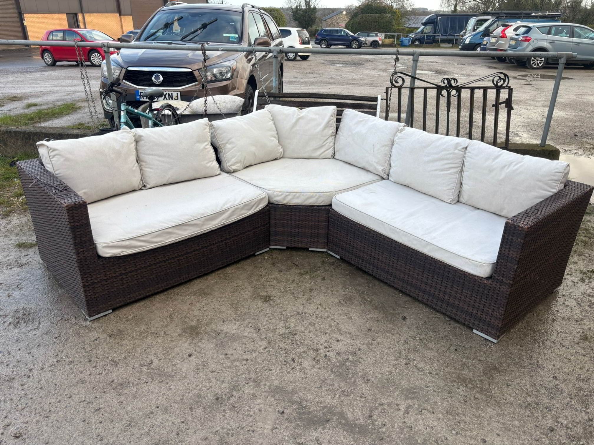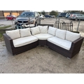 Good quality brown rattan 'Royalcraft' corner settee with cream cushions 69H x 240 W (in 3 sections)