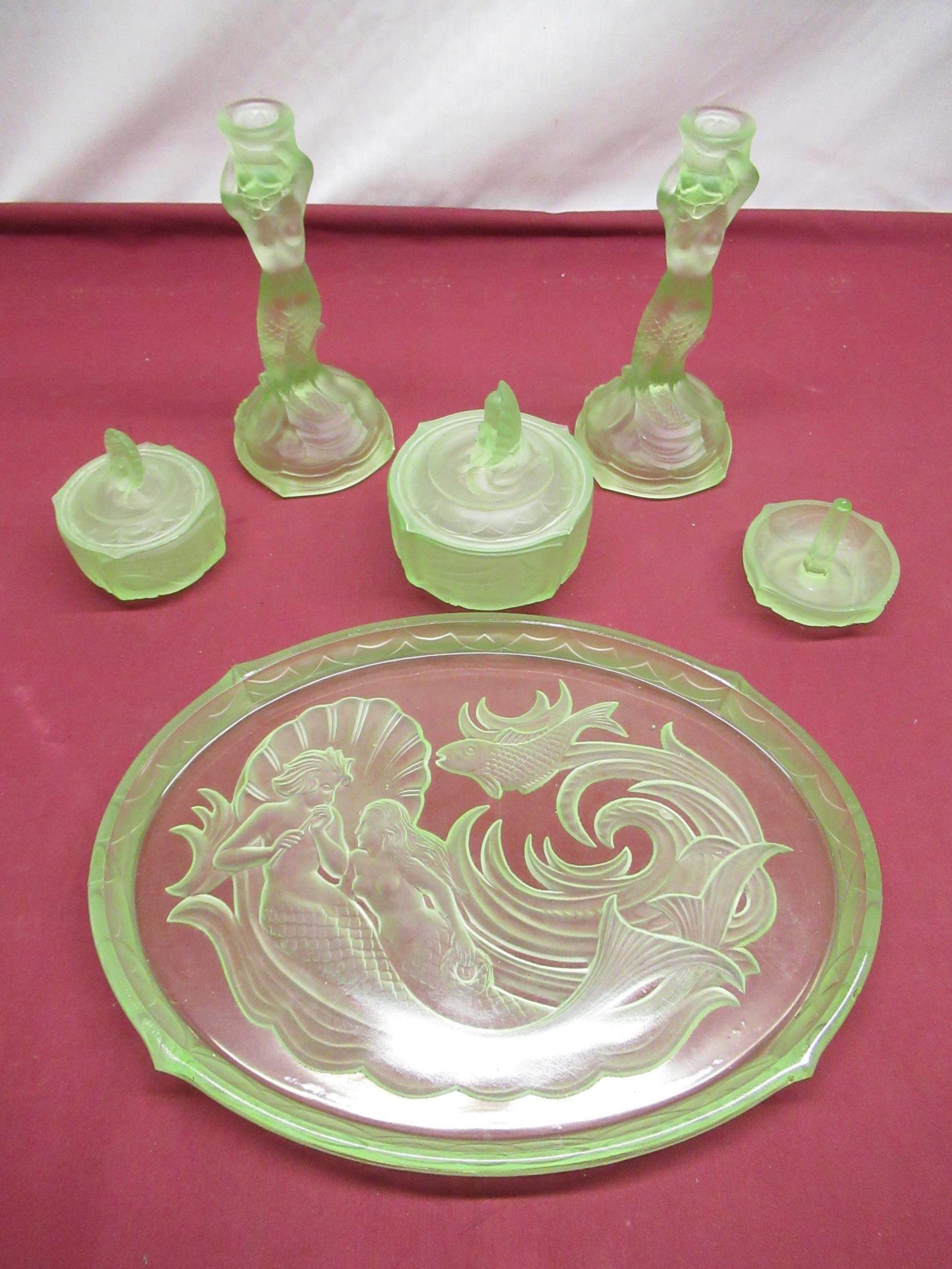 1930's Uranium tinted Walther & Sohne six piece dressing table set