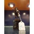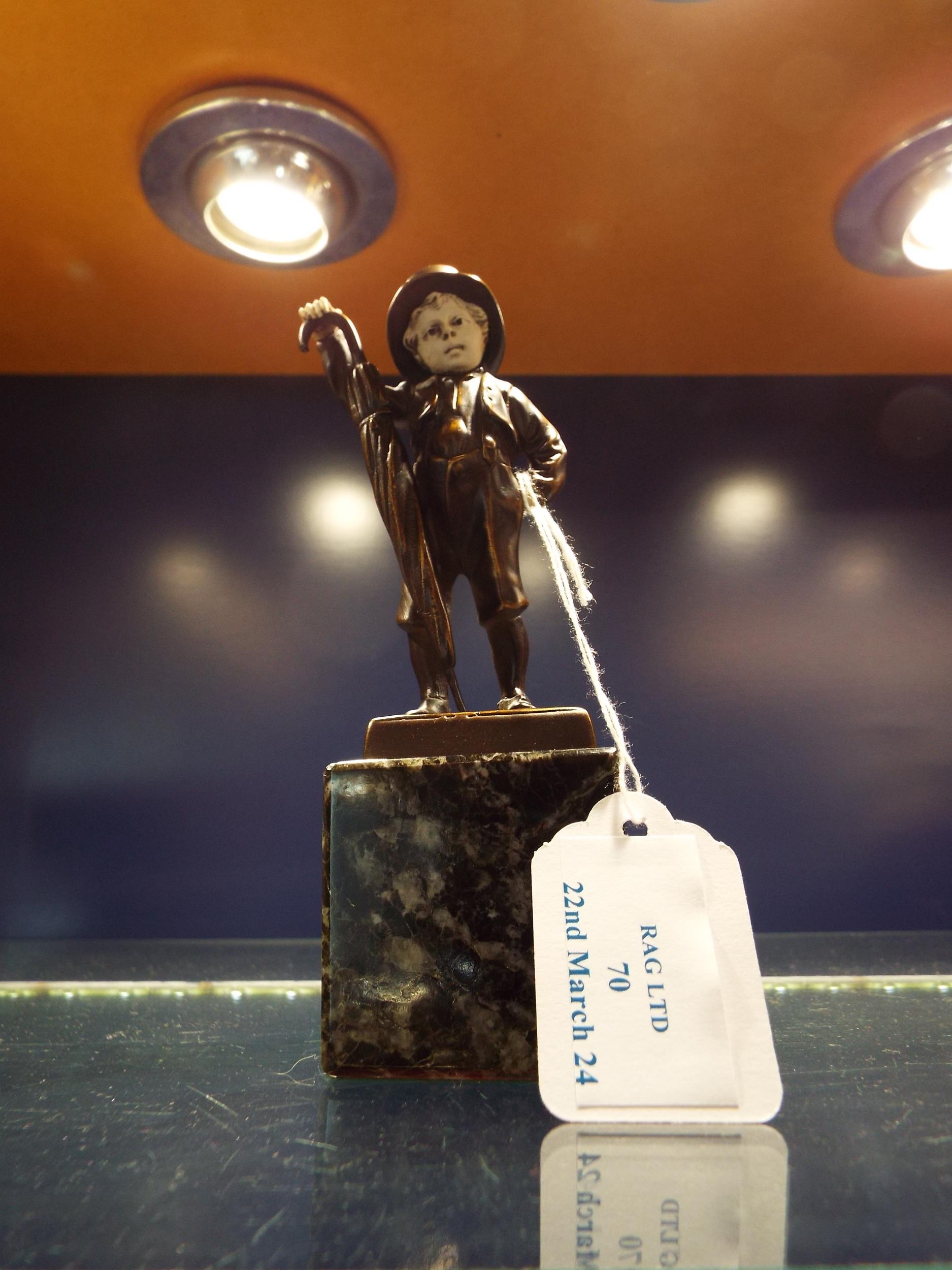 A small bronze statue of a young boy holding his umbrella mounted on a marble base