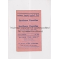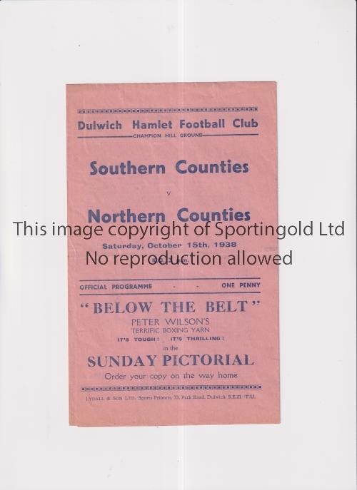 SOUTHERN COUNTIES V NORTHERN COUNTIES 1938 AT DULWICH HAMLET F.C. Programme for the match on 15/10/1938, slight horizontal crease. Generally good