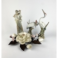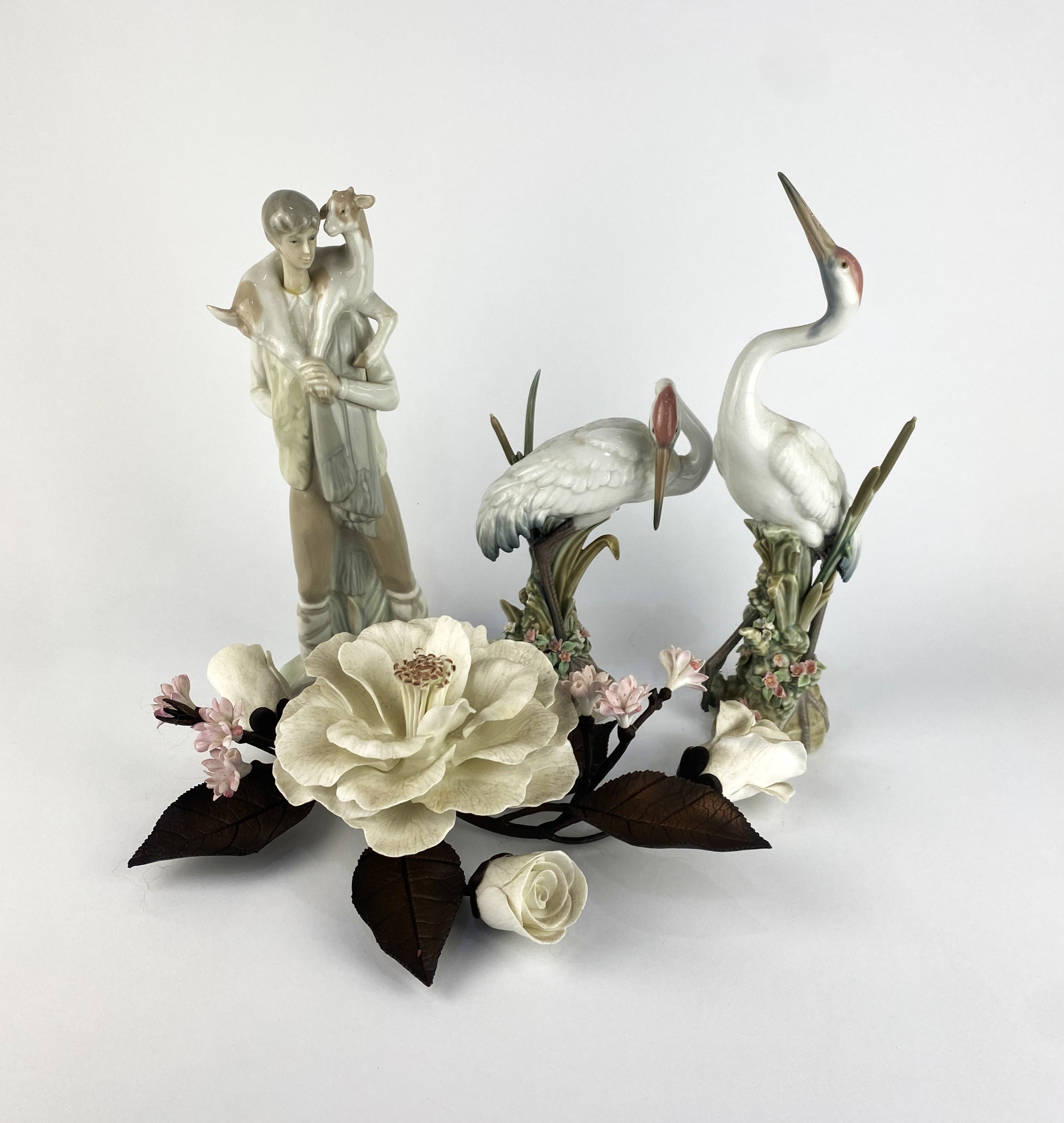 A pair of Lladro porcelain models of preening cranes tallest 29cm high, and a Lladro figure of a young shepherd 27cm, together with a Boehm porcelain model of flowers with bronze-tone foliage (a/f)