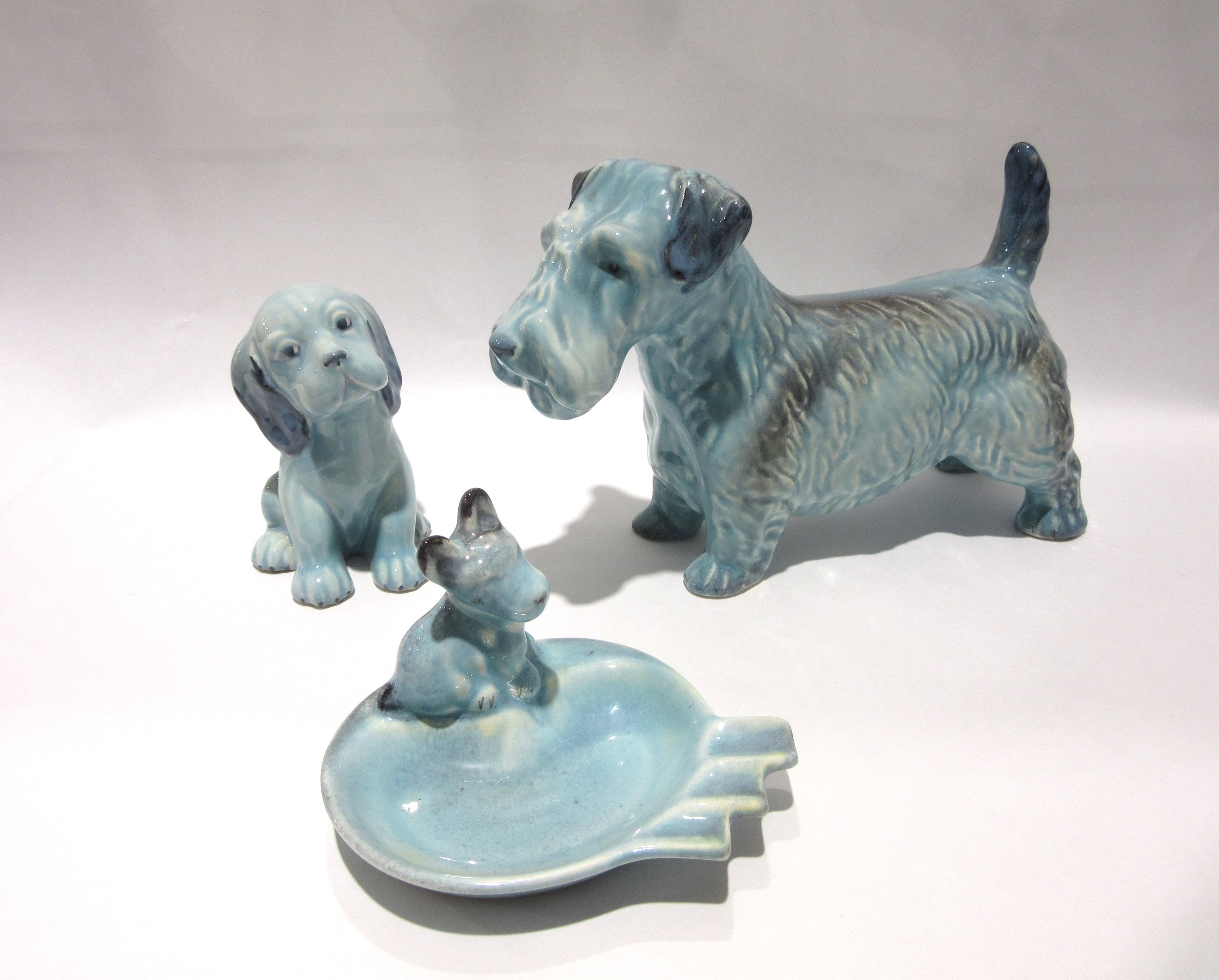 A Beswick Sealyham Dog in blue, model no. 302, Lollopy Dog in blue, model no. 454 and a Beswick blue ashtray, model no. 88