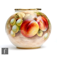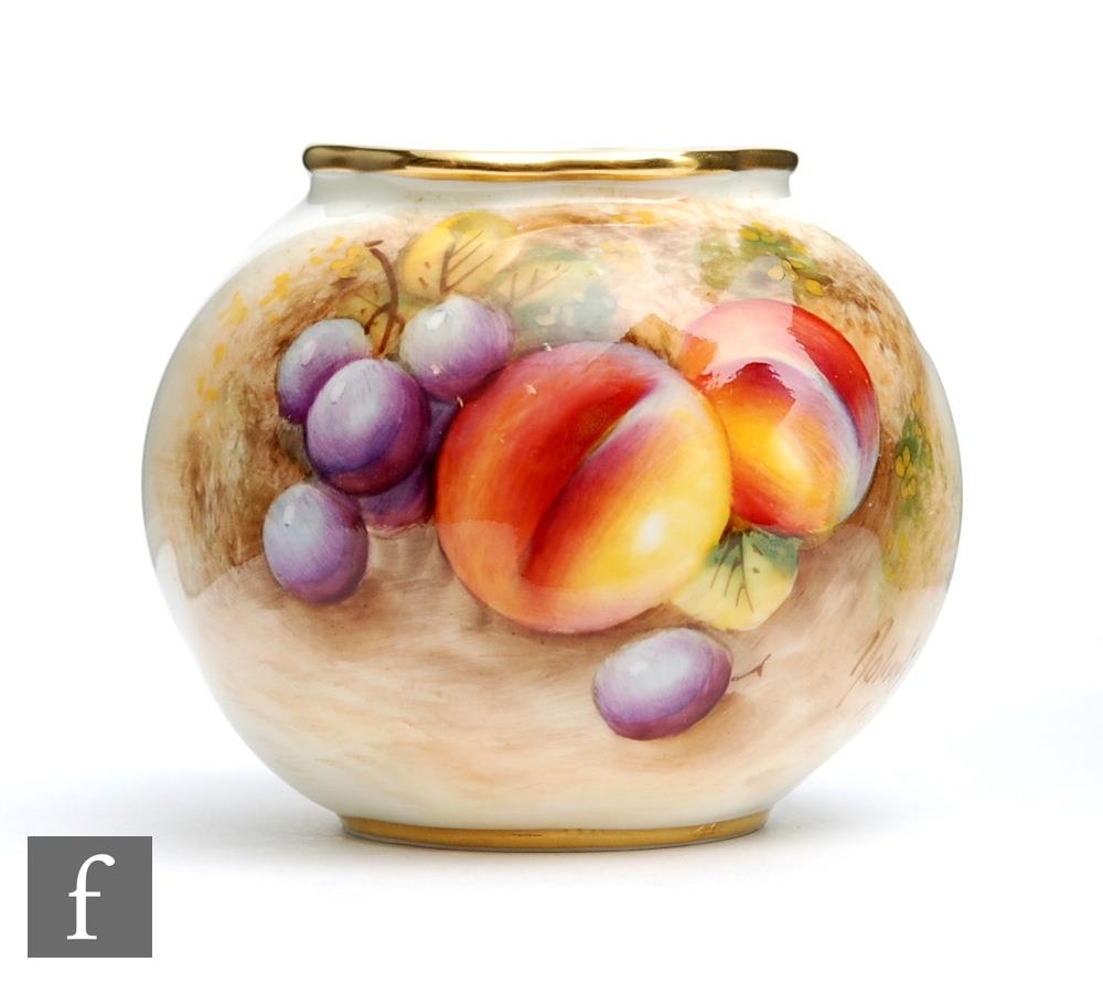 A small Royal Worcester Fallen Fruits shape G161 vase panel decorated by Rolands (or Roberts) with peaches and red grapes, signed, black printed mark, height 6.5cm.