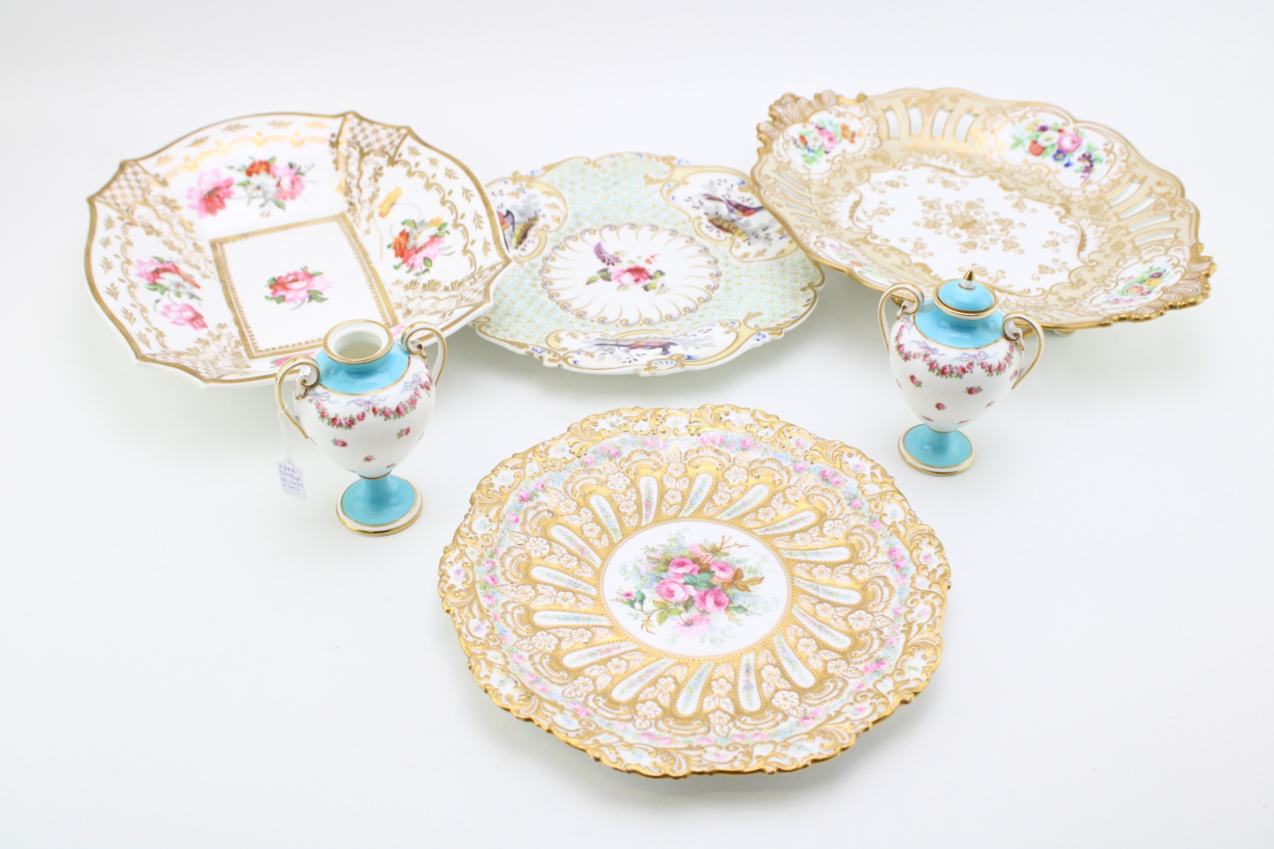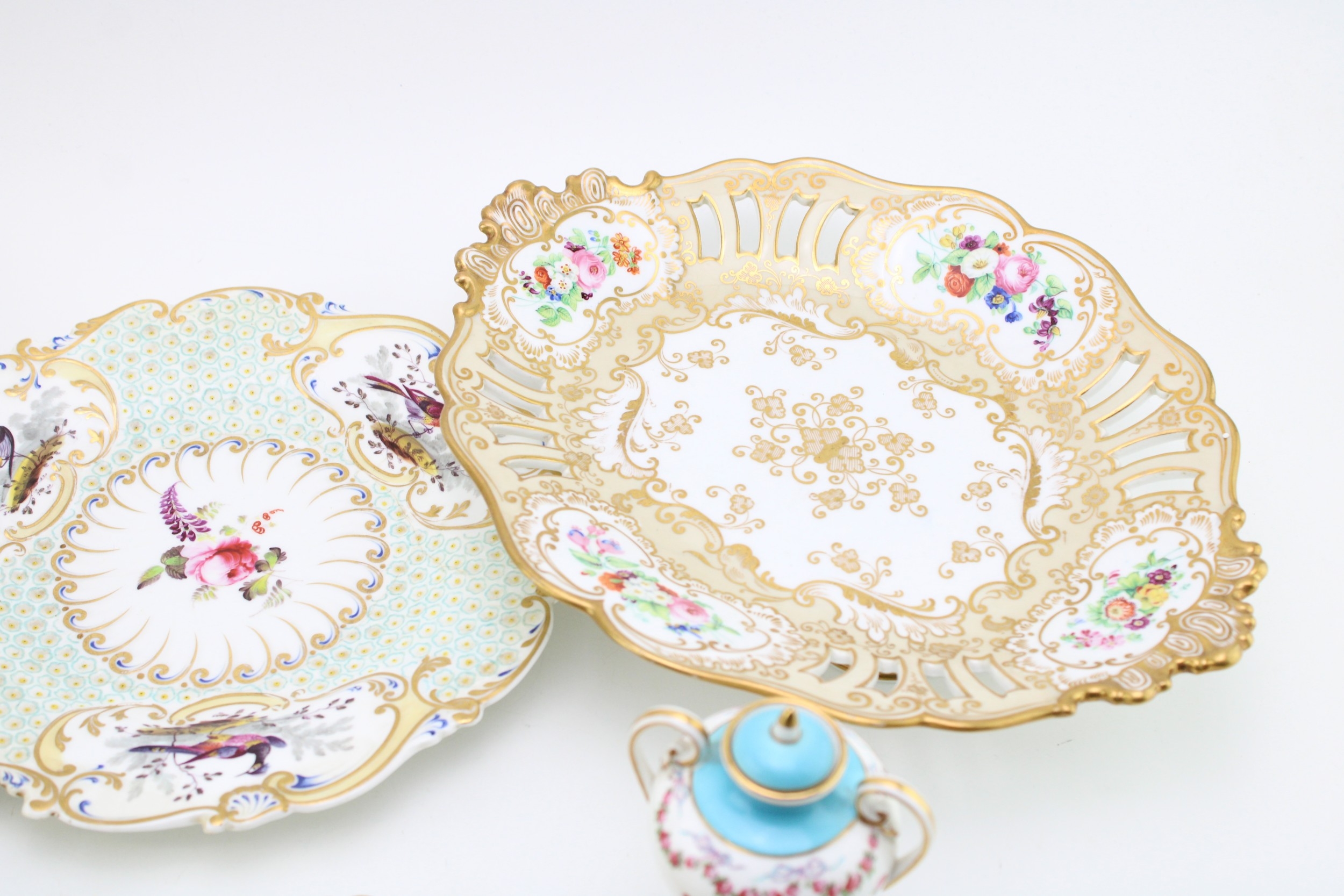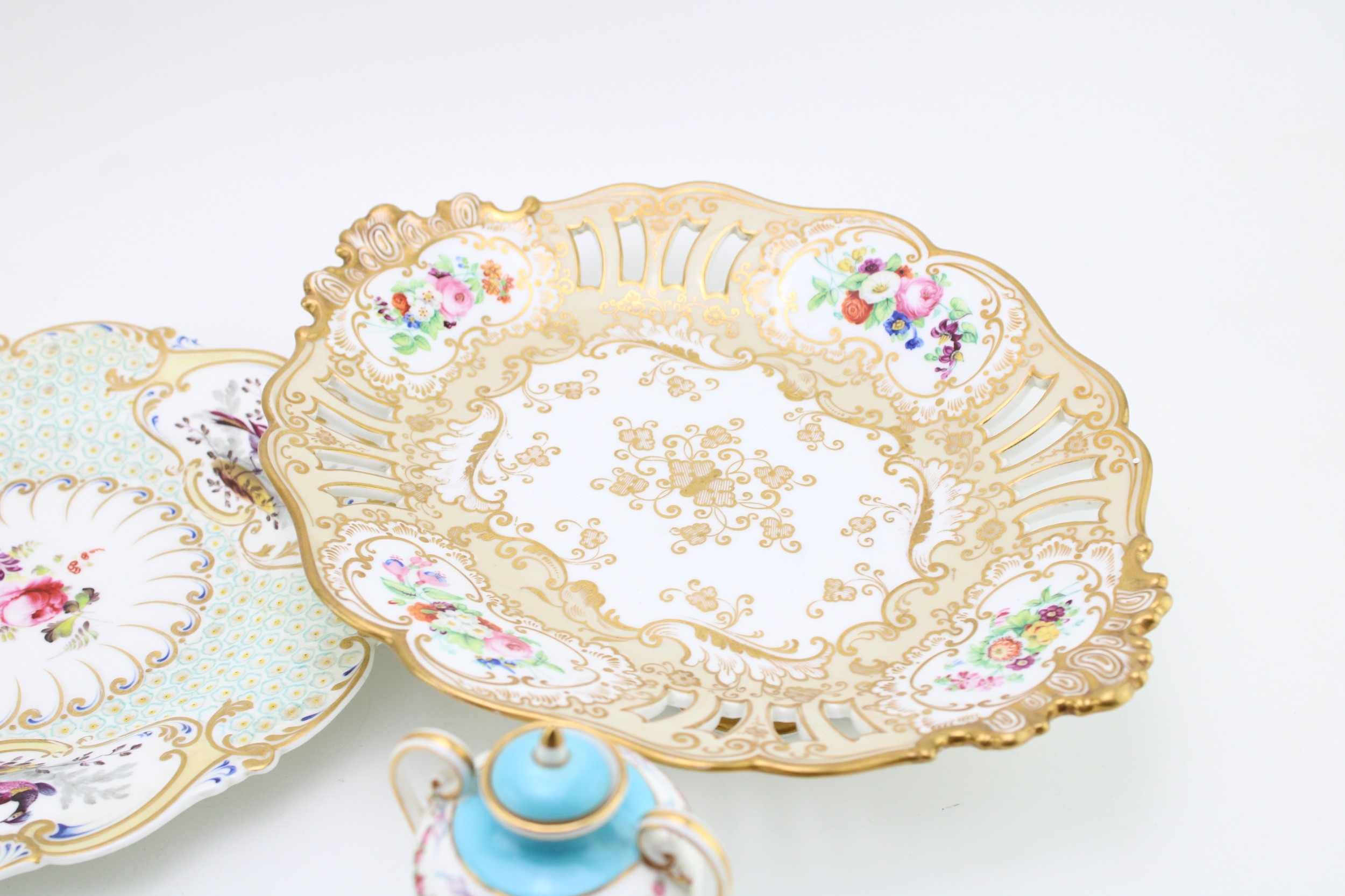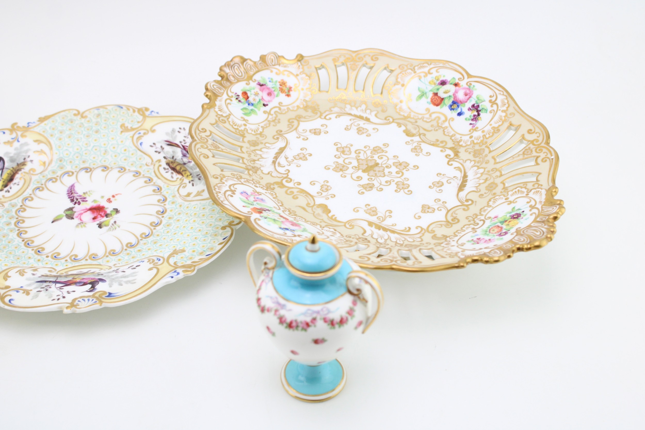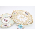 A collection of early ceramic items to include a pair of 19th century George Jones, Crescent China two handled vases, Coalport hand-painted dish c1820, together with two cabinet plates and a reticulated footed plate decorated with hand-painted floral sprays, 29.5cm wide, (4).