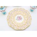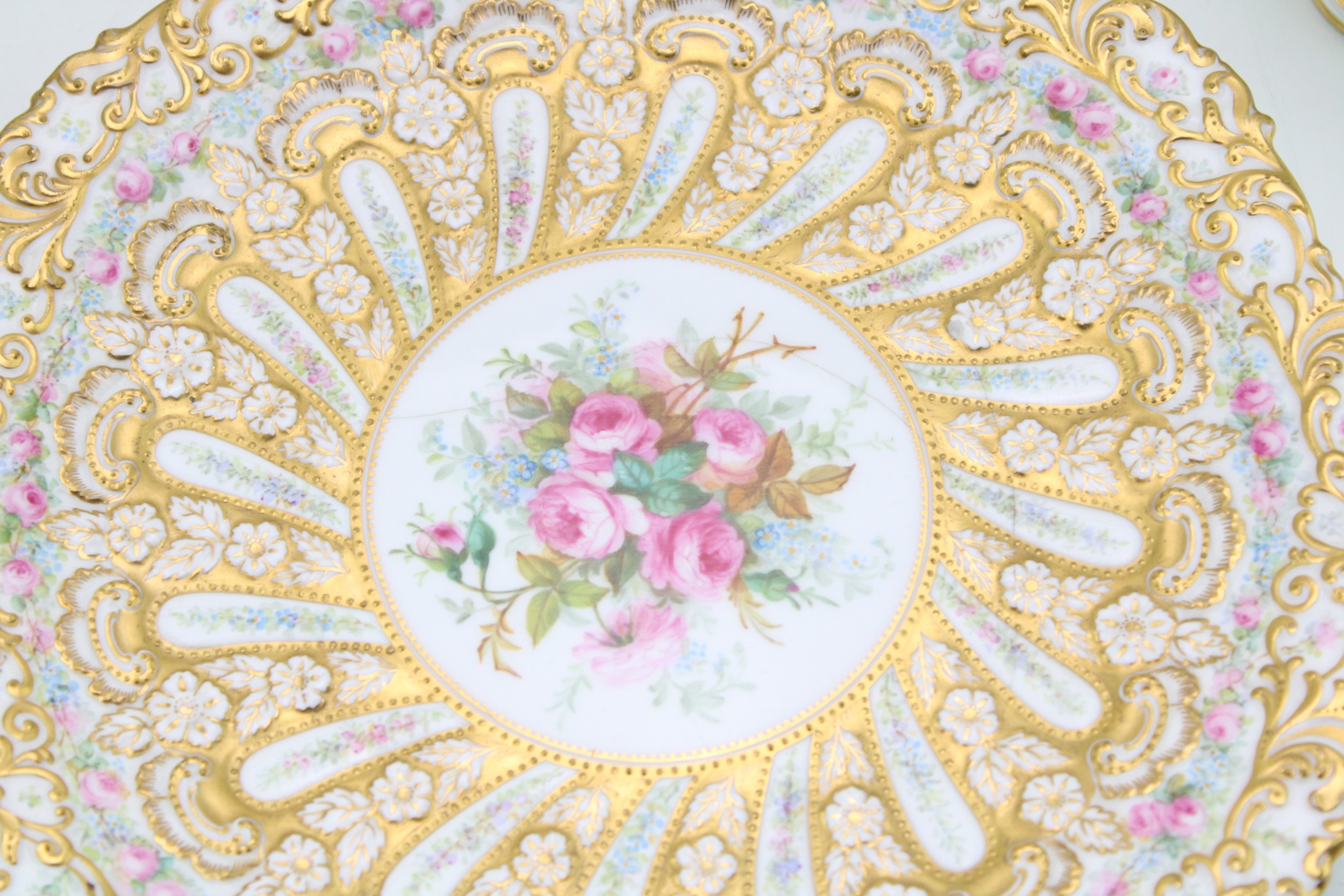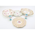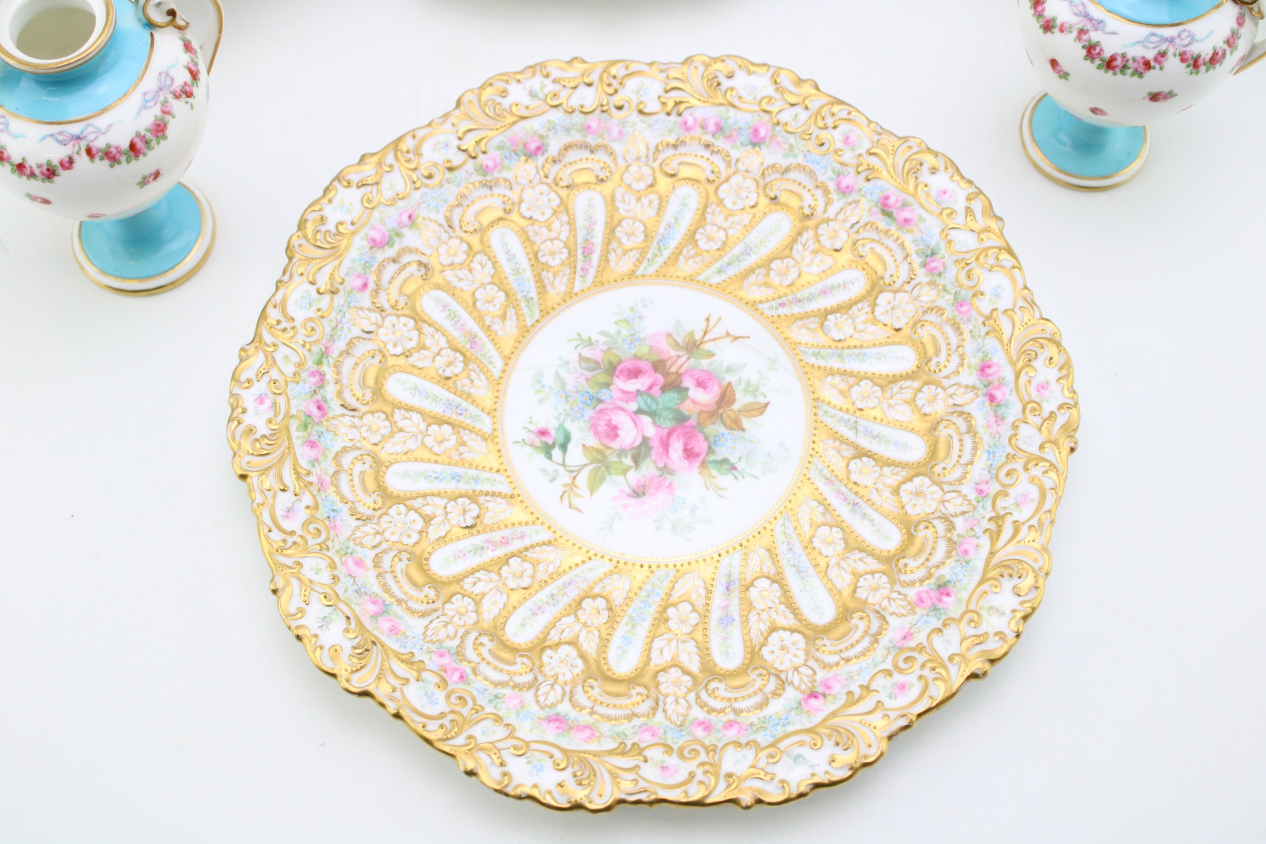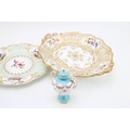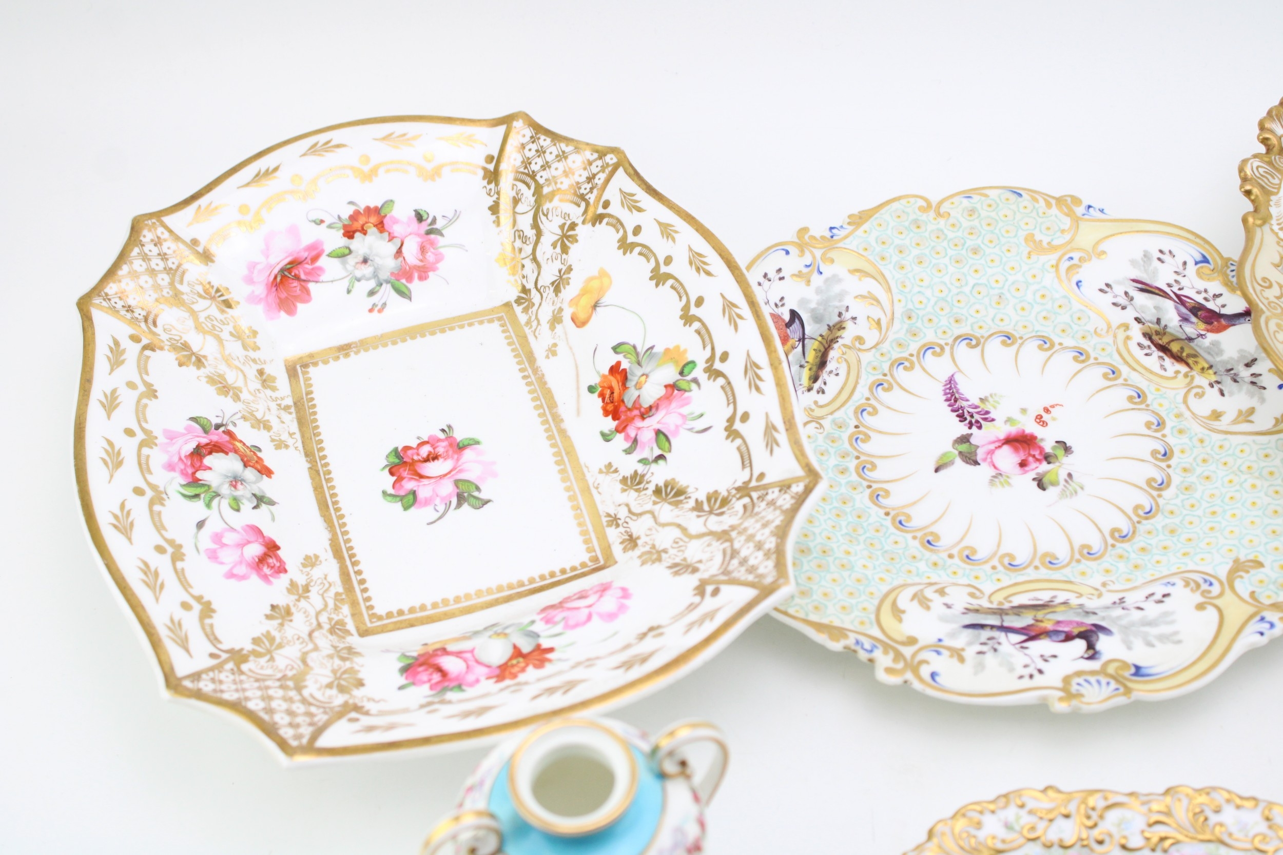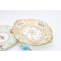 A collection of early ceramic items to include a pair of 19th century George Jones, Crescent China two handled vases, Coalport hand-painted dish c1820, together with two cabinet plates and a reticulated footed plate decorated with hand-painted floral sprays, 29.5cm wide, (4).