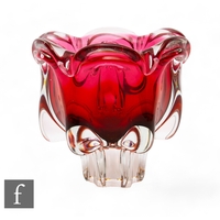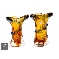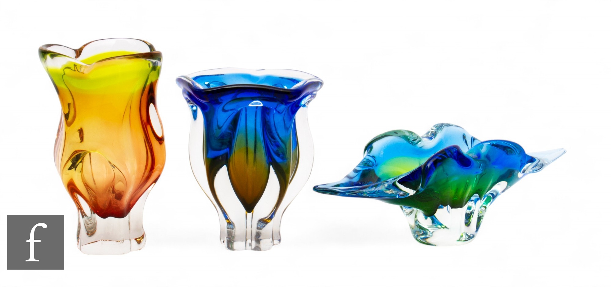 Josef Hospodka - Chribska - A 1960s glass vase of pulled lobed form rising from a pedestal vase, graduated blue to amber and cased in clear, height 16.5cm, a similar vase in citron to amber, and a pulled elliptical bowl in blue and green. (3)