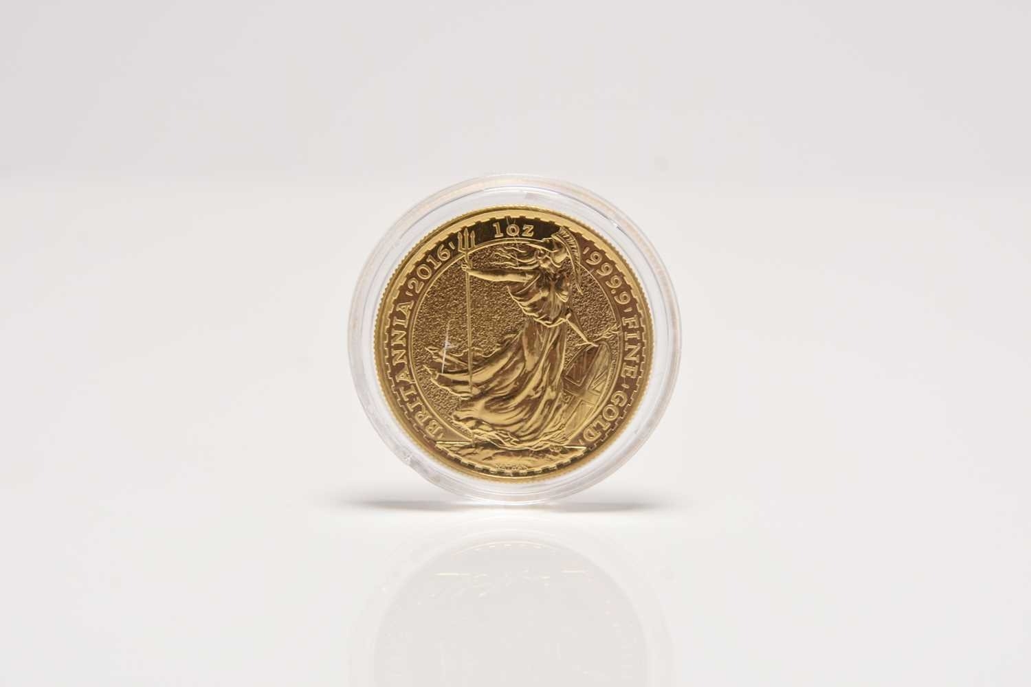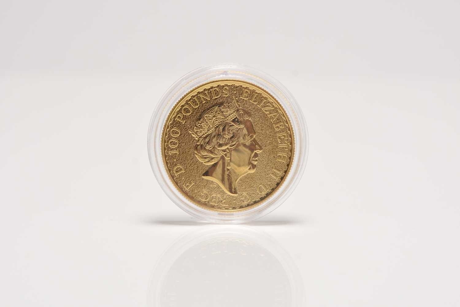 Elizabeth II one hundred pound Britannia 1oz gold coin, dated 2016 (Nathan reverse), within capsule.