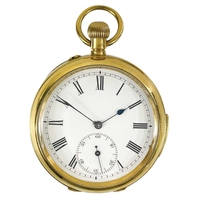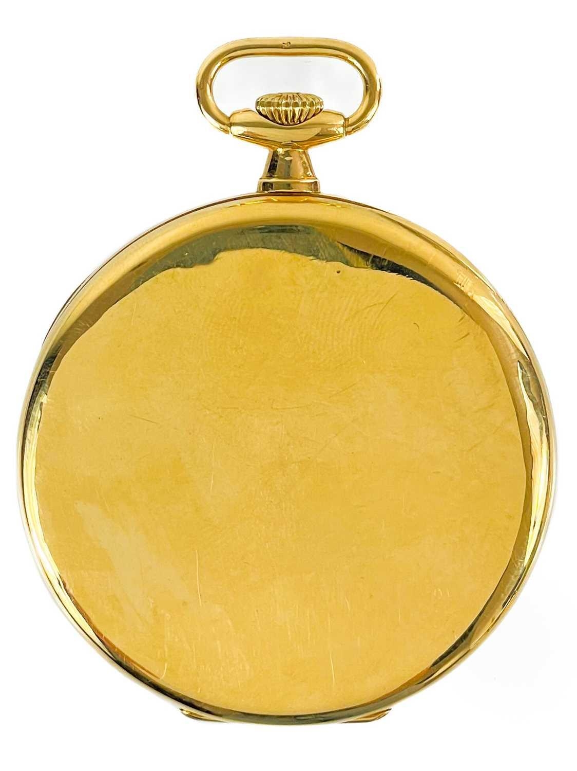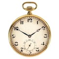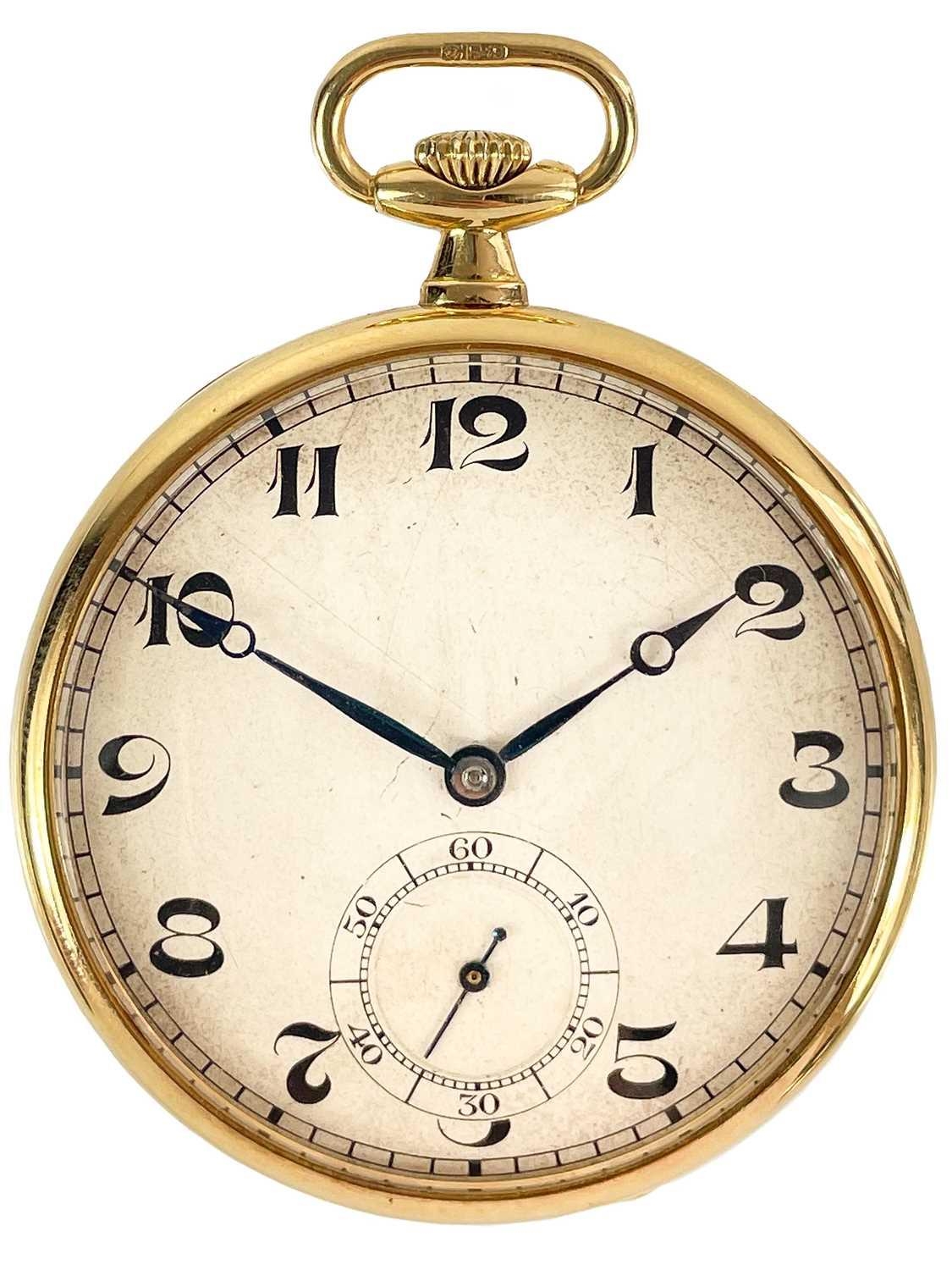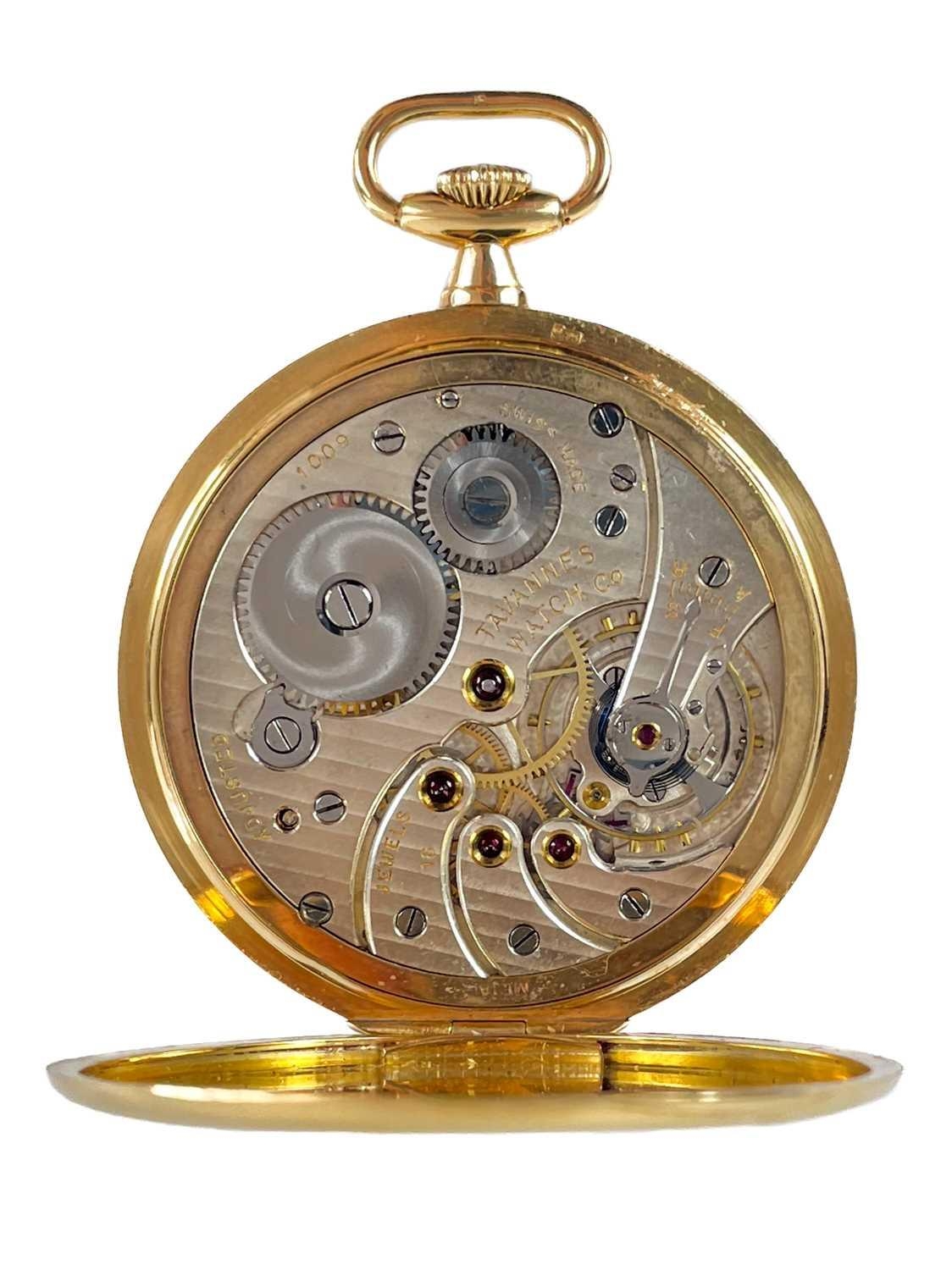 A 1920's Art Deco 18ct gold cased crown wind slim dress pocket watch by Tavannes Watch Co. The 40mm silvered dial with black Arabic numerals and subsidiary seconds dial, the 15 jewel movement signed TAVANNES WATCH Co 1009, the case with import hallmark for 1924, case 46mm, 58.7g. winds and runs.