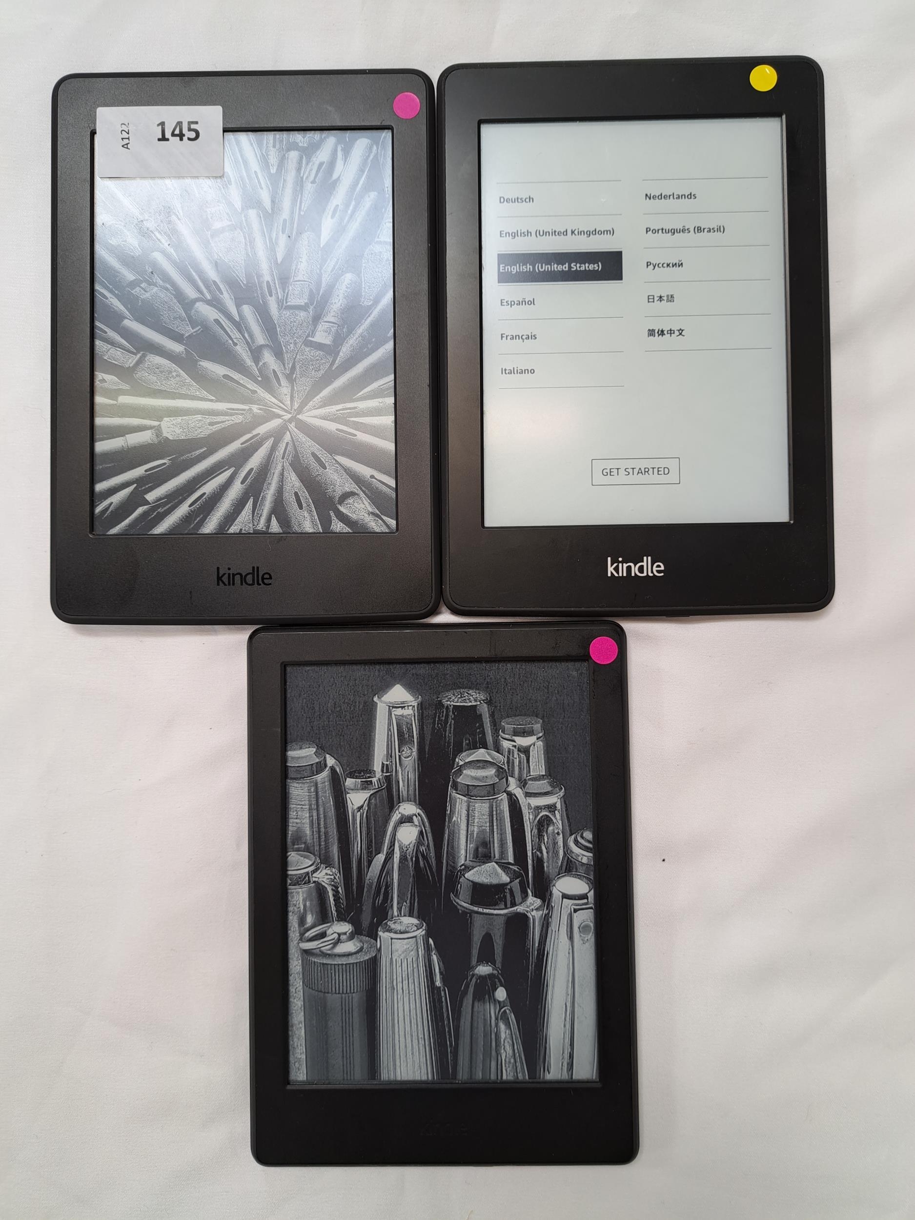comprising a Paperwhite 3, serial number G090 G105 5393 03QM; a Paperwhite 2, serial number 9017 2201 4327 09S7; and a Basic 2, serial number G000 K905 7331 04QJ (3)