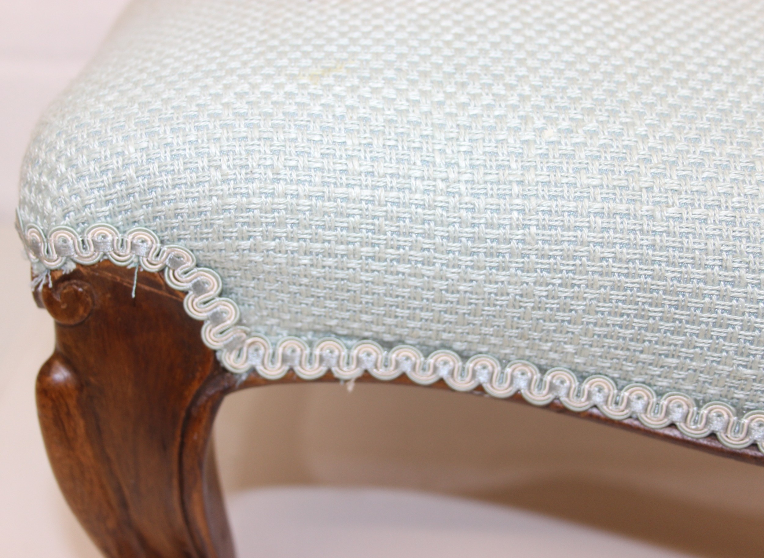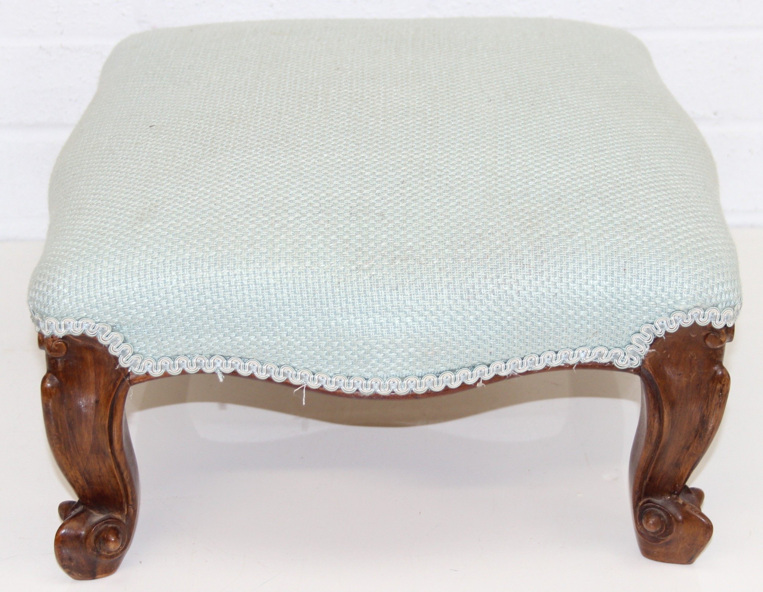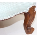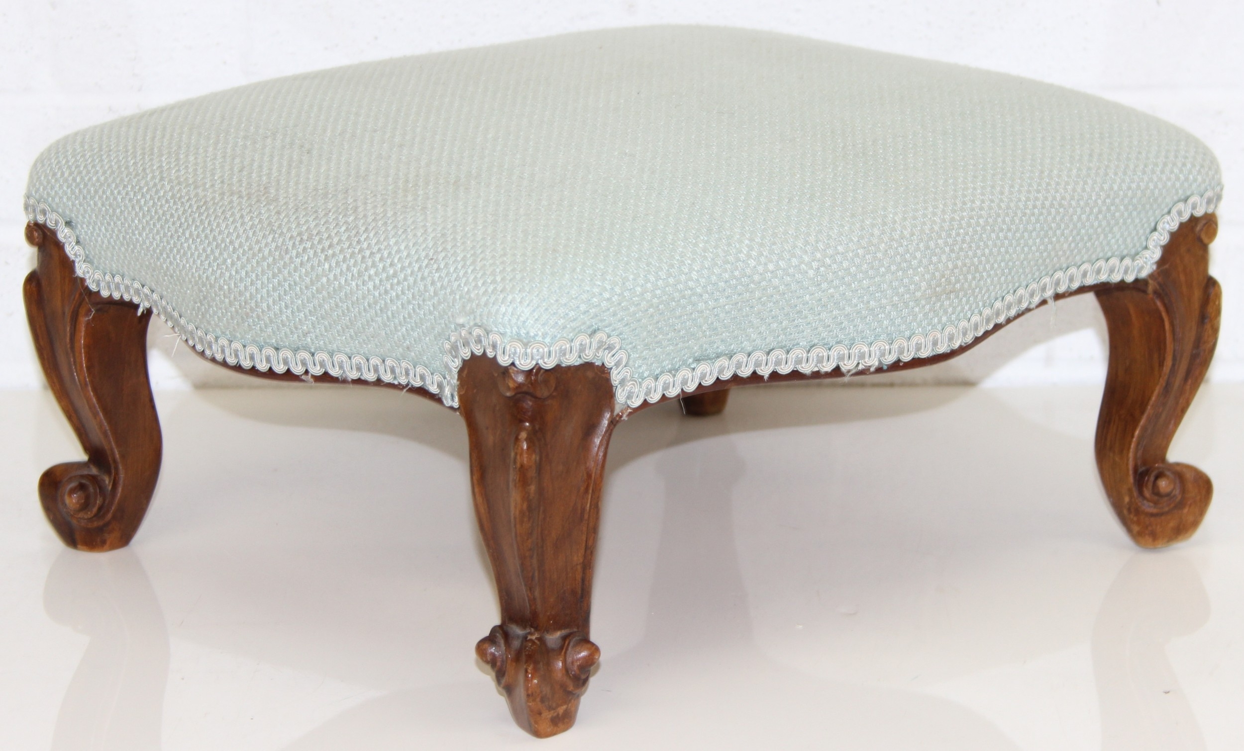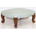 An antique style footstool with turquoise upholstery and carved legs, 41cm x 38cm x 23cm