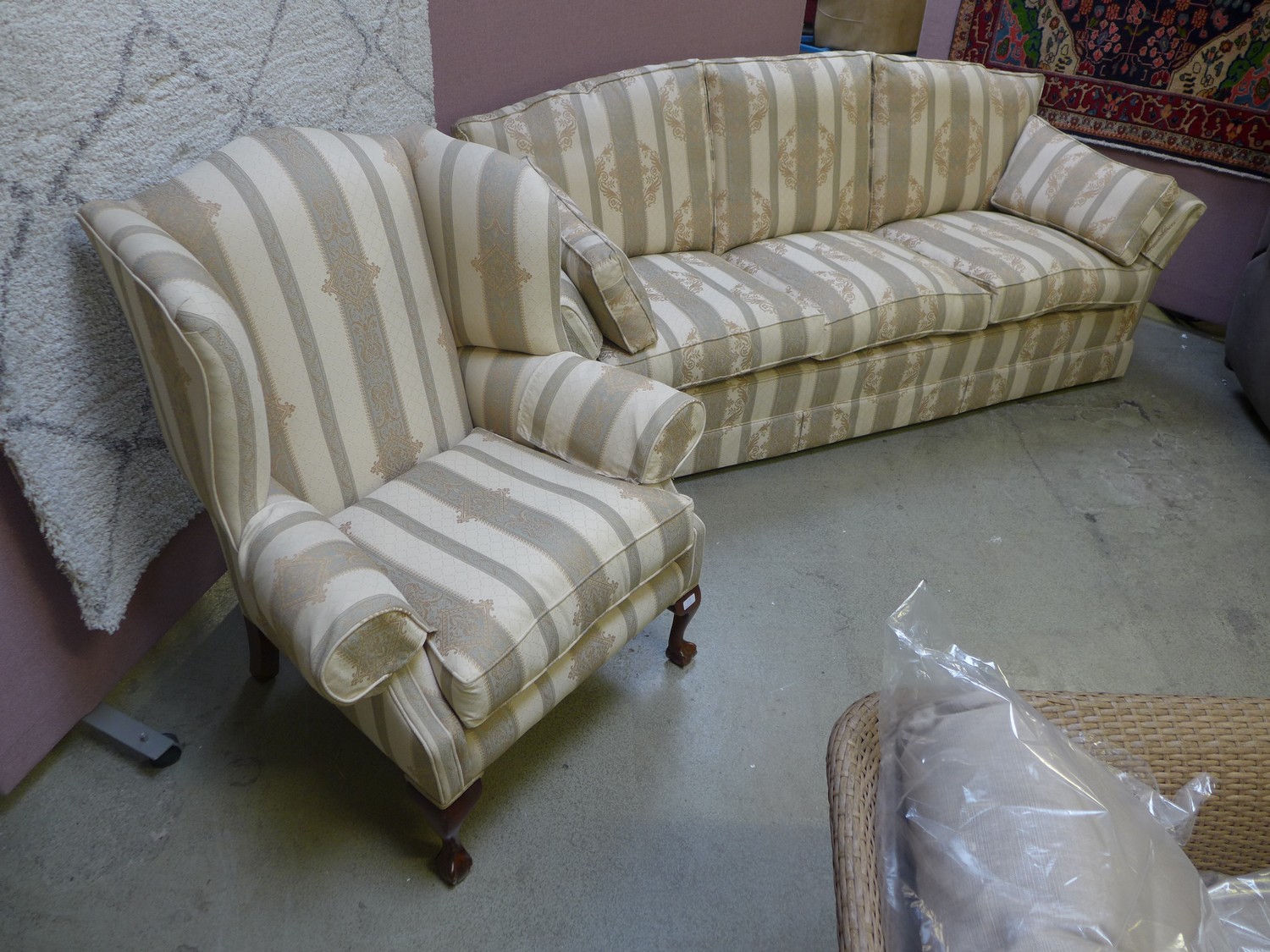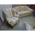 A cream striped upholstered three seater sofa with armchair