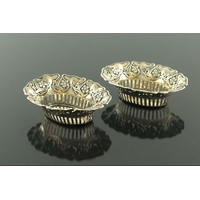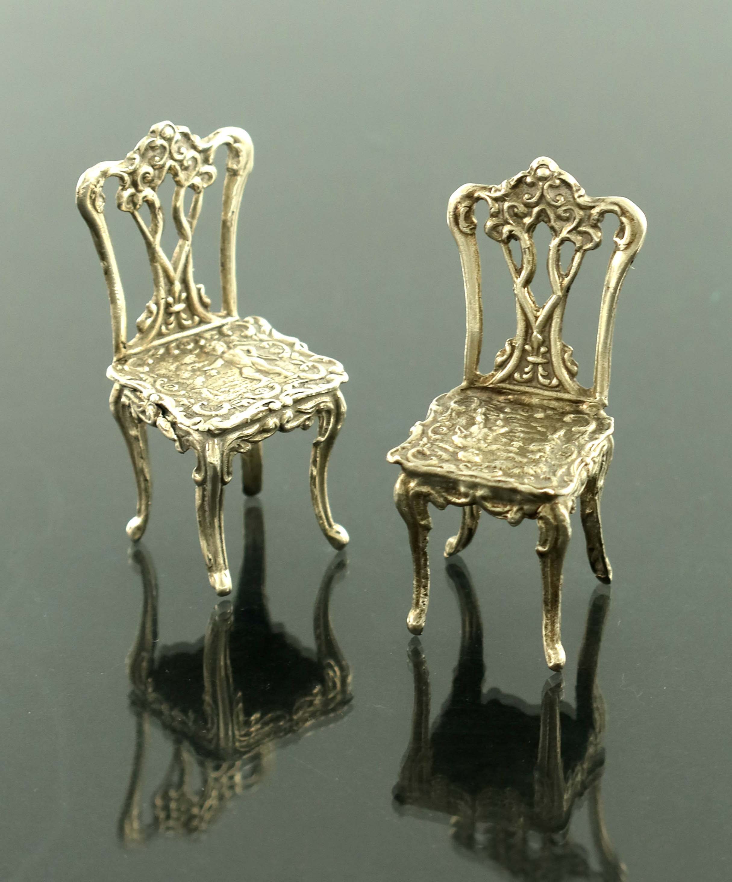 A pair of Elizabeth II miniature silver chairs, Richards and Knight, Chippendale form, embossed in the Dutch style, 5.5cm high, 1.04ozt (2)