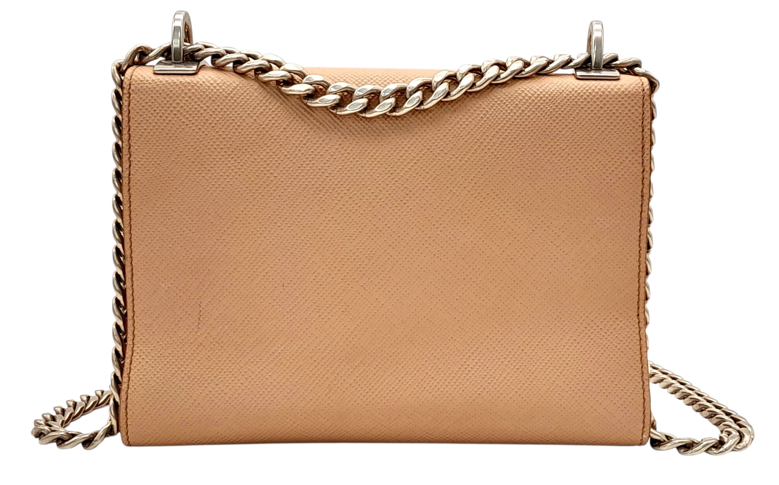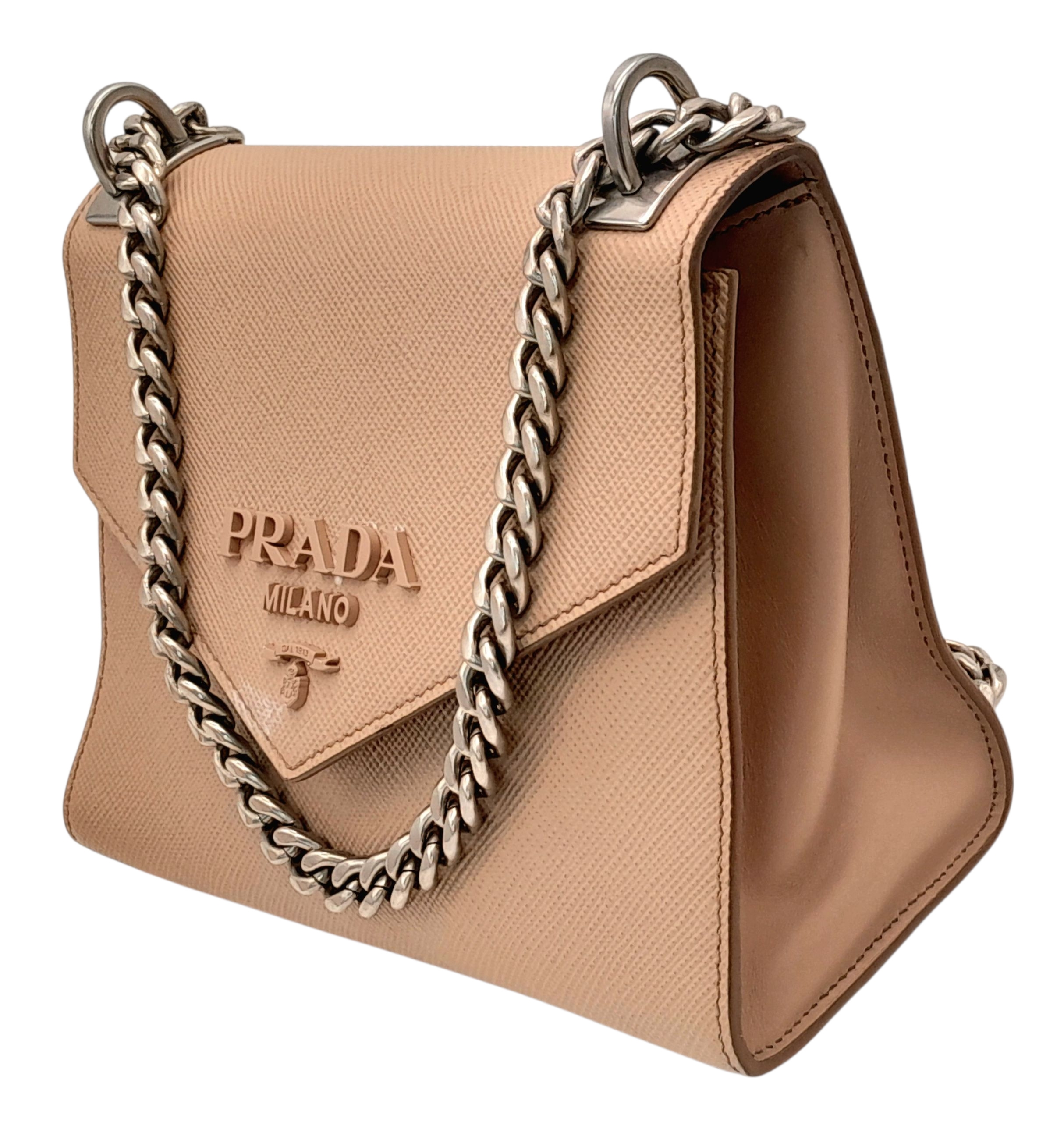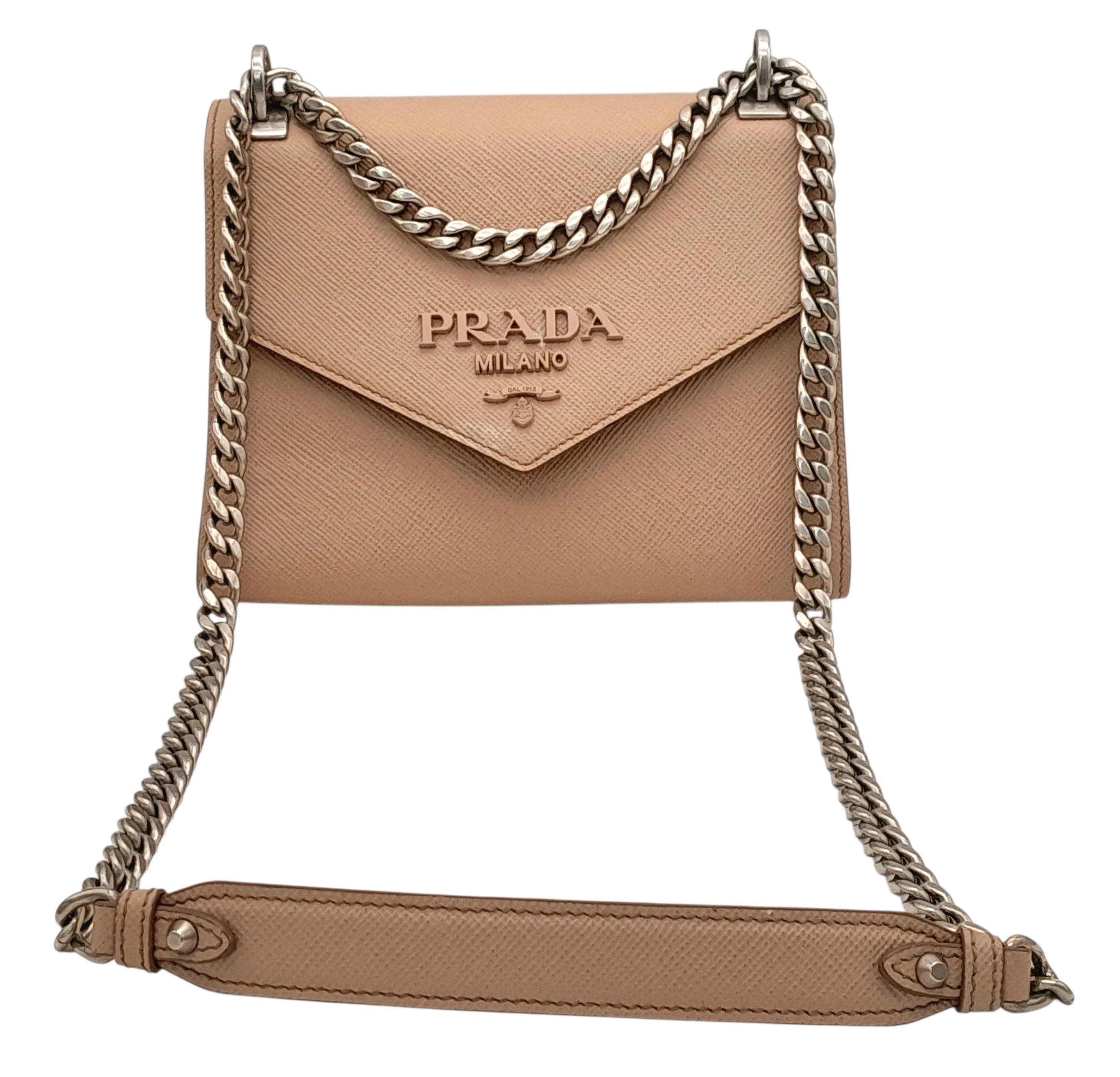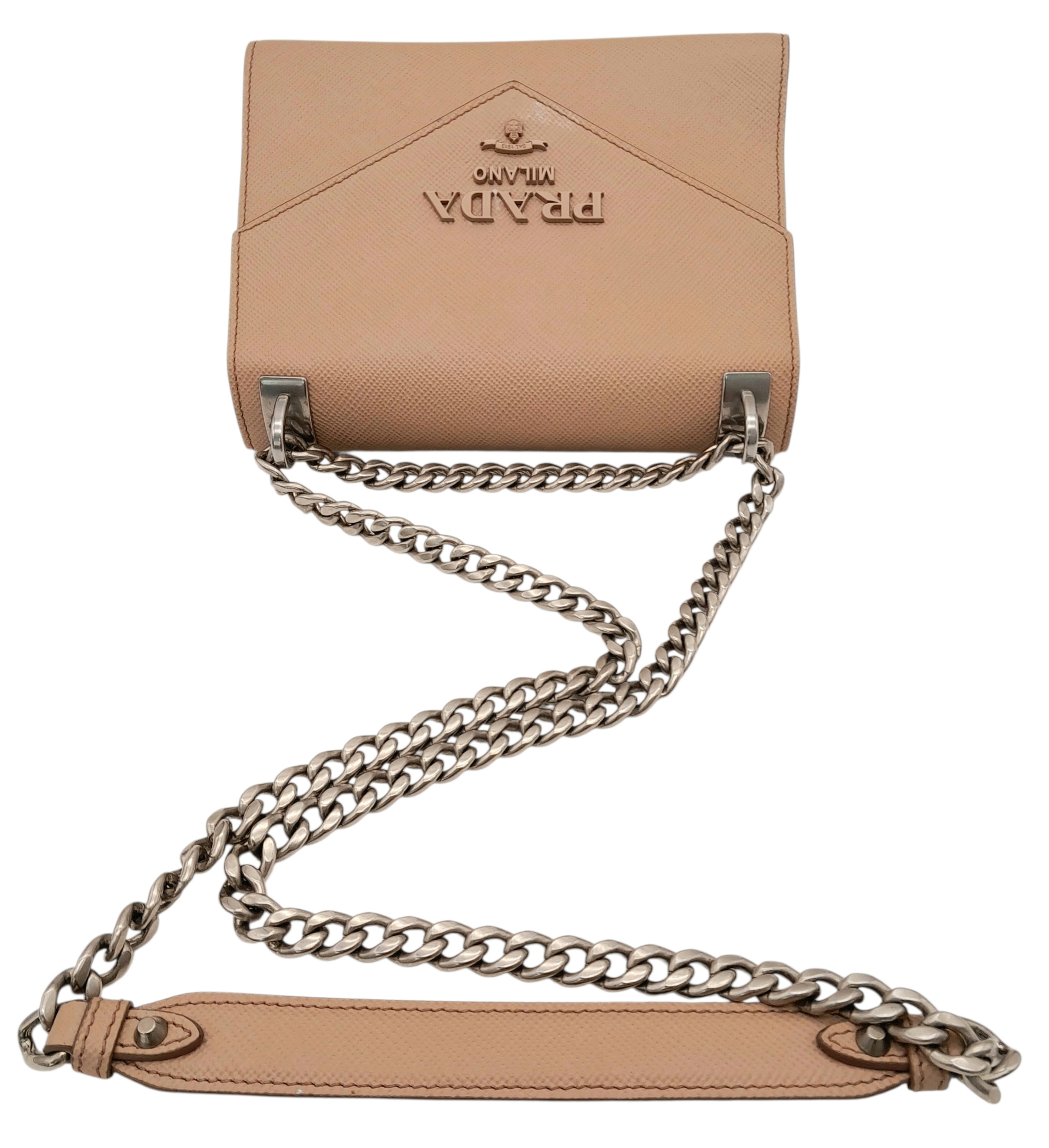 A Prada Dusty Pink Monochrome Shoulder Bag. Saffiano leather exterior with silver-toned hardware, chain strap and magnetic closure. Dusty pink leather and beige textile interior with an open side pocket. Comes with certificate of authenticity. Approximately 21cm length x 16.5cm height. A few light stains to interior and exterior but in good condition overall - please see photos for conditions or request a condition report. Ref: STK023725