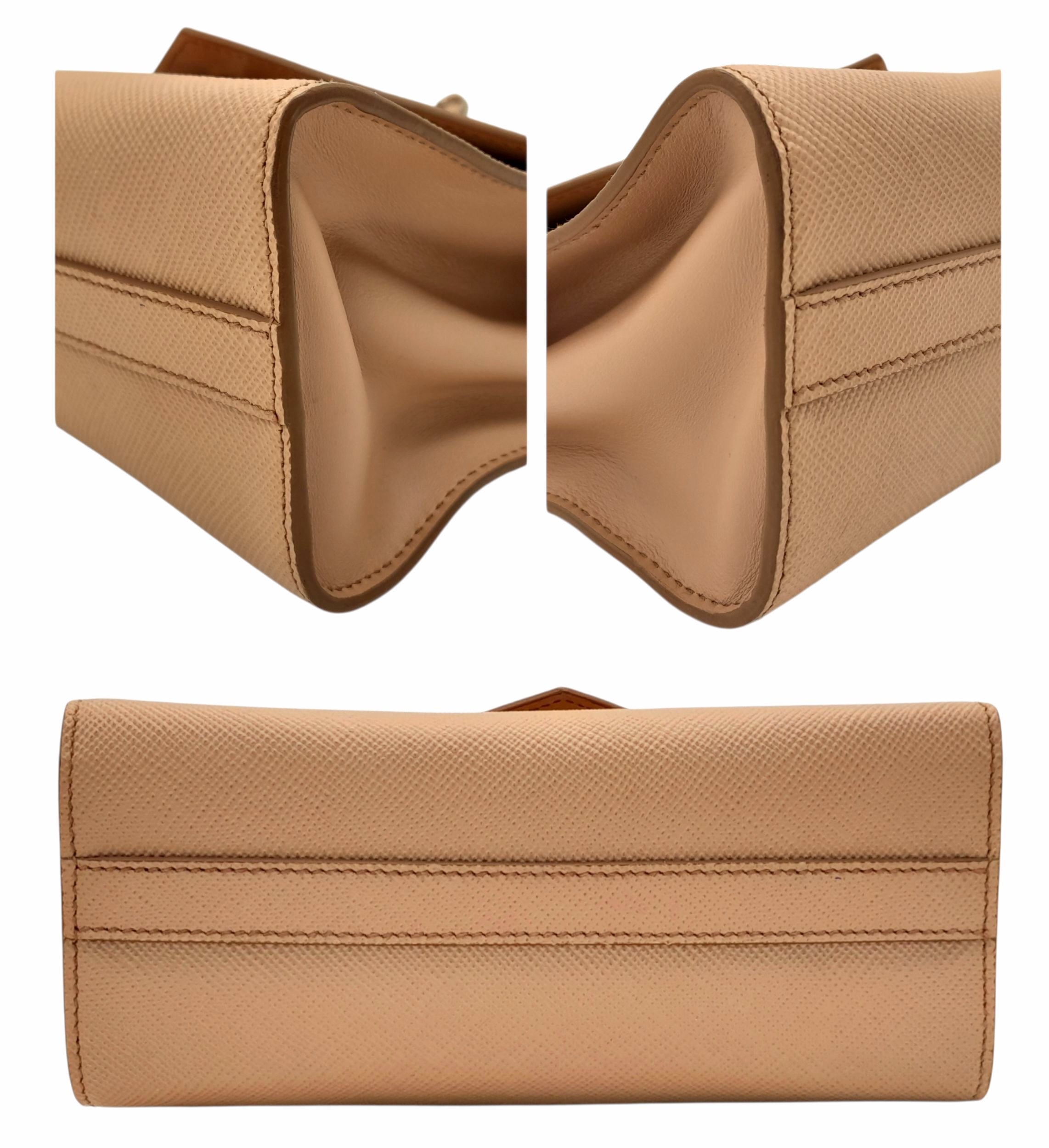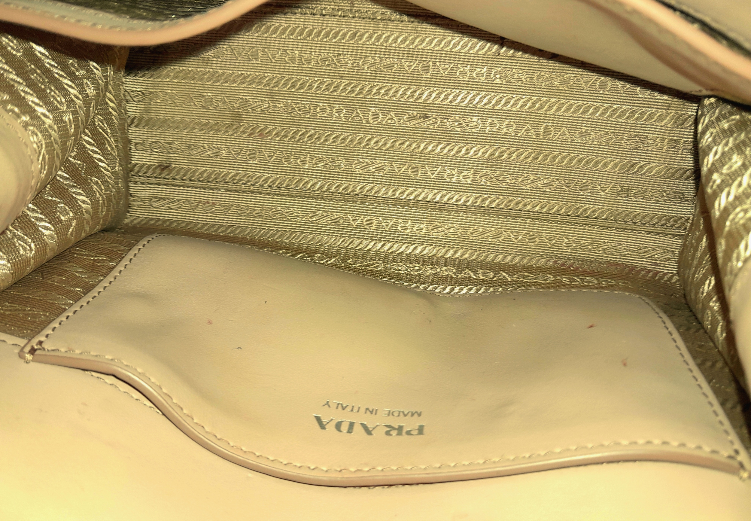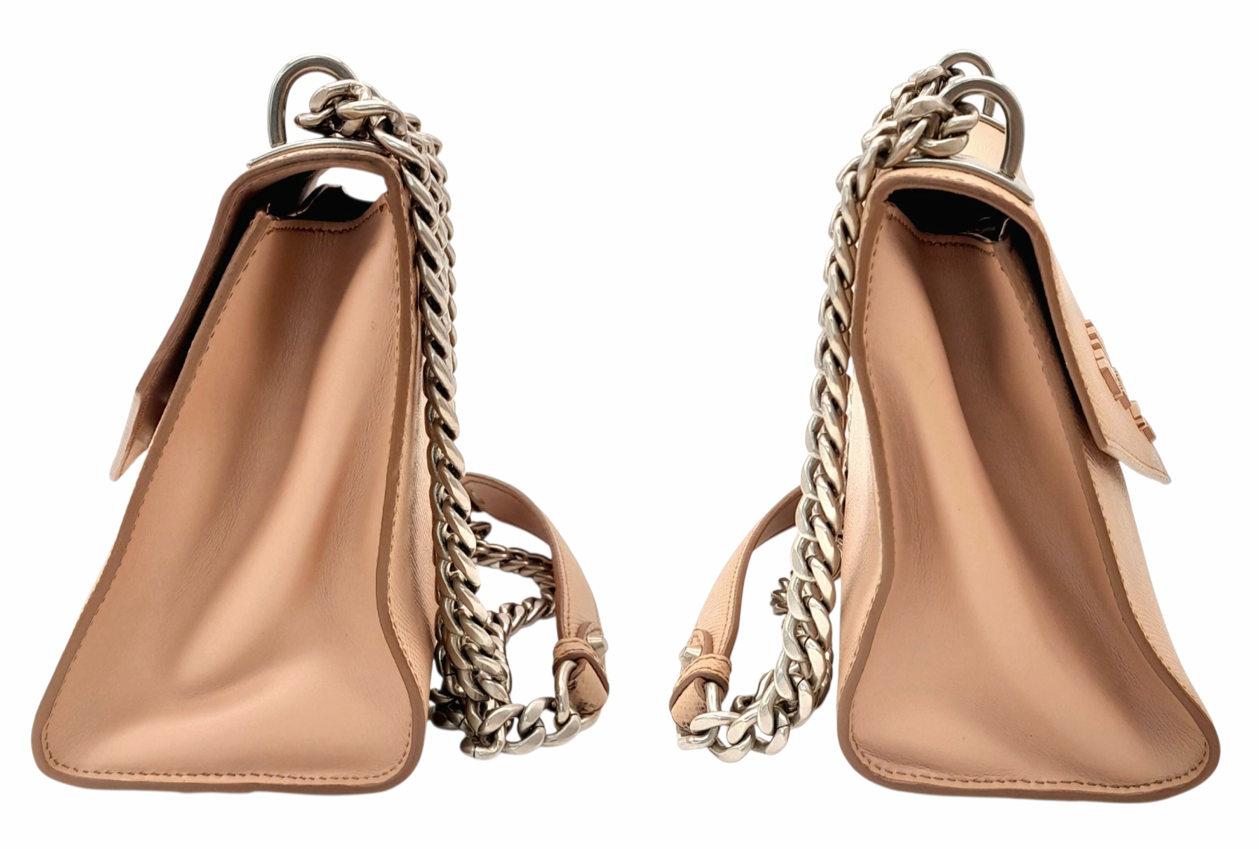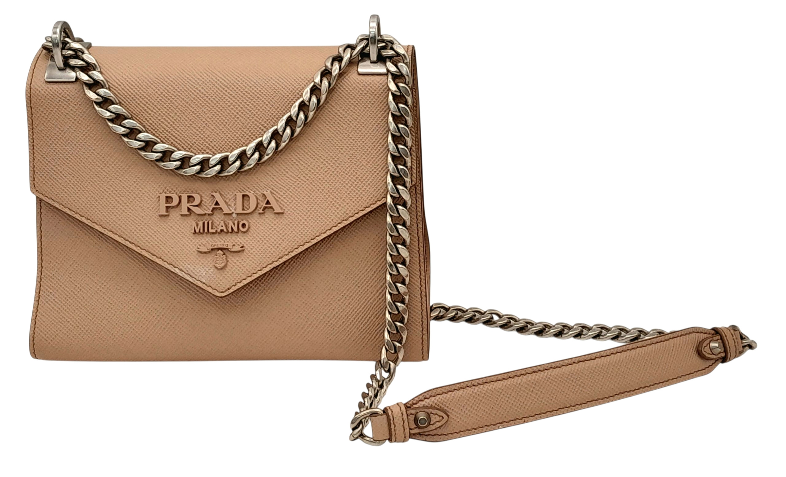 A Prada Dusty Pink Monochrome Shoulder Bag. Saffiano leather exterior with silver-toned hardware, chain strap and magnetic closure. Dusty pink leather and beige textile interior with an open side pocket. Comes with certificate of authenticity. Approximately 21cm length x 16.5cm height. A few light stains to interior and exterior but in good condition overall - please see photos for conditions or request a condition report. Ref: STK023725