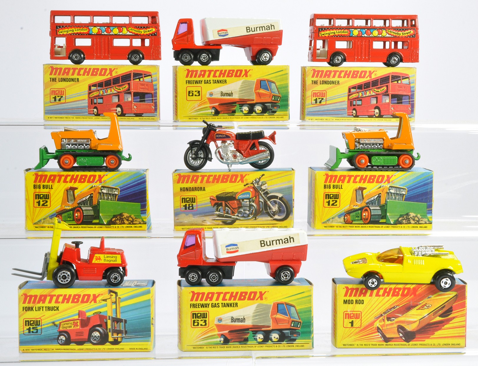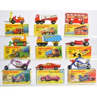 Matchbox Superfast comprising nine boxed issues as shown. Freeway Tanker x 2, London Bus, Mod Rod etc. Mostly very good or excellent in mostly very good/excellent boxes. Generally Ex-Shop Stock.