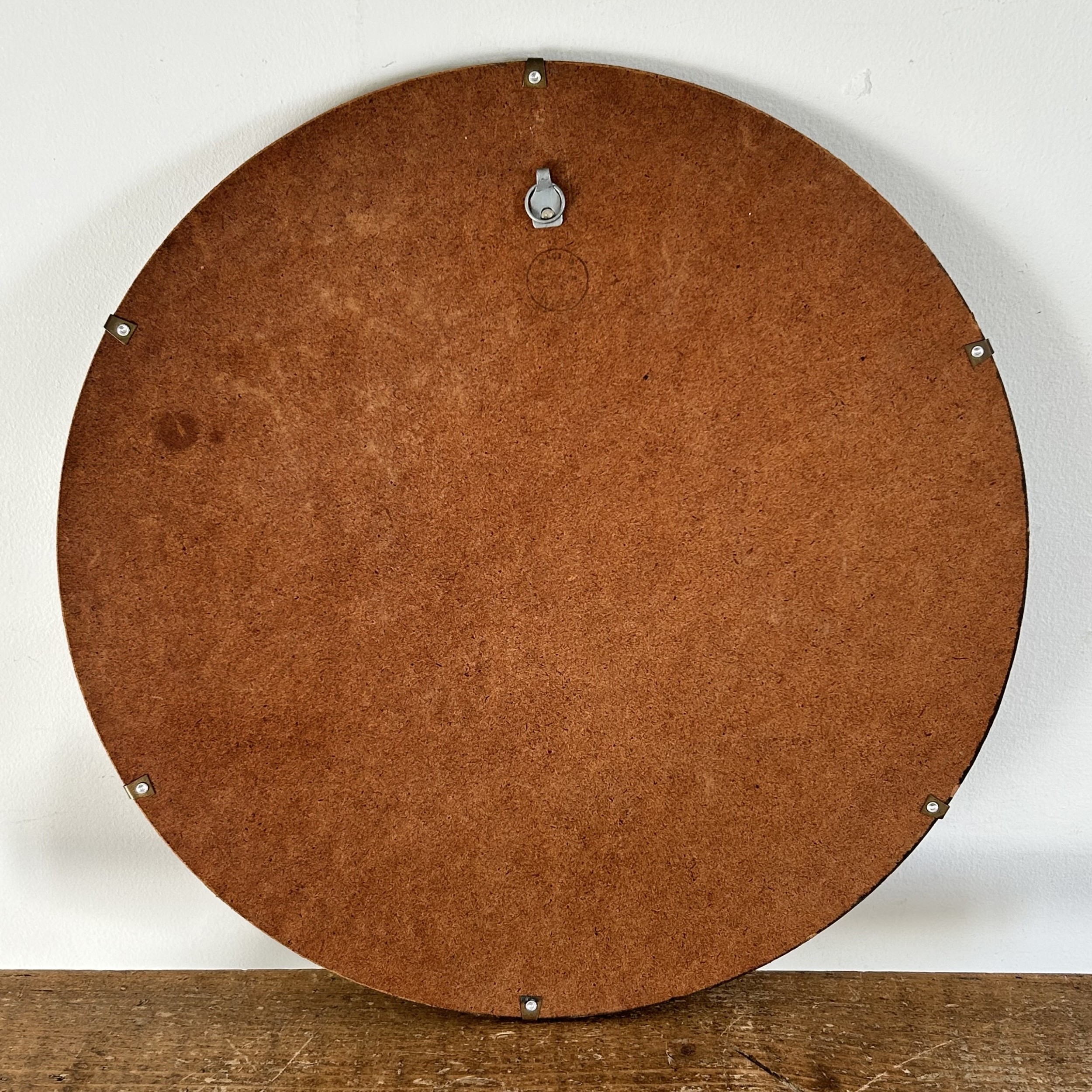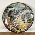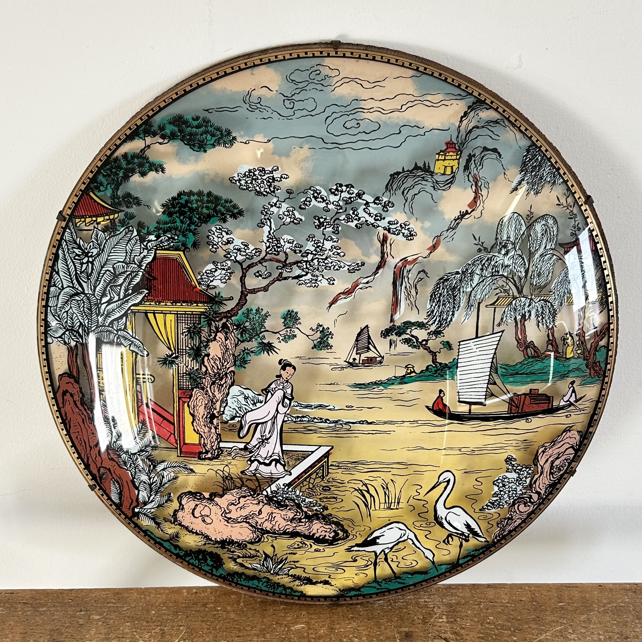 A vintage Oriental reverse decorated wall hanging on domed glass with figures and boats scene, approx. 16" diameter
