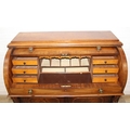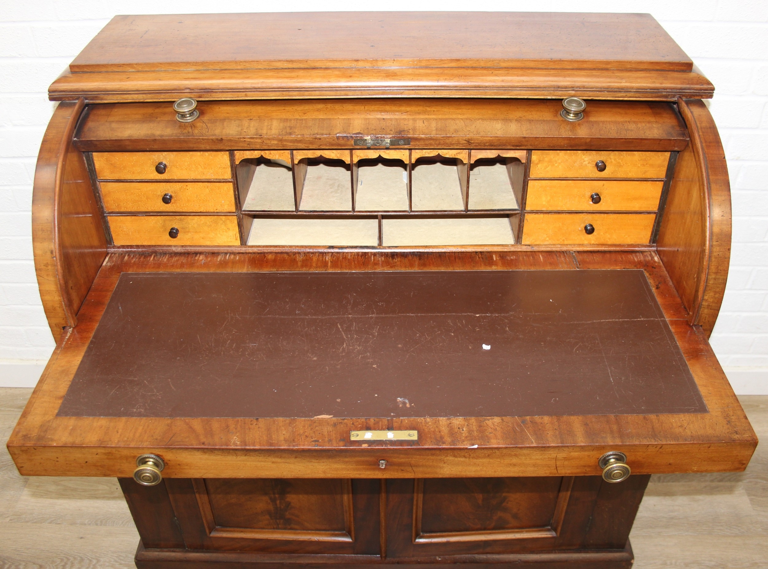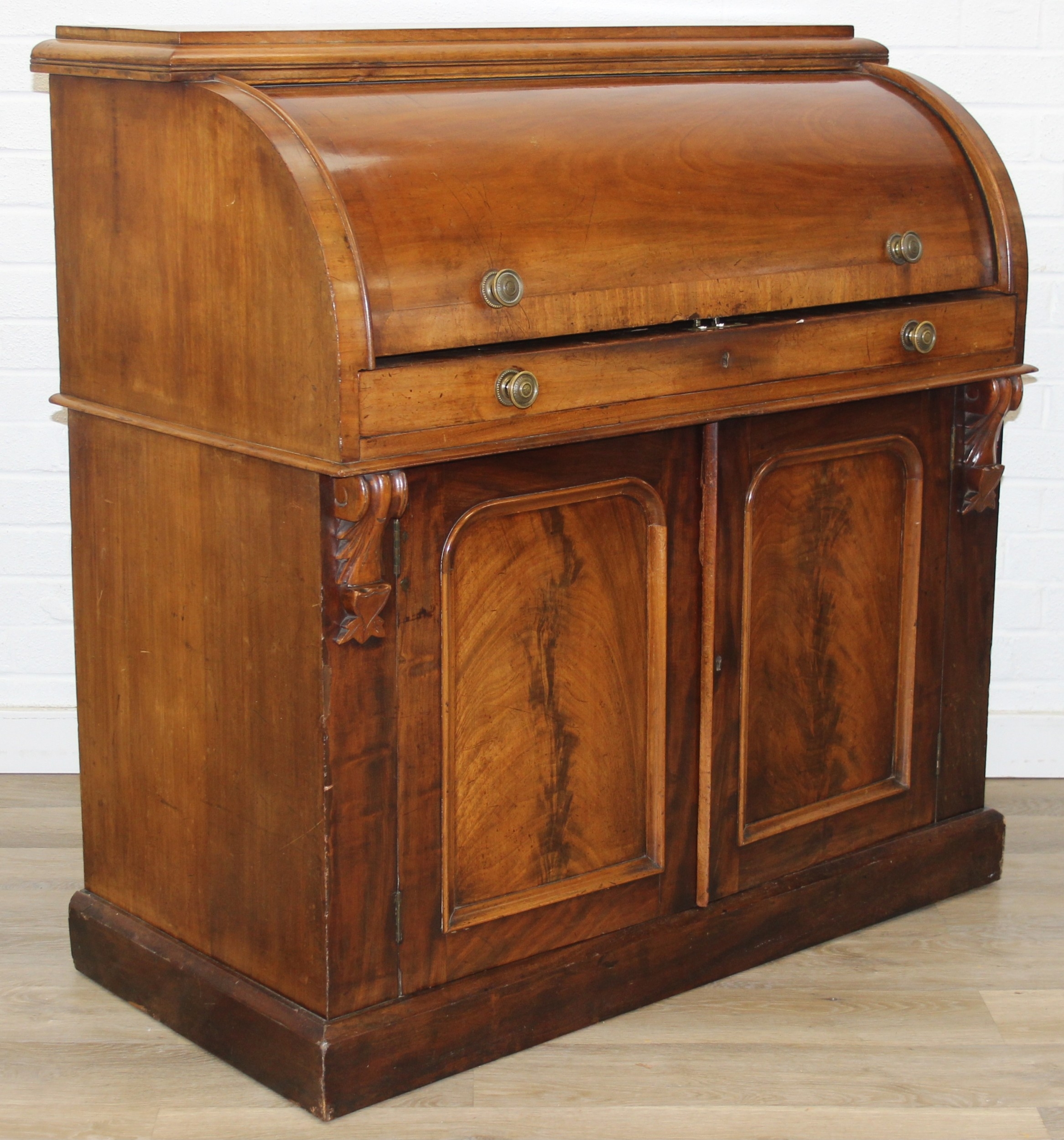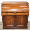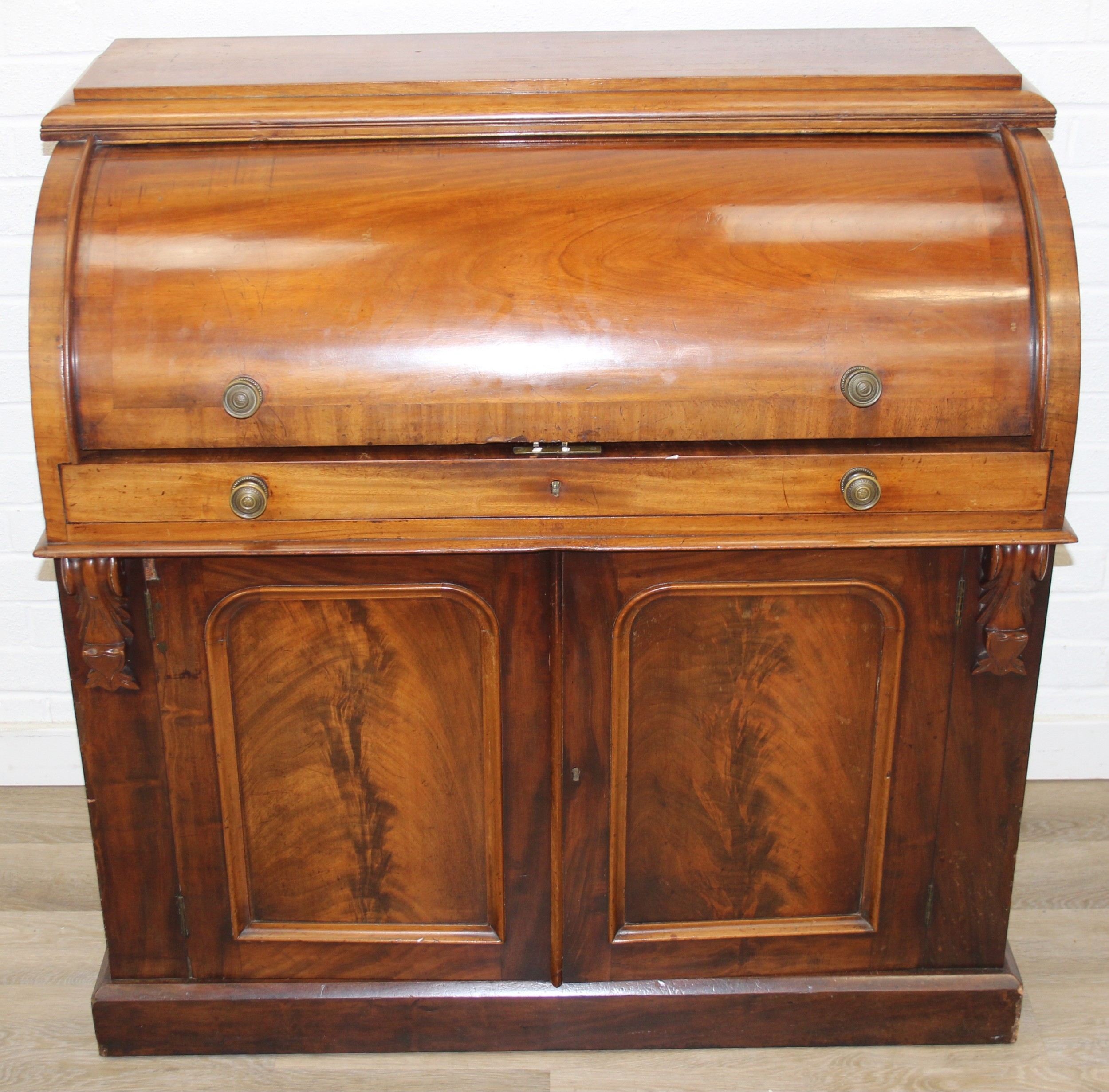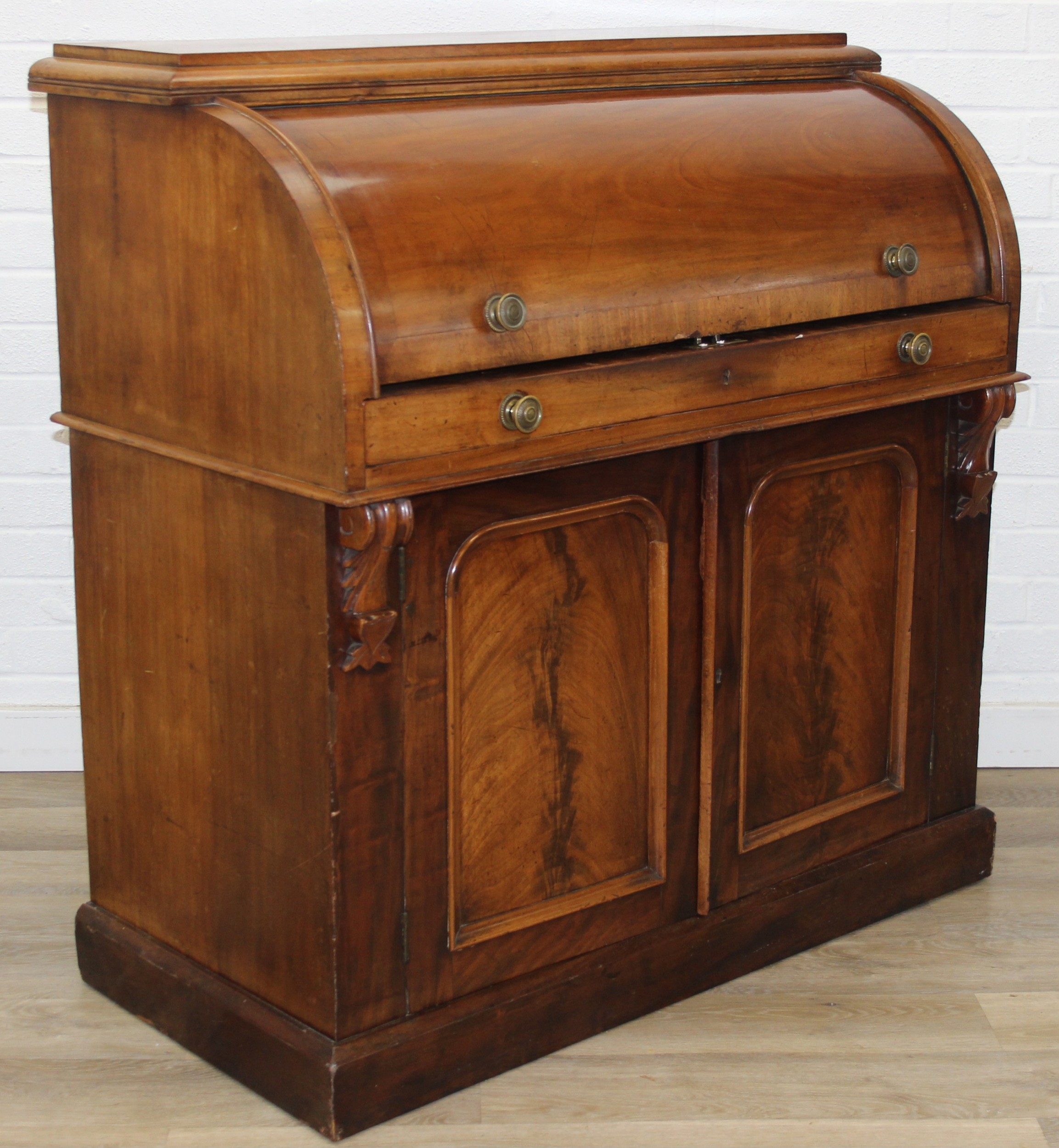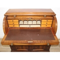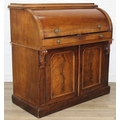 A Victorian mahogany rolltop desk with fitted interior above a cupboard, plinth base, brass mounts, 109cm x 55cm x 110cm