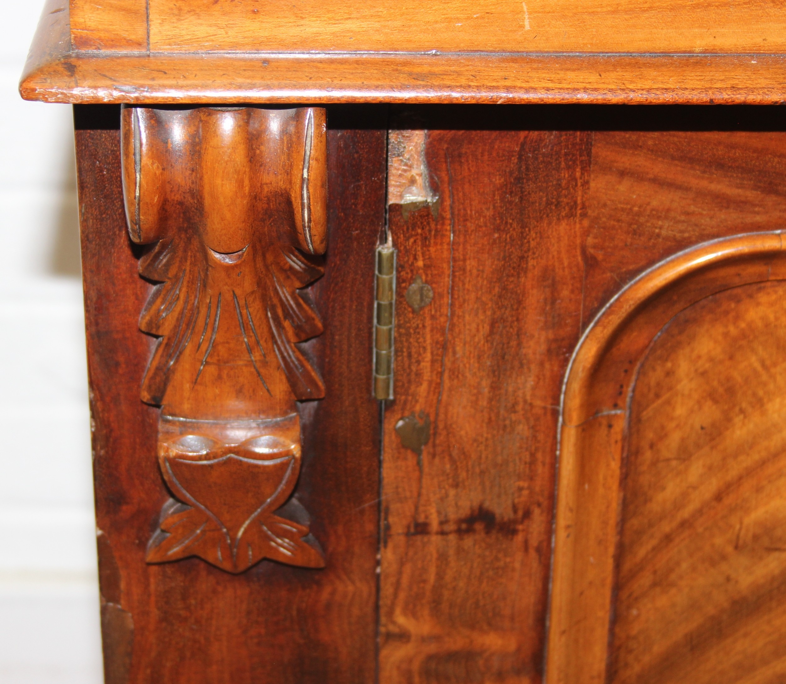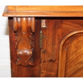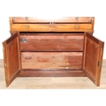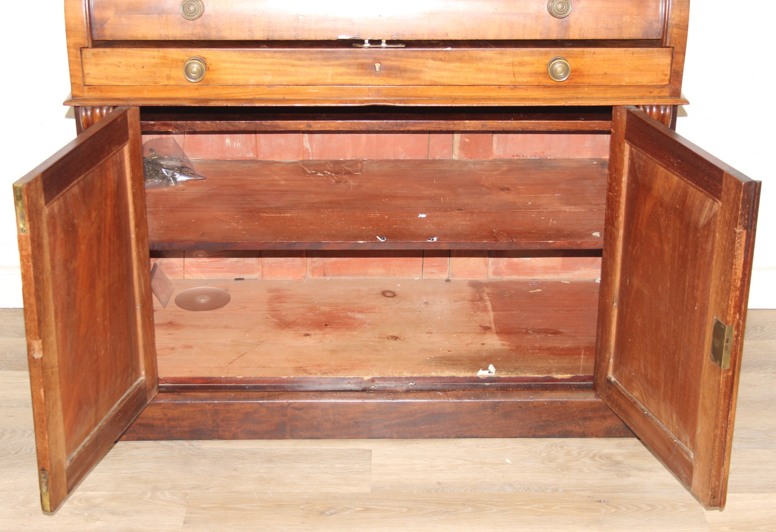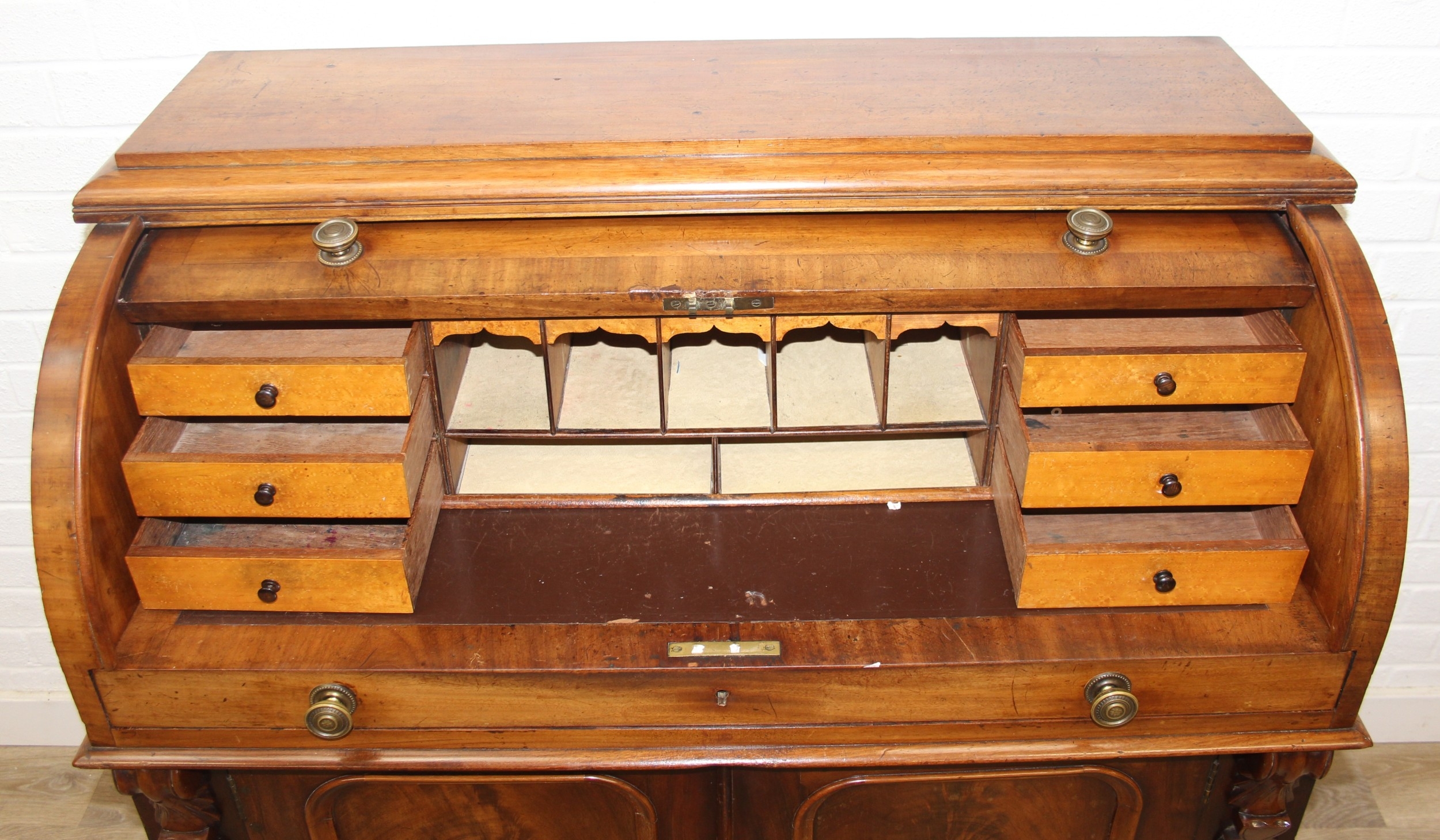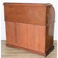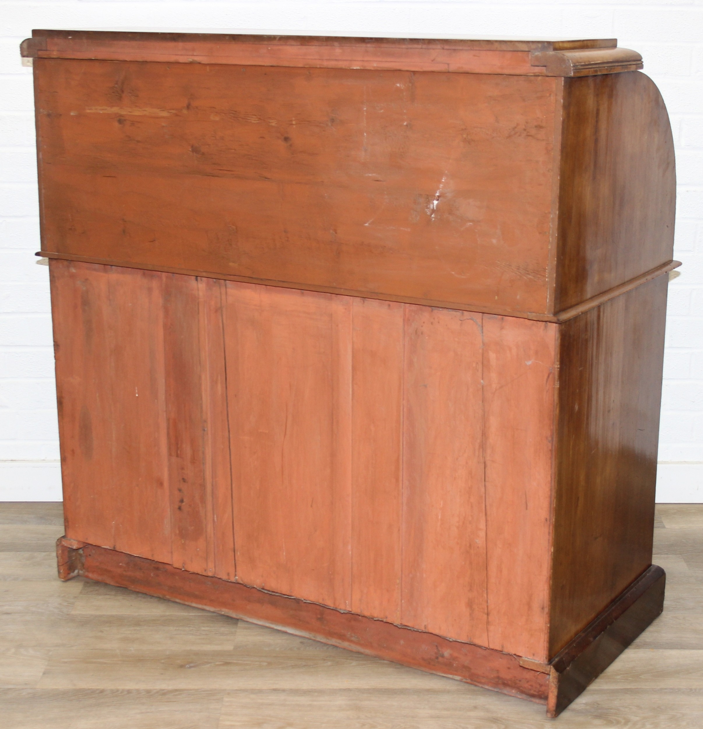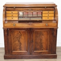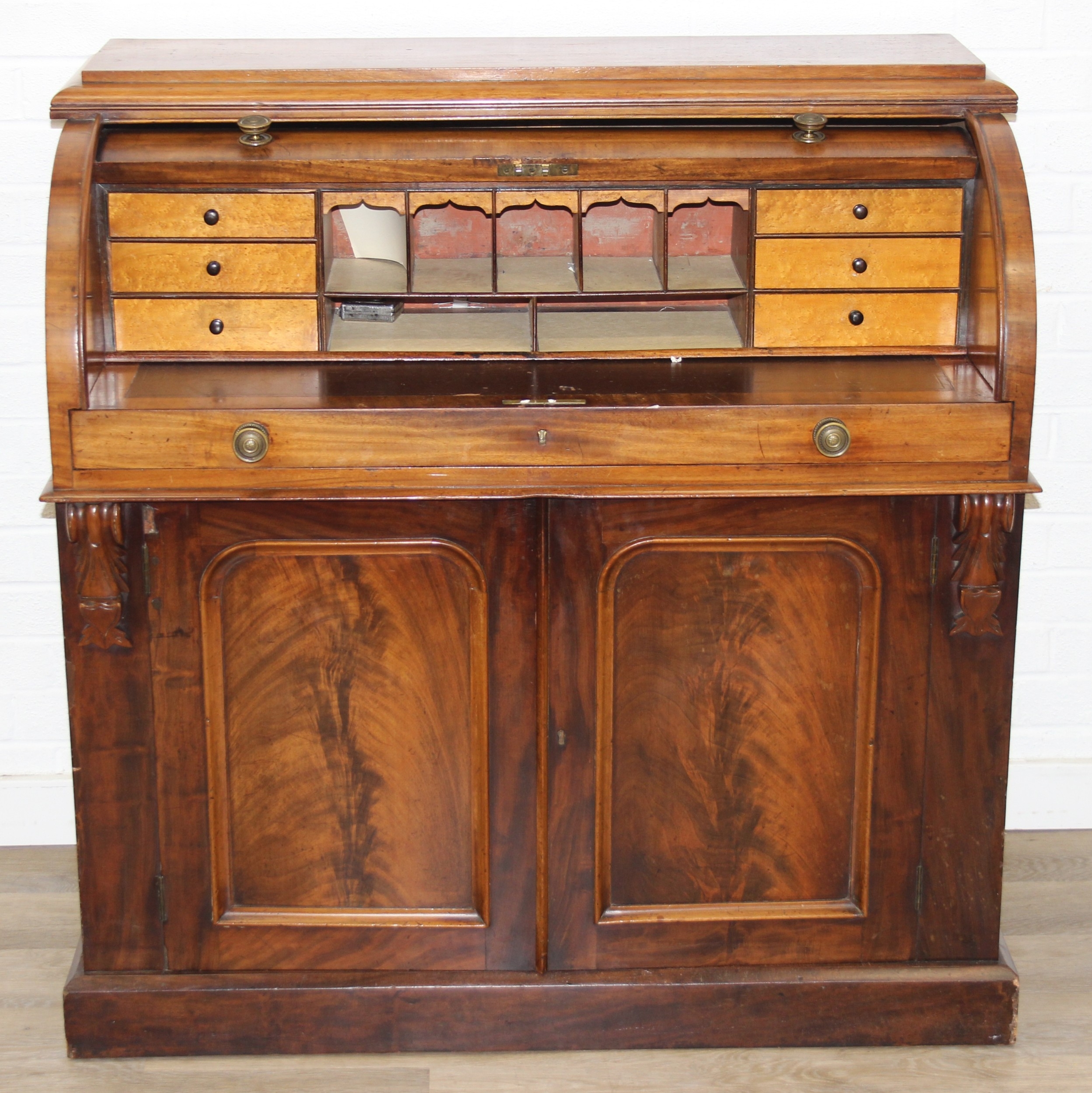 A Victorian mahogany rolltop desk with fitted interior above a cupboard, plinth base, brass mounts, 109cm x 55cm x 110cm