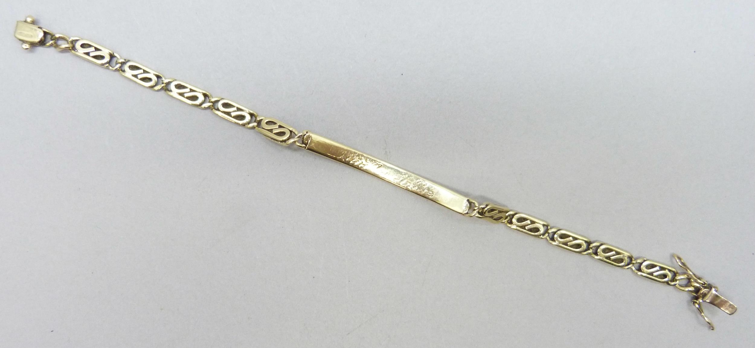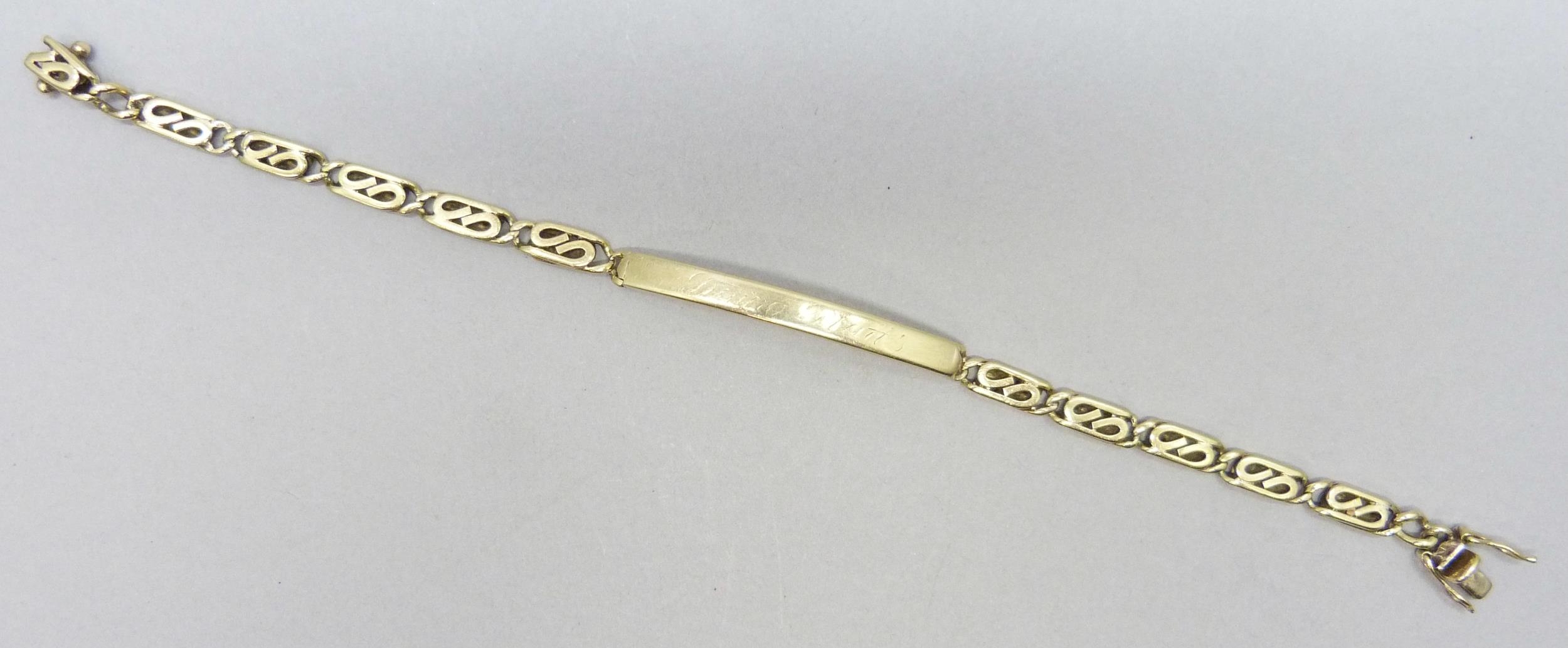 A yellow metal ID bracelet with personalised engraving, 11.1g, 18.3cm