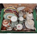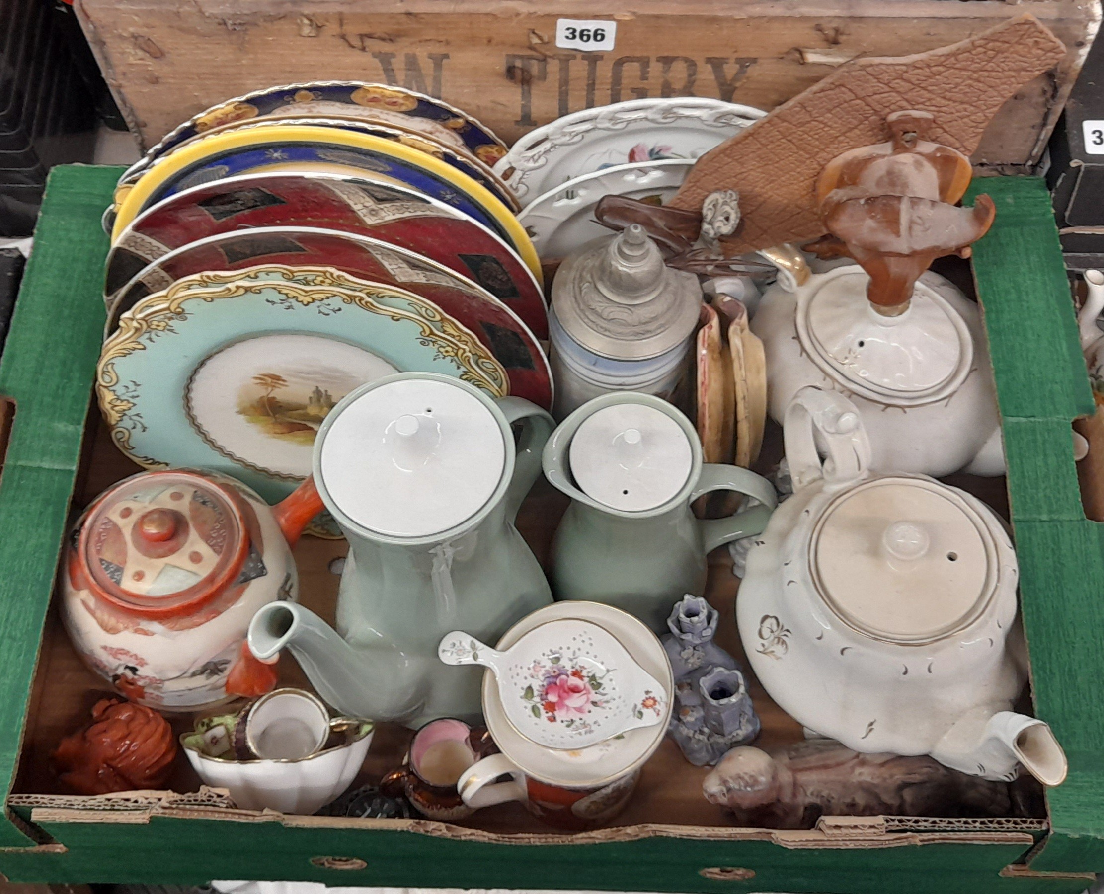 CRATE OF KUTANI WARE TEAPOT, 19TH CENTURY PORCELAIN AND VIENNA DECORATIVE PLATES, ROCKINGHAM STYLE TEAPOTS AND OTHERS