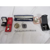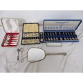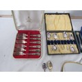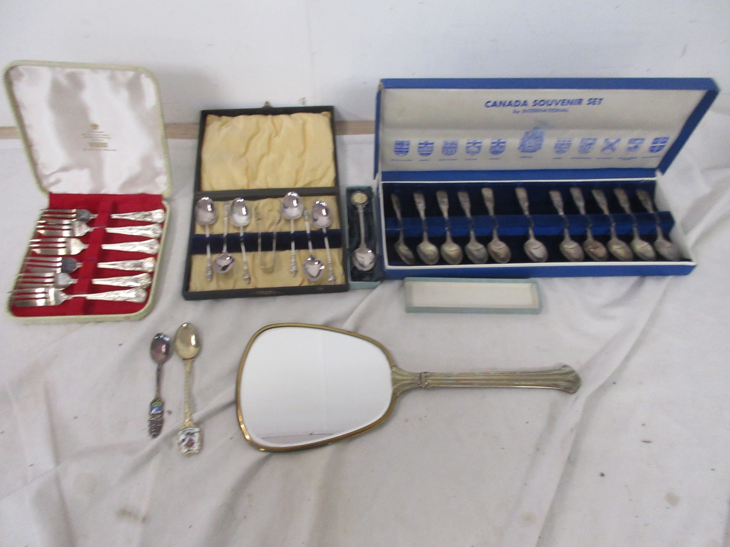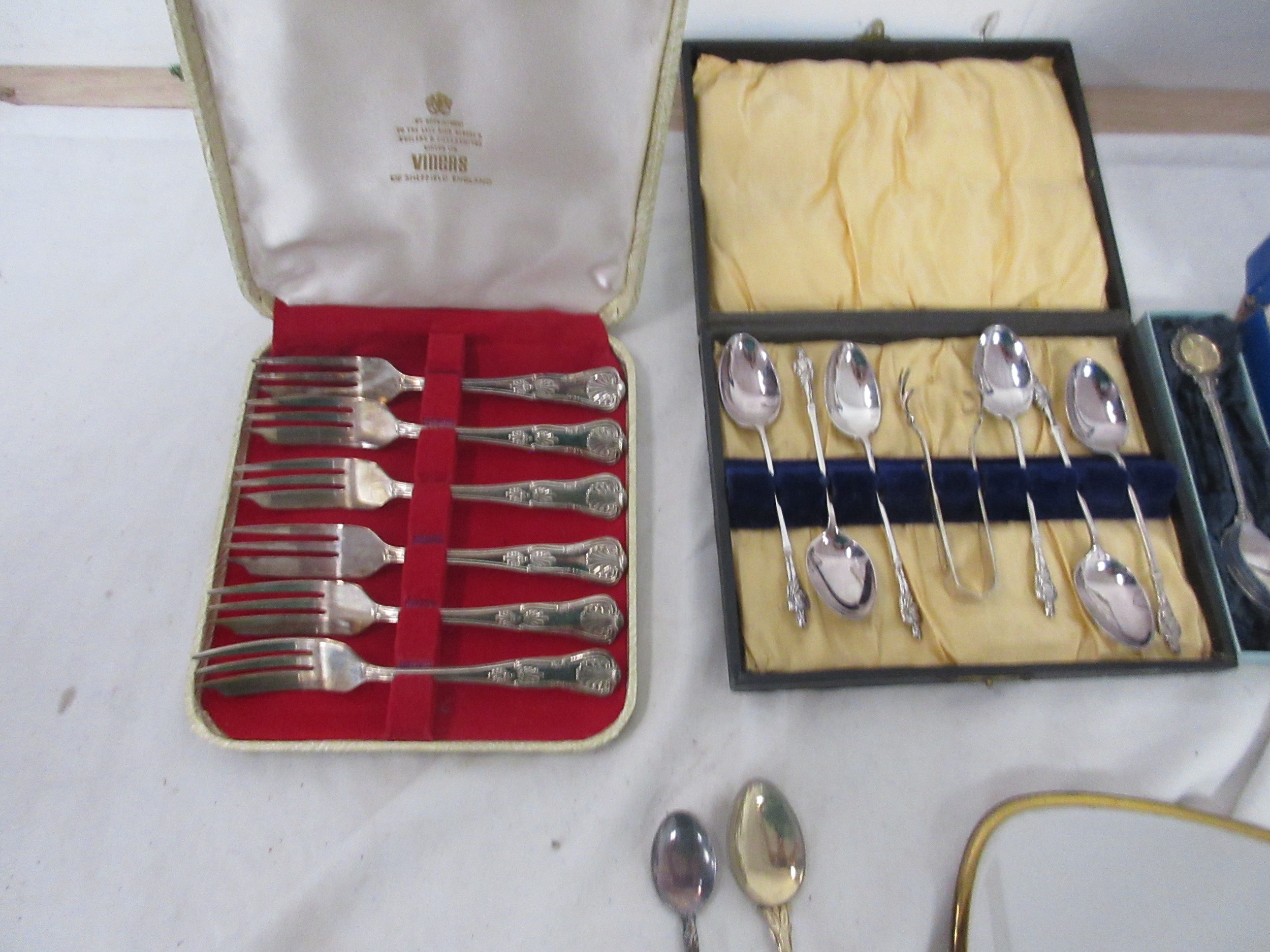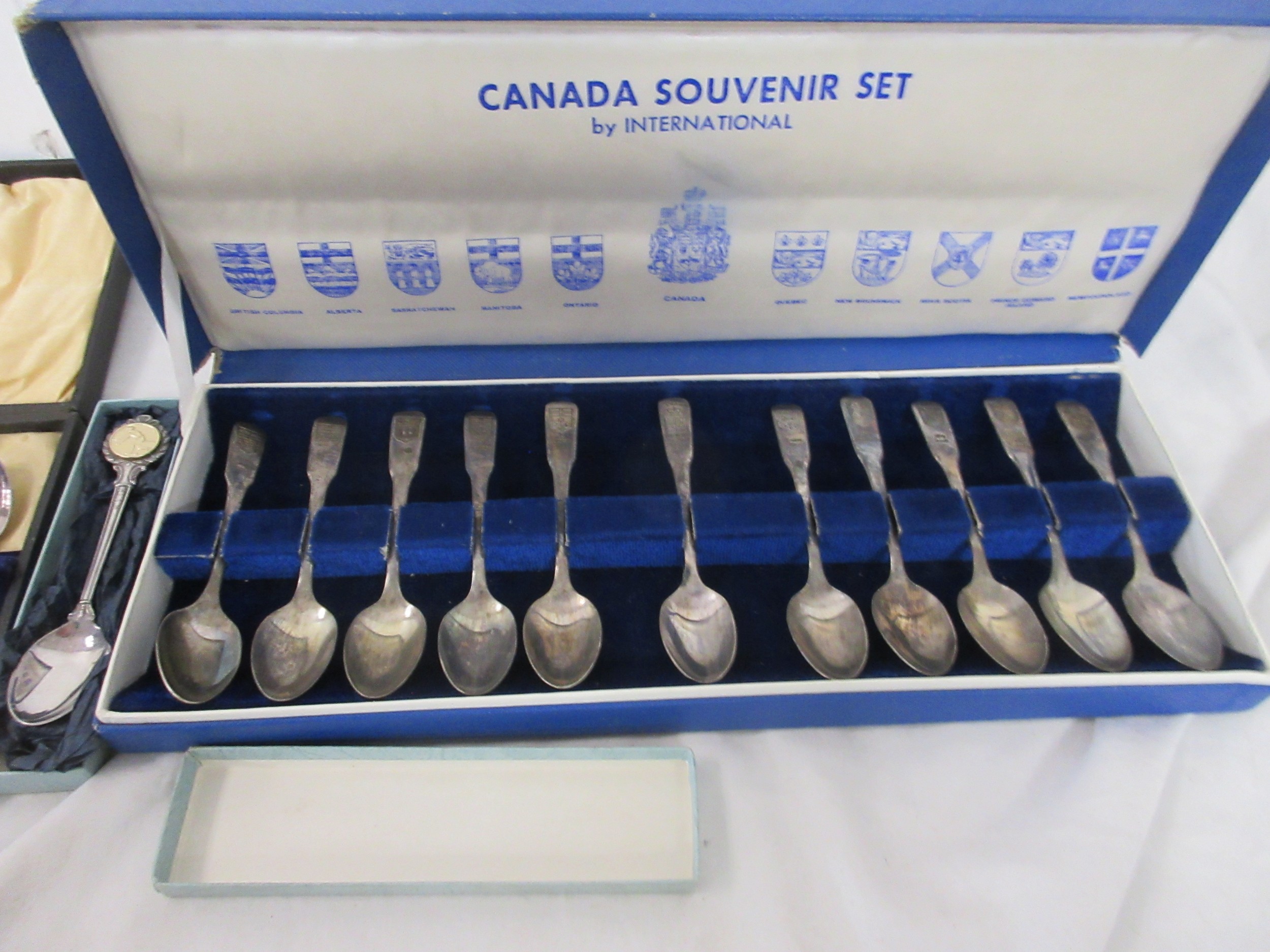 A set of silver plate apostle spoons by James Dixon & Sons, cased, with tongs, a cased set of Viners cake forks, a set of Canadian silver plate commemorative spoons and various other spoons