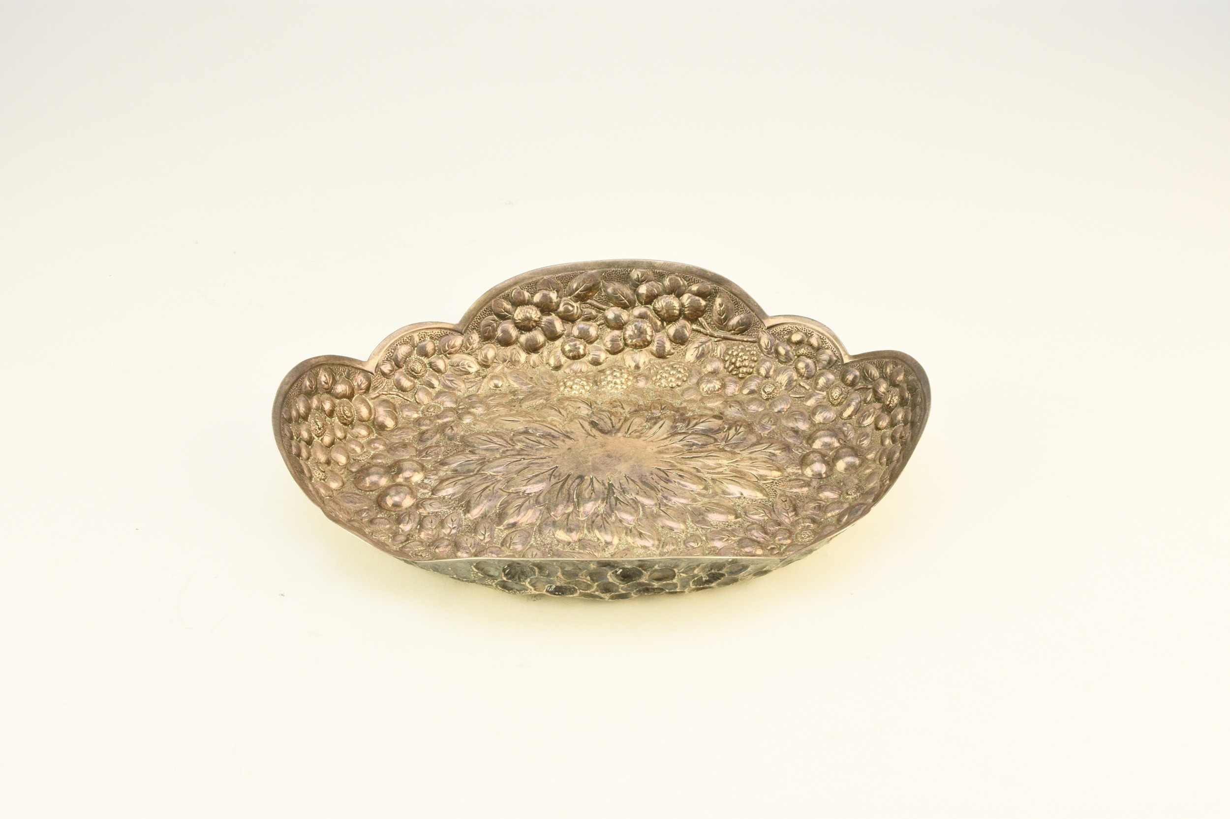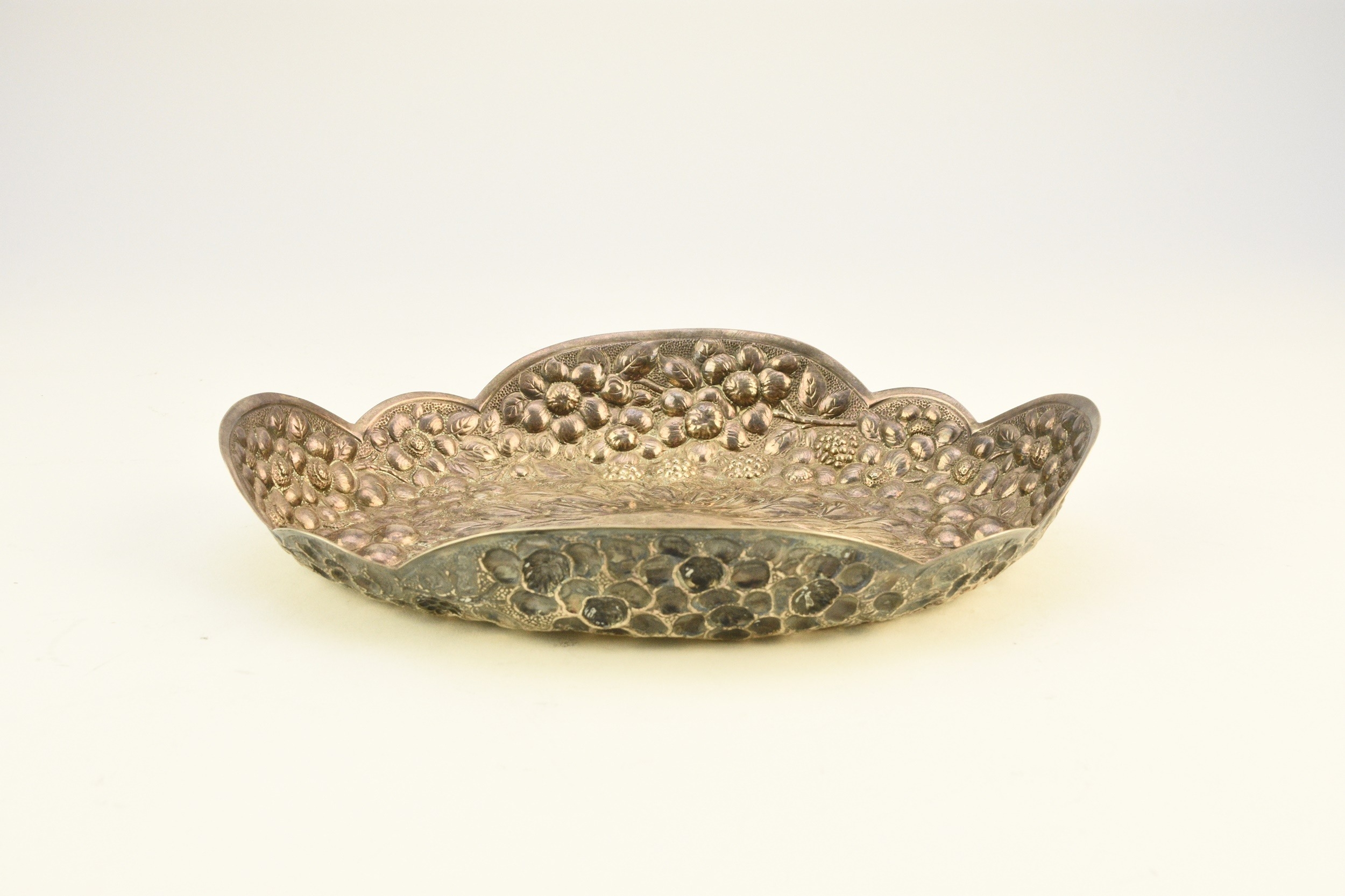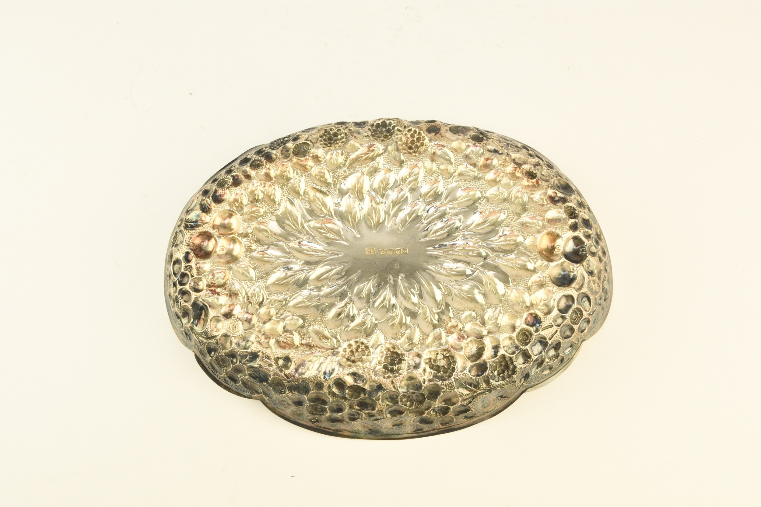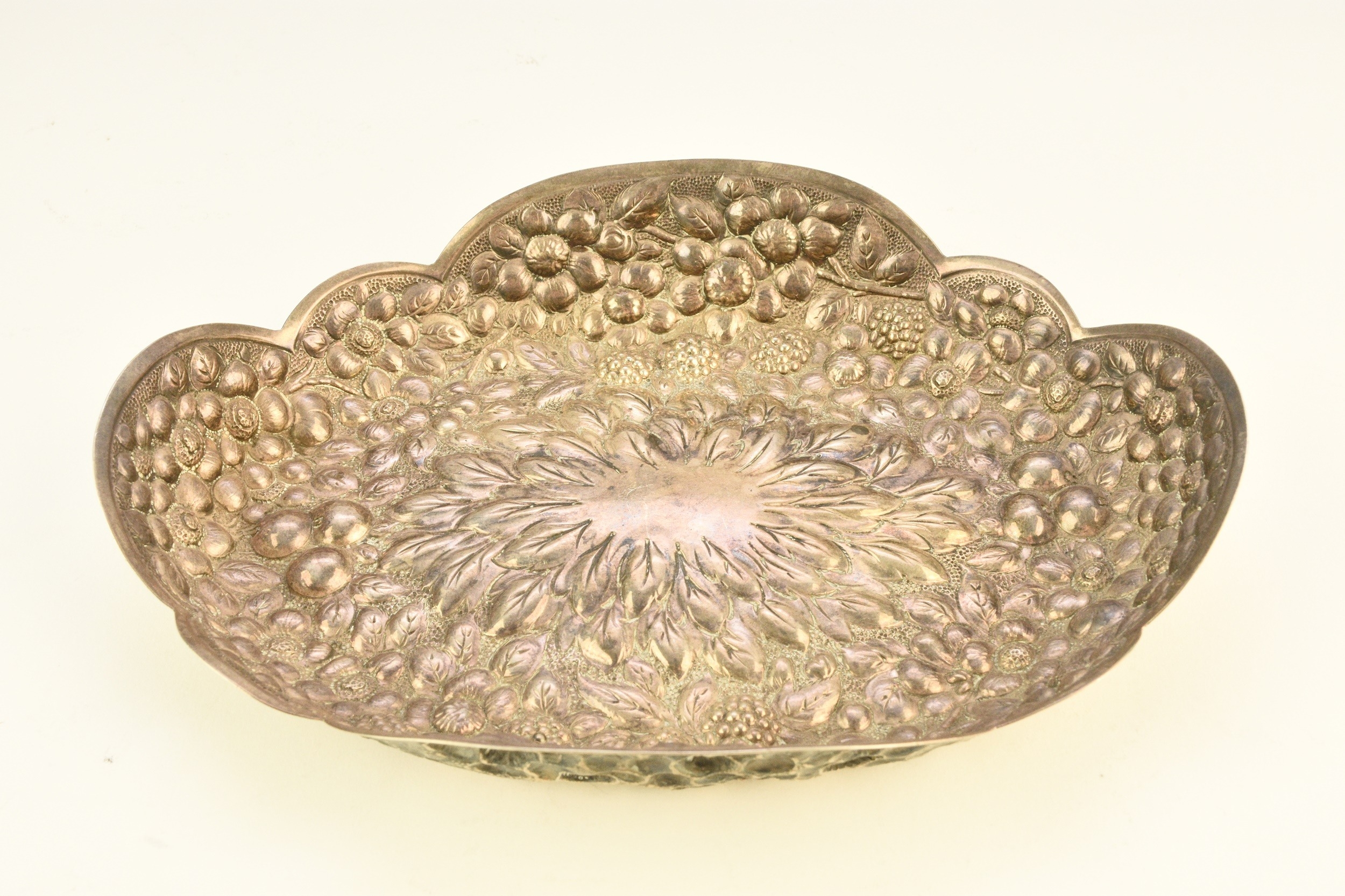 A Victorian silver embossed bowl, Atkin Brothers, Sheffield 1889, of shaped oval form with repoussé berry and flower decoration throughout, 22cm wide, weight approx 5.3oz