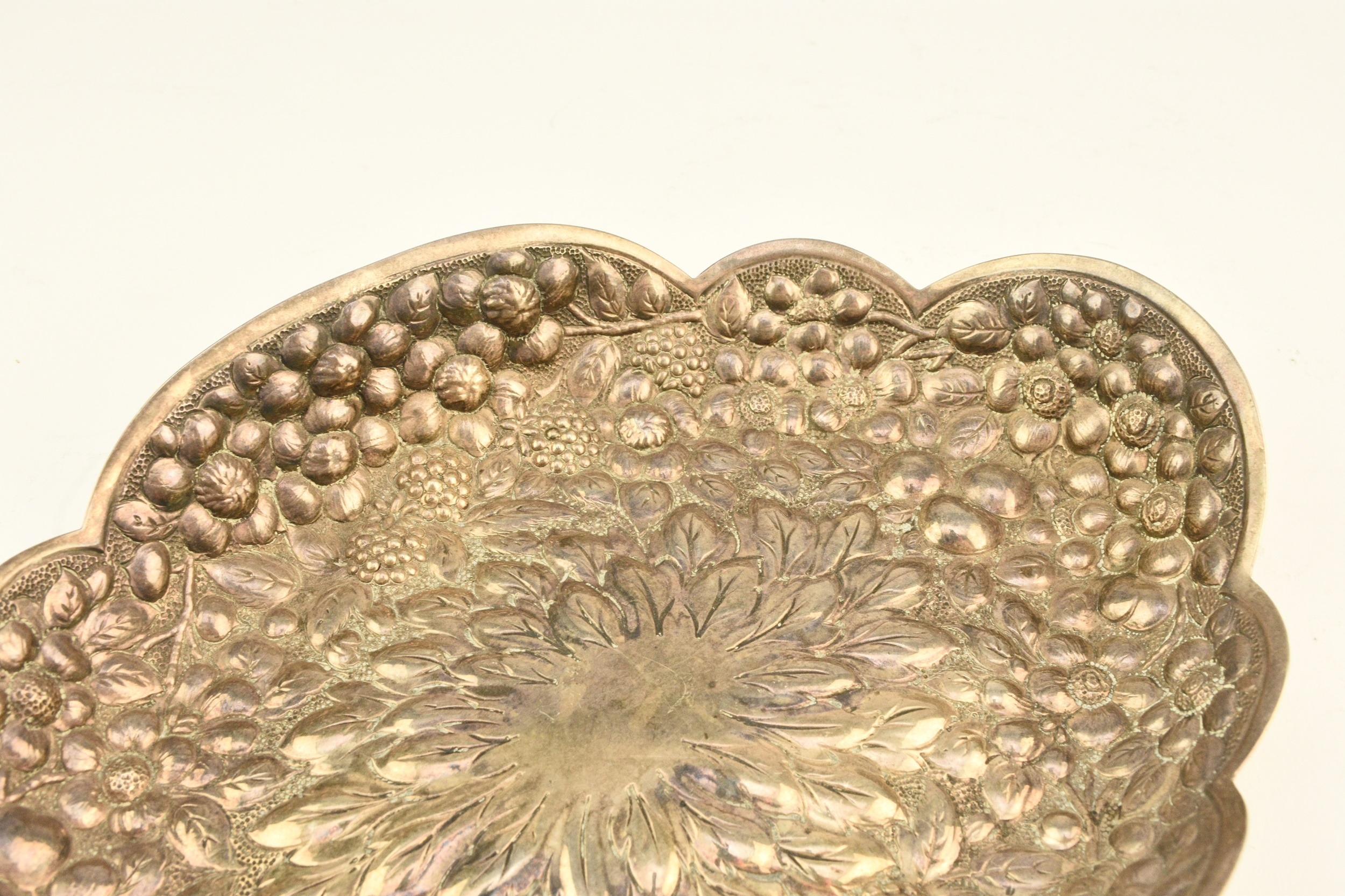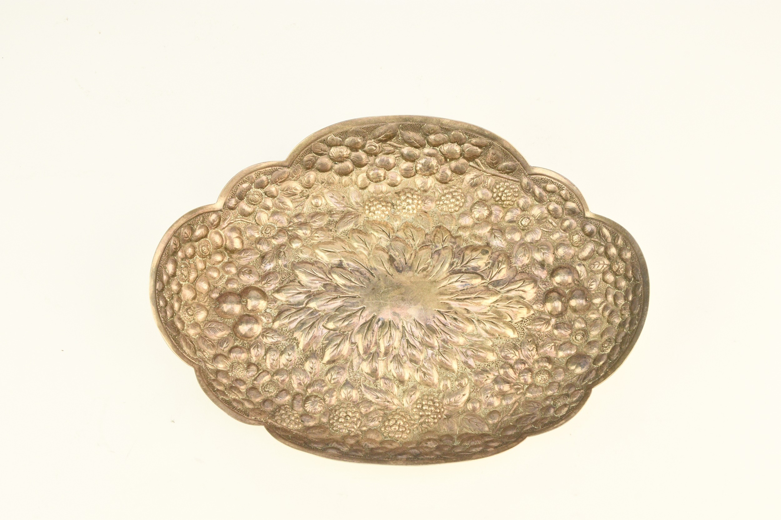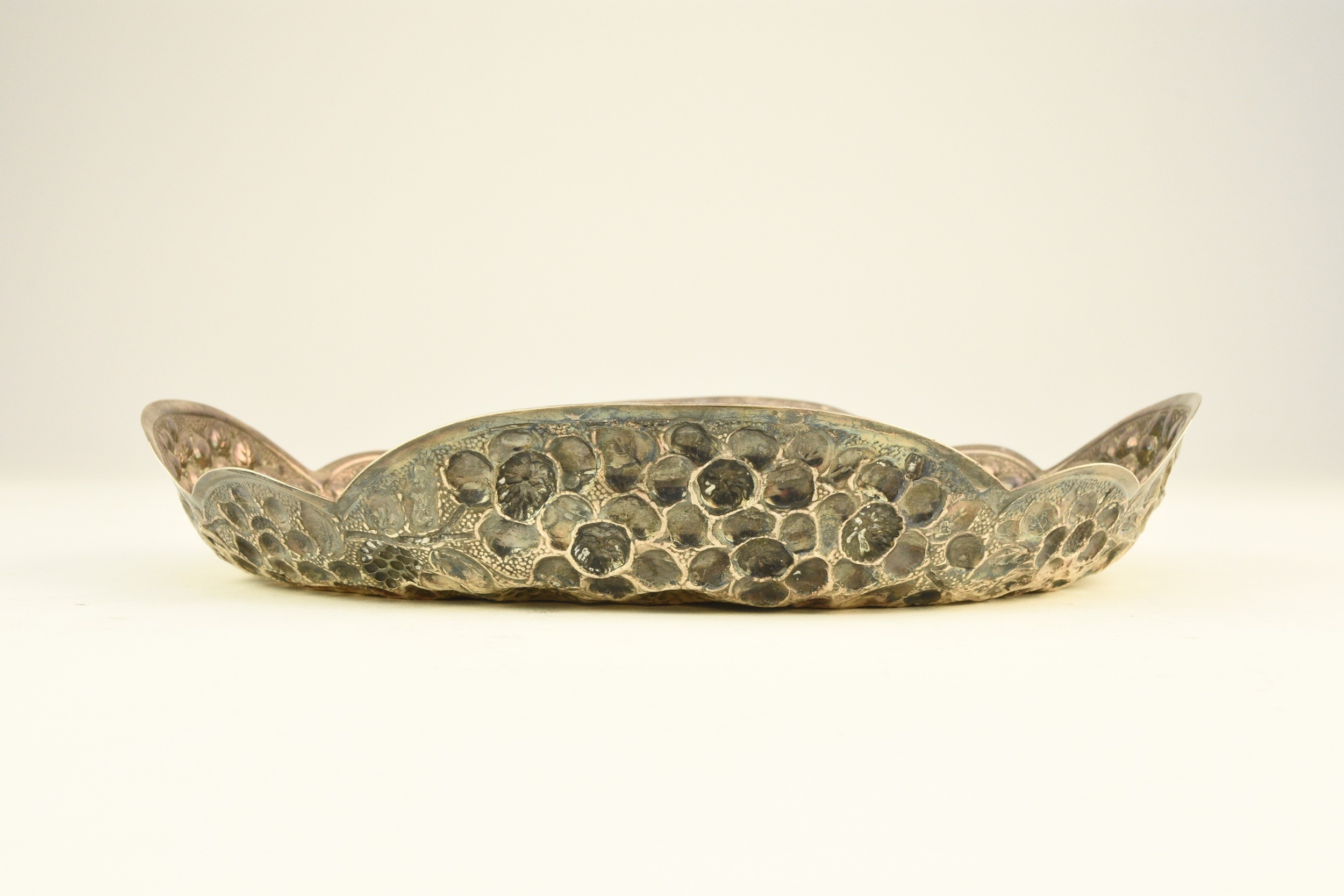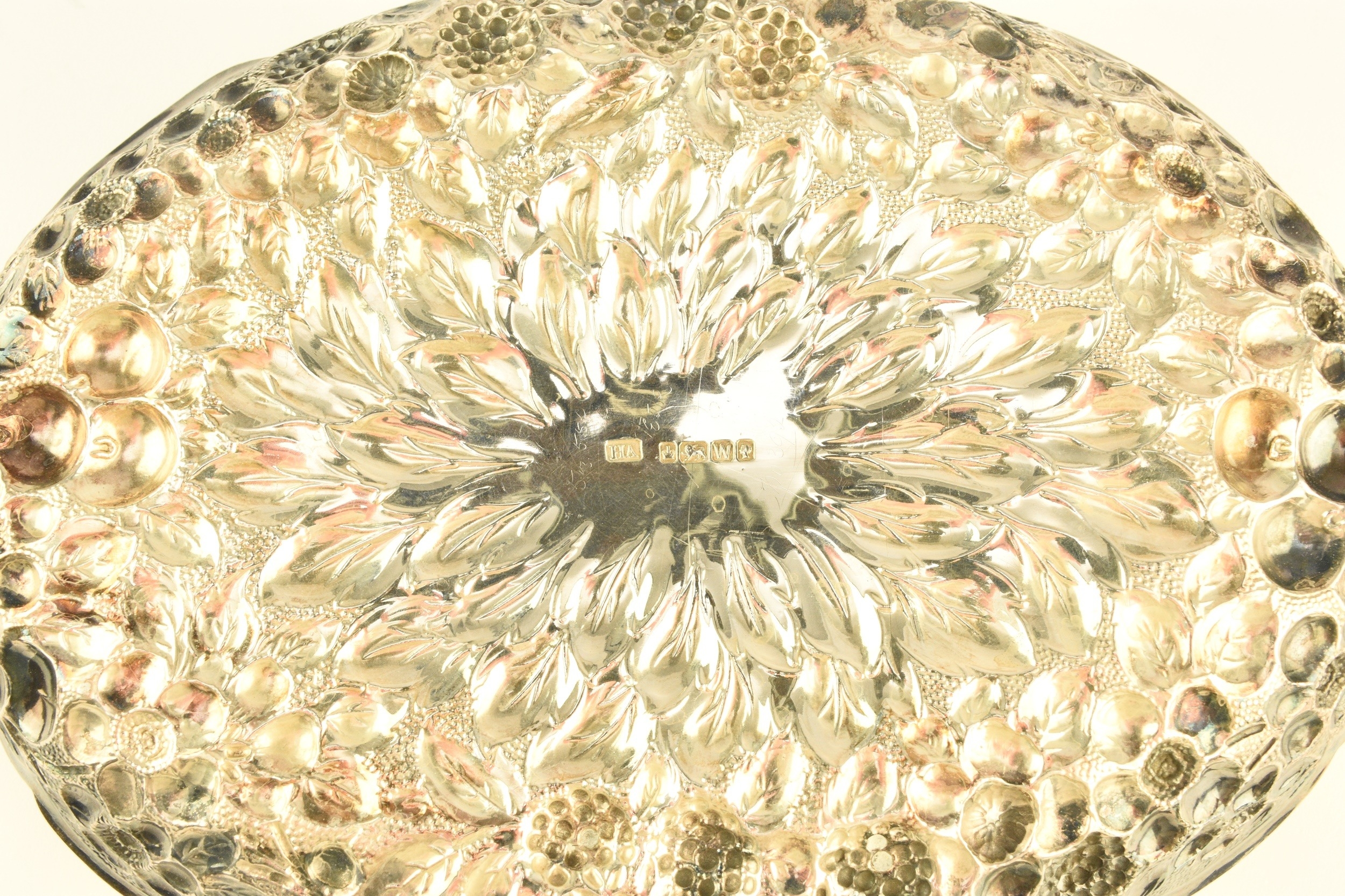 A Victorian silver embossed bowl, Atkin Brothers, Sheffield 1889, of shaped oval form with repoussé berry and flower decoration throughout, 22cm wide, weight approx 5.3oz