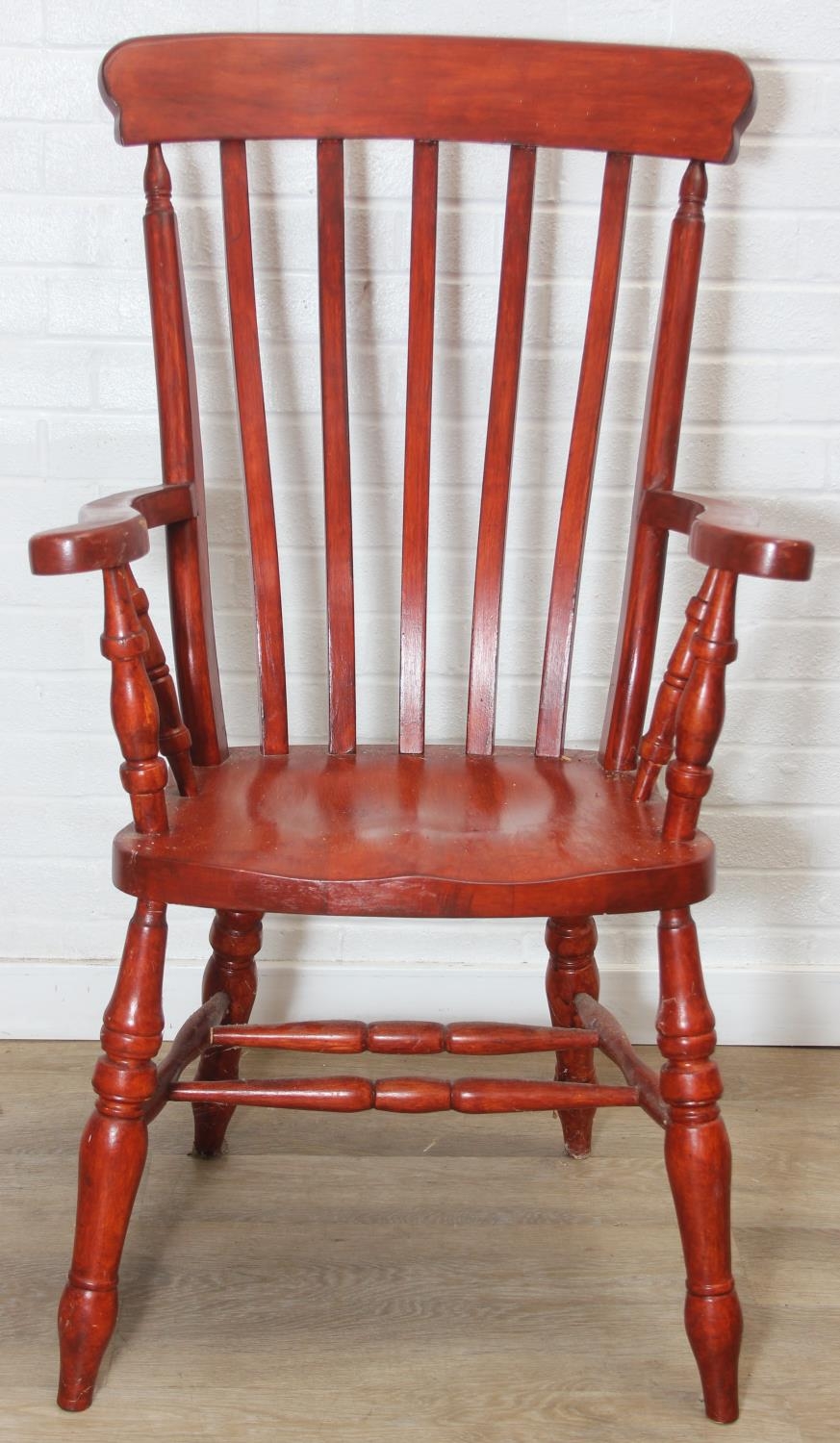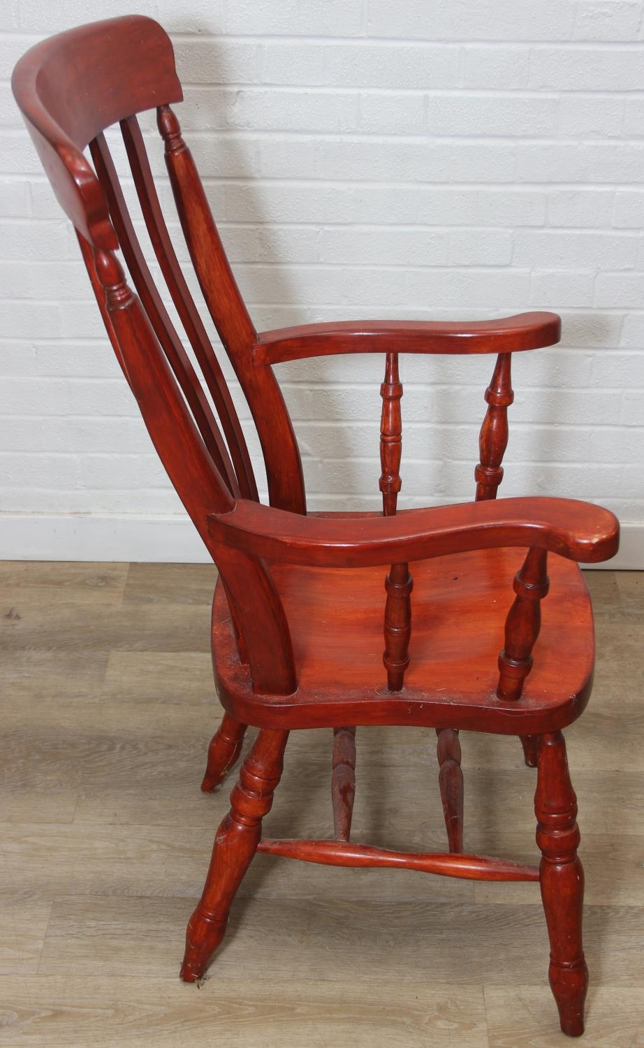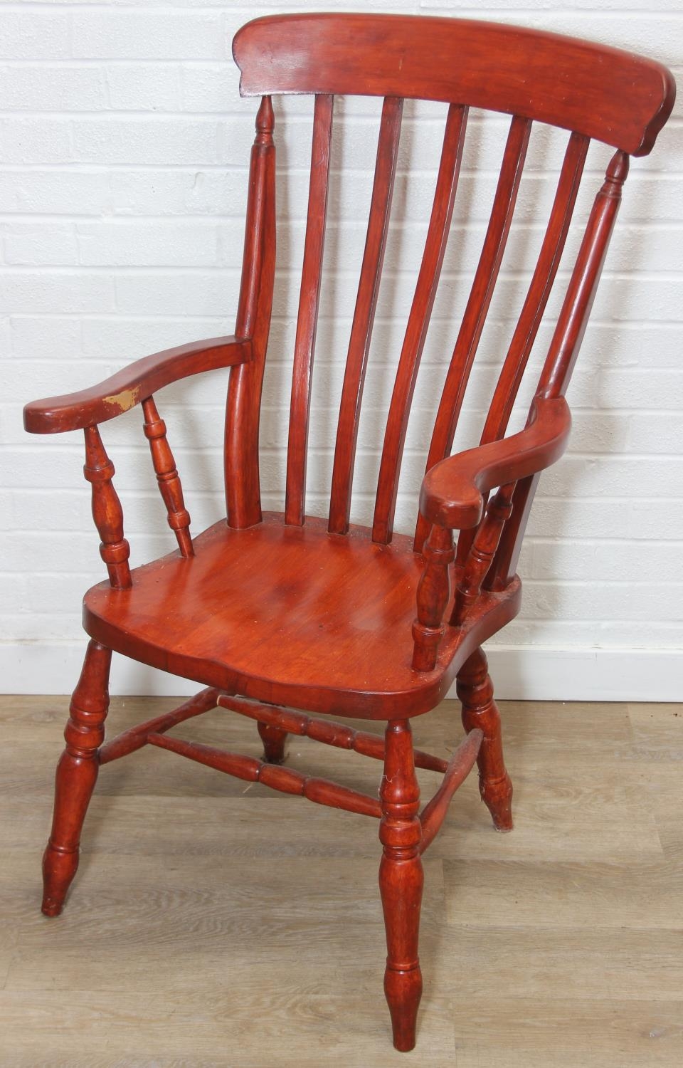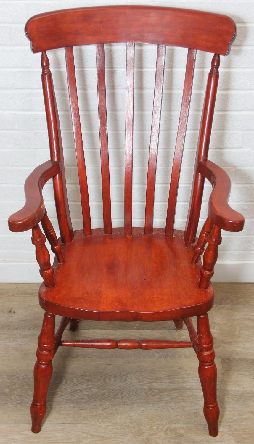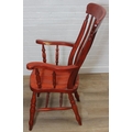 An antique style stained wooden slat-back Windsor farmhouse armchair, 62cm wide x 118cm tall
