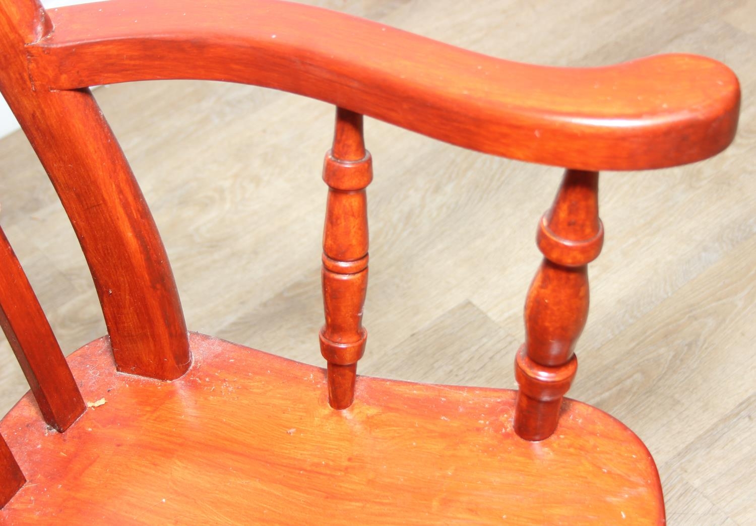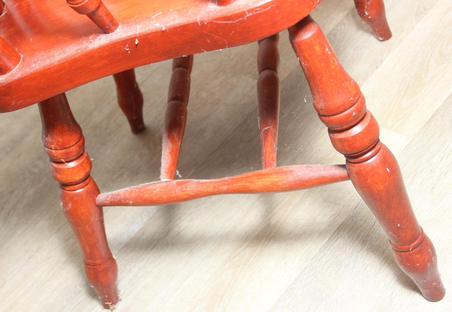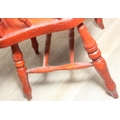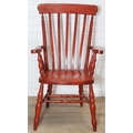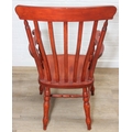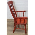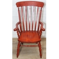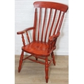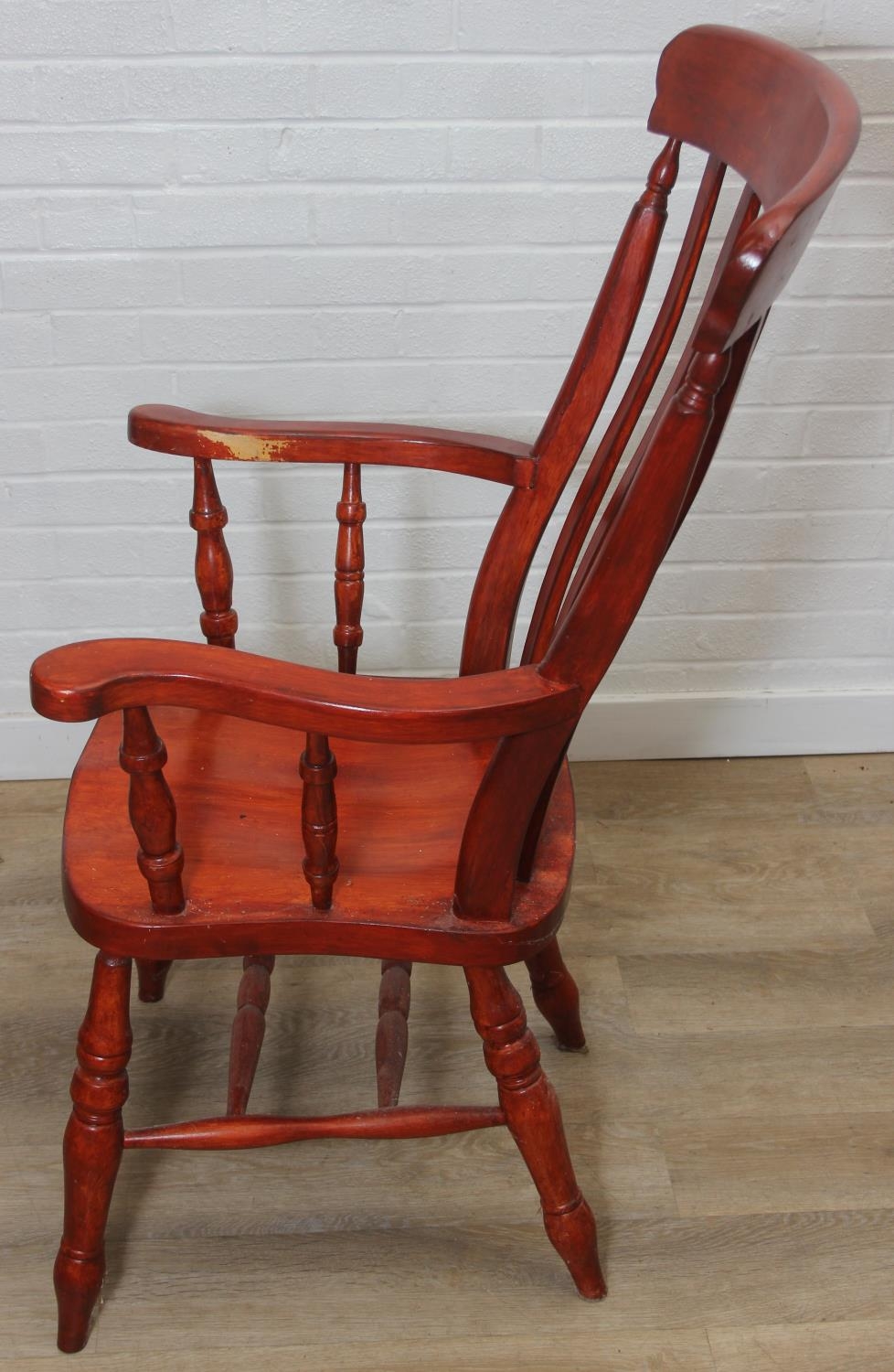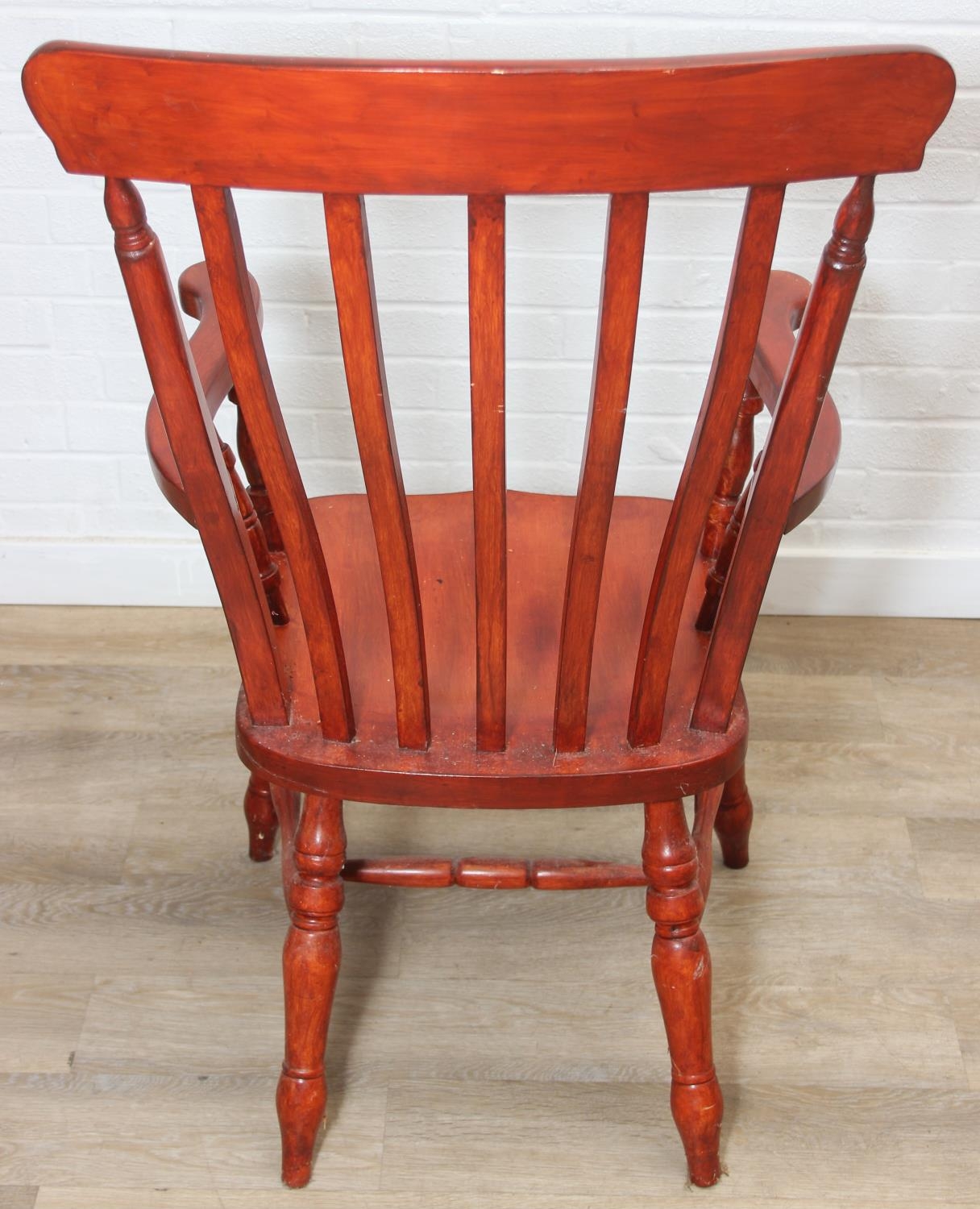 An antique style stained wooden slat-back Windsor farmhouse armchair, 62cm wide x 118cm tall