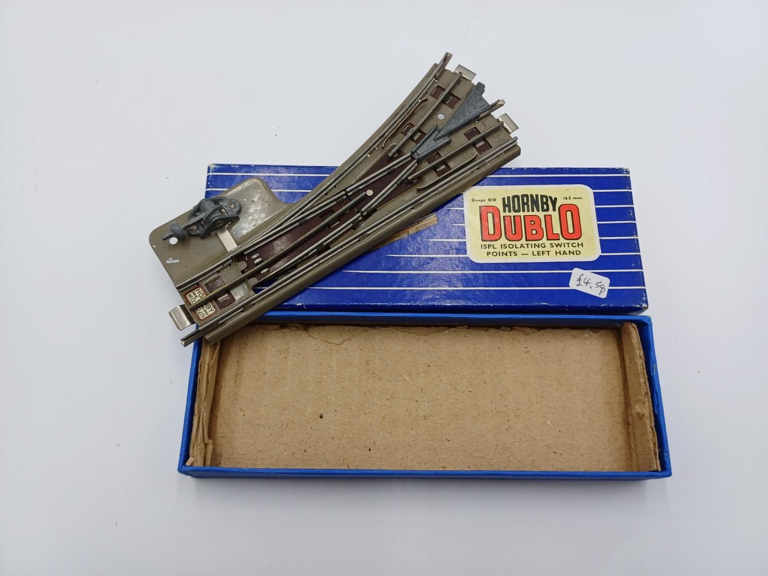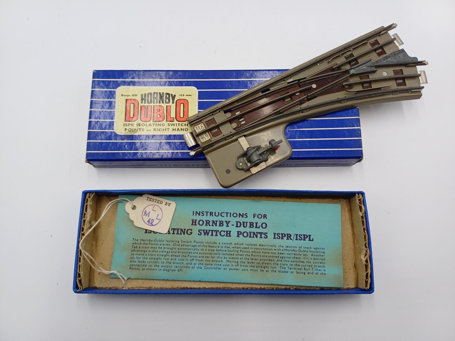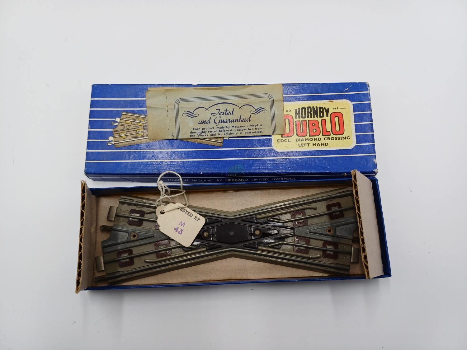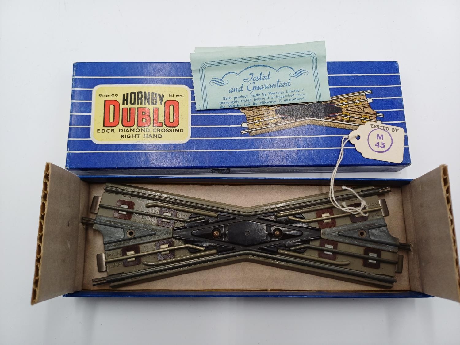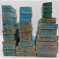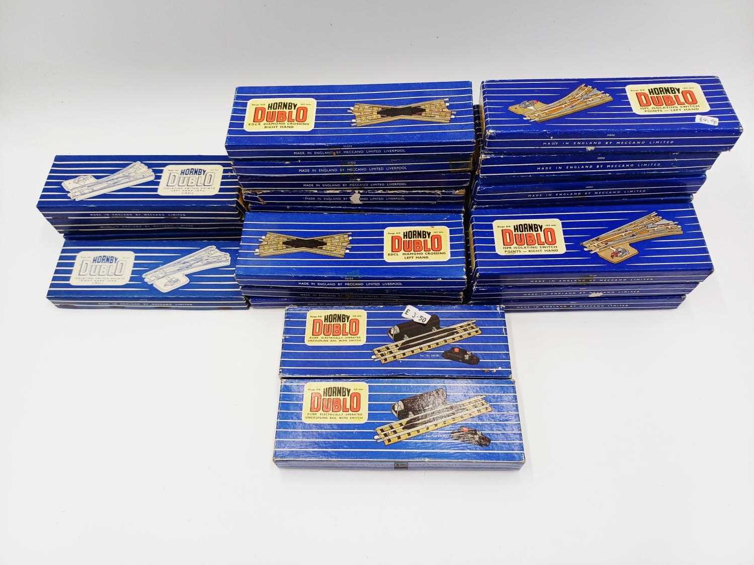Twenty six boxed Hornby Dublo 00 gauge model railway track accessories, three EDCL diamond crossing lefthand, five EDCR diamond crossing righthand, two EUBR electrically operated uncoupling rail with switch, two EDCR diamond crossing righthand, nine ISPL isolating switch points - lefthand and four ISPR isolating switch points - righthand