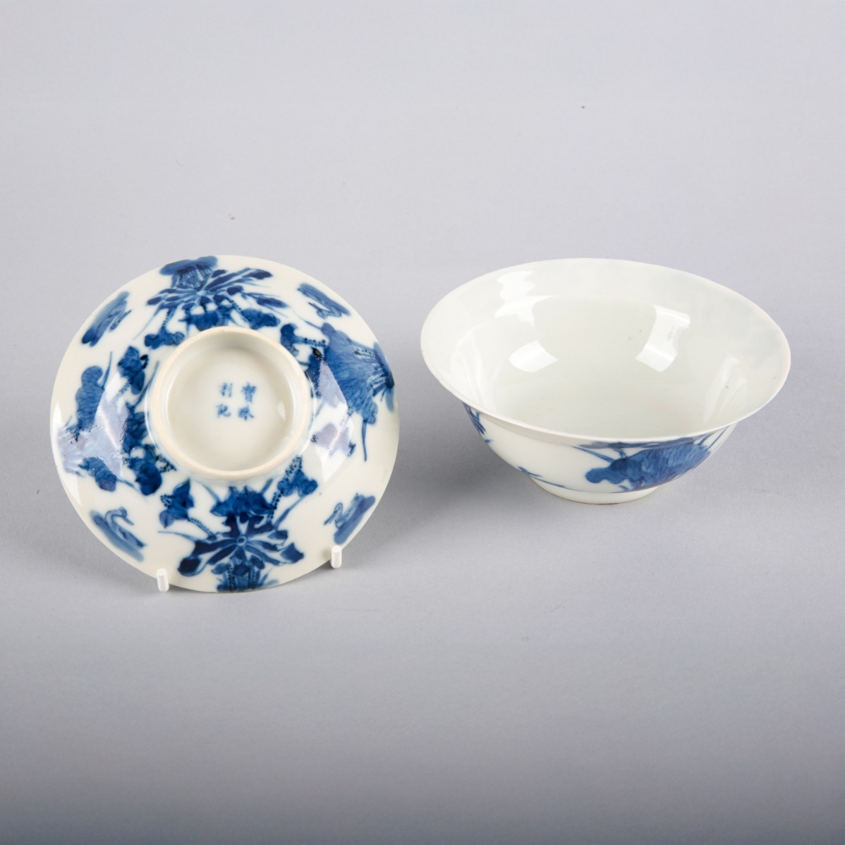 bearing four character marks to the bowls and covers, late Qing dynasty, decorated with ducks swimming amongst lotus flowers, 8cm high x 13cm diameter (8)