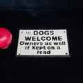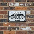 A humorous wall mounted cast metal sign reading "Dogs Welcome Owners as well if kept on a lead".